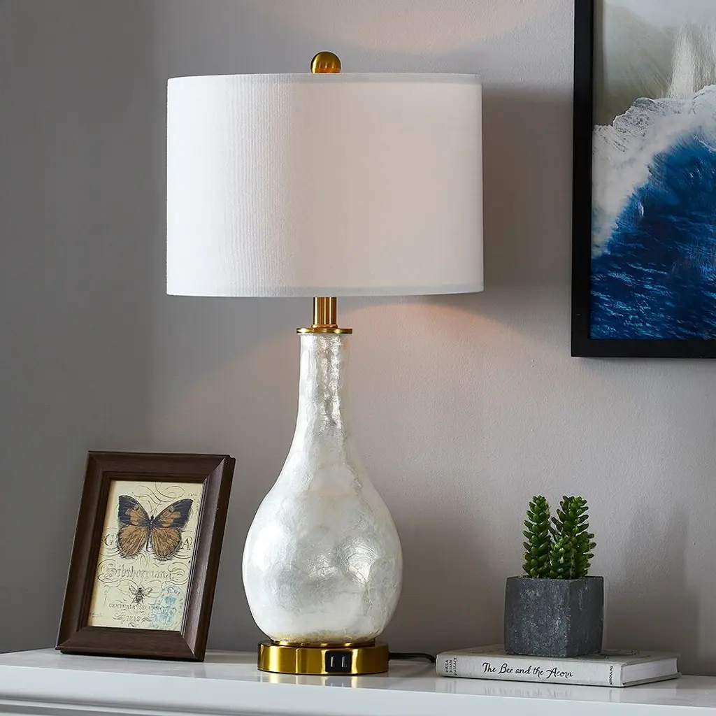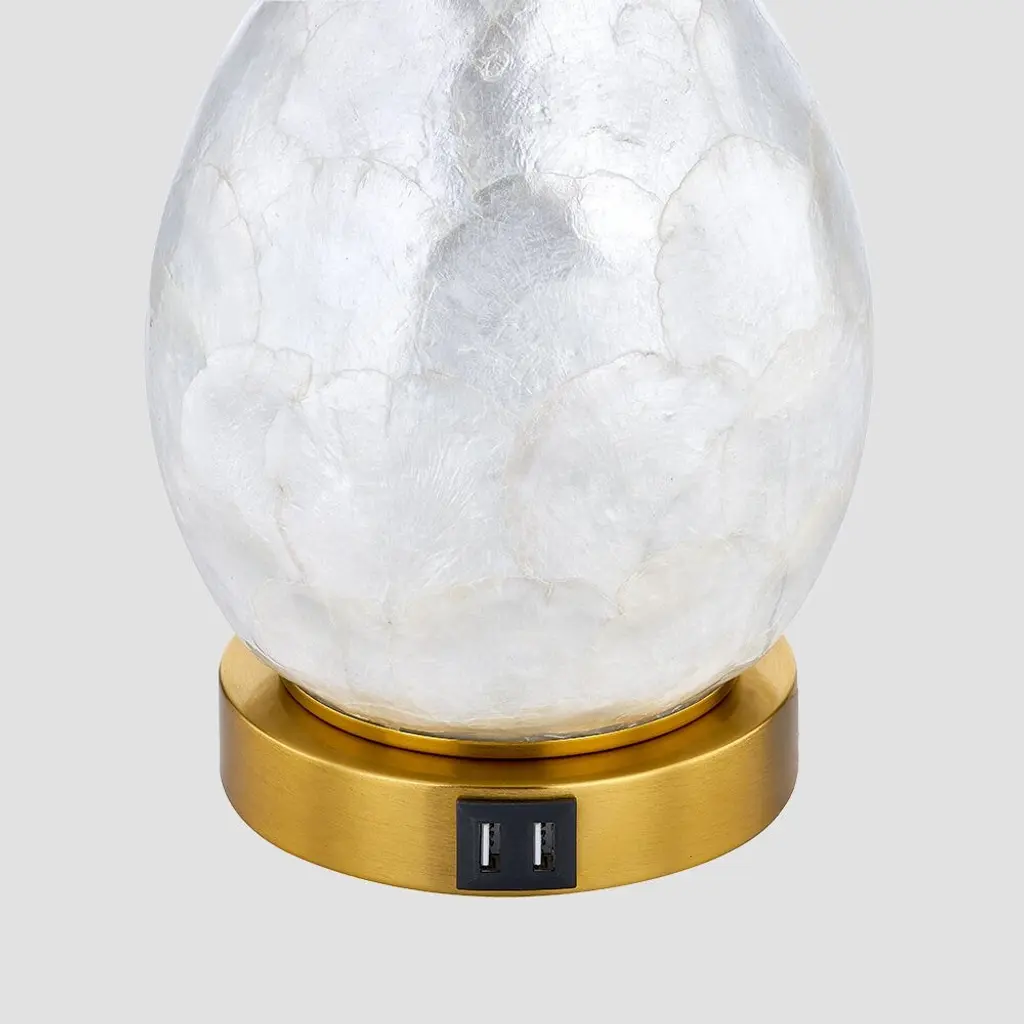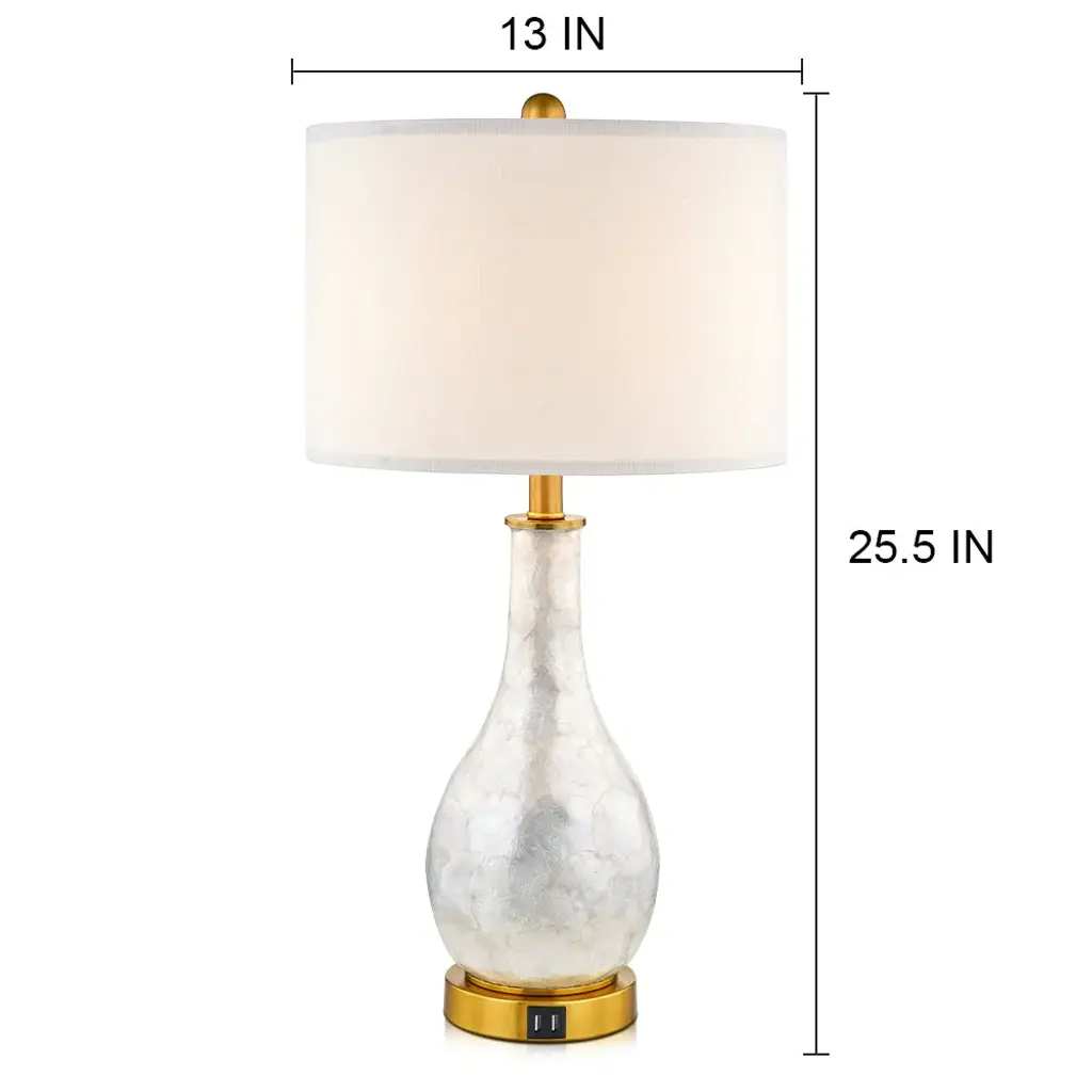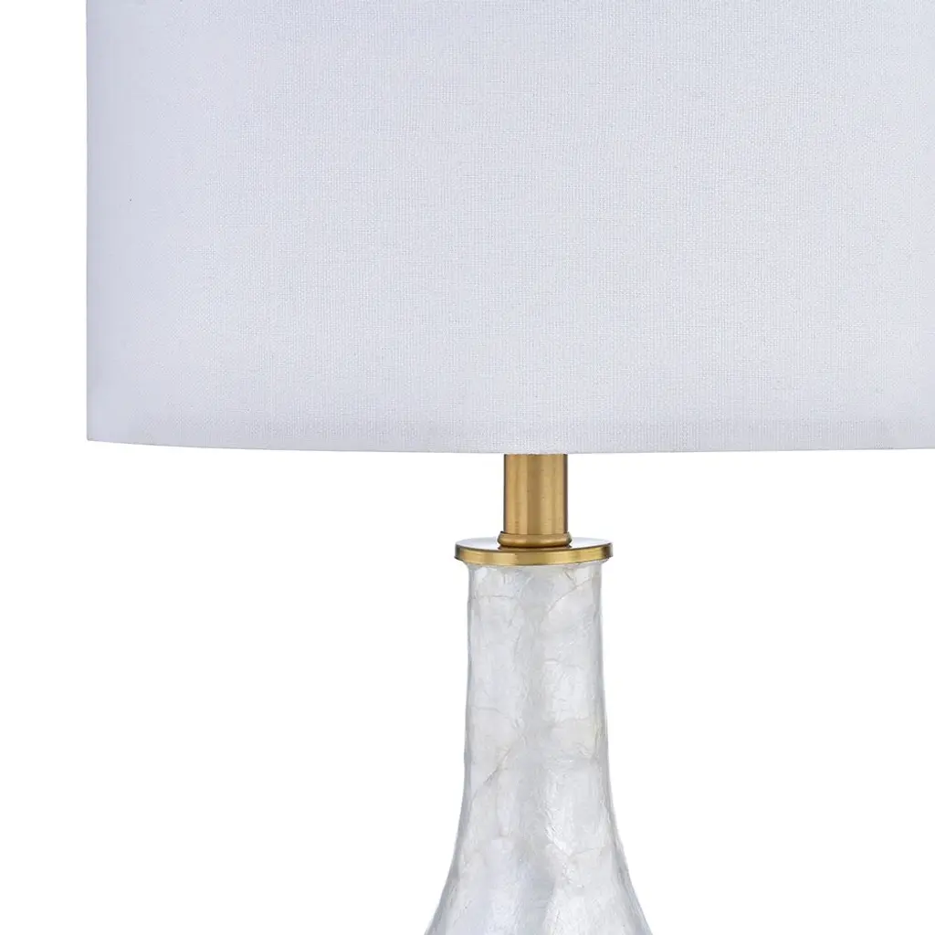 White graceful seashell table lamps. Modern sophistication meets the gentle allure of nature. They are not just lamps, they are a symphony of elegance and practicality, designed to enhance your living space. The table lamps apart is their exquisite lamp body, meticulously crafted from natural shell. This exceptional material brings a touch of the outdoors inside your home, casting a soft and soothing glow that infuses tranquility into your environment. The interplay of light and natural textures creates an atmosphere that is both relaxing and visually captivating. Assembling these lamps is a breeze, and they seamlessly fit into any room arrangement. Whether it's your bedroom, living area, or office space, the table Lamps effortlessly blend with your decor, elevating the ambiance with their presence. Adorned with premium linen lampshade, these table lamps exude style and elegance. The pristine white lampshades feature built-in insulation, ensuring a comfortable visual experience while diffusing light tenderly. Bid farewell to eye fatigue as these lamps bestow a gentle radiance that's as kind to your eyes as it is enchanting to your space. These lamps resonate with a unique and stylish artistic aura, infusing your living space with a rustic, nature-inspired charm. Let your home be adorned by these decorative art pieces, a harmonious fusion of light and nature that evokes a sense of tranquility and the beauty of the great outdoors.Overview of features:
