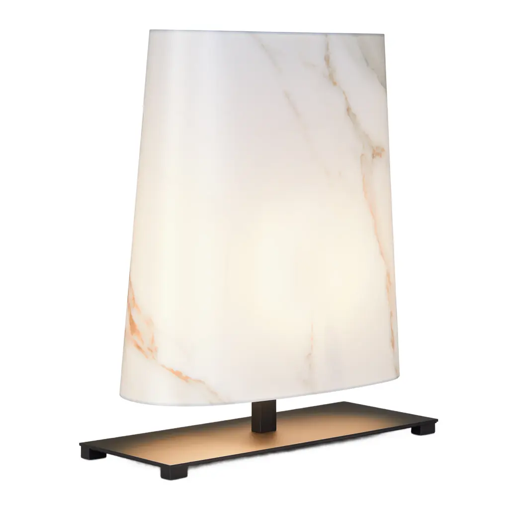 Introducing the Ovale table lamp by Contardi. A sophisticated reinterpretation of the timeless Rettangola light, featuring an oval base for a modern touch. Choose from white cotton or Calacatta marble printed fabric lampshades, with the option to customize with colored trimmings. Elevate your space with sleek and up-to-date design.
