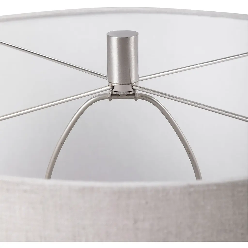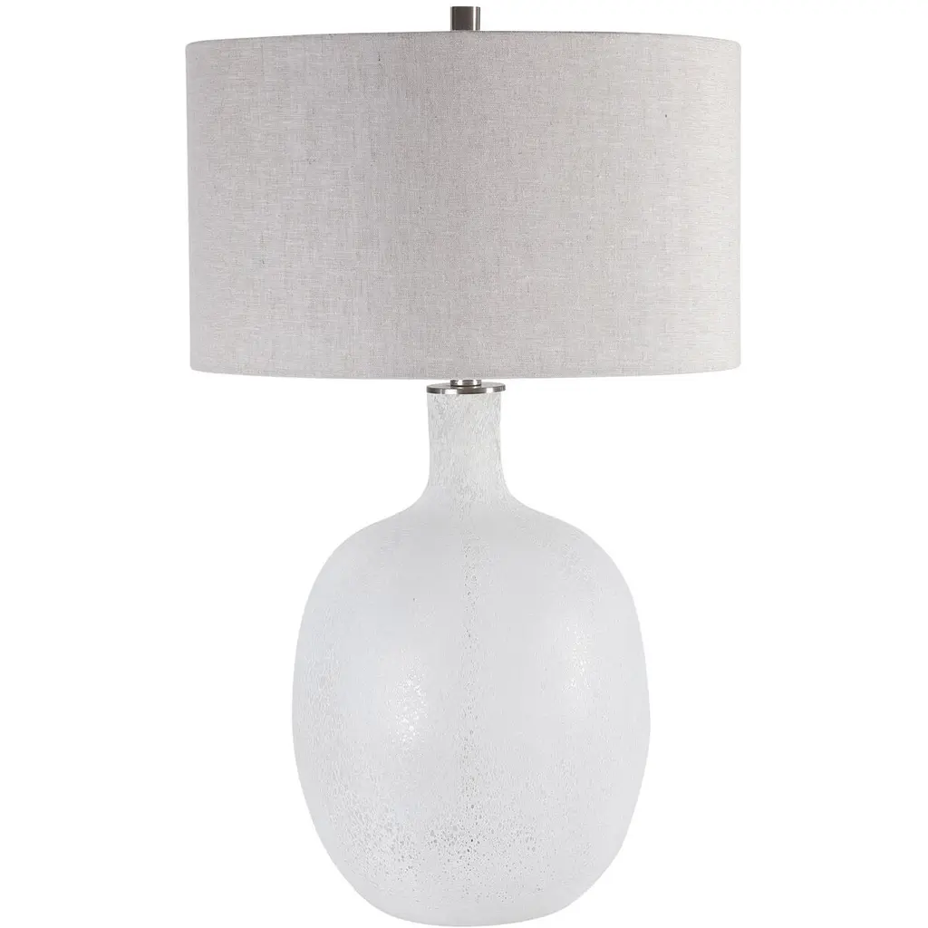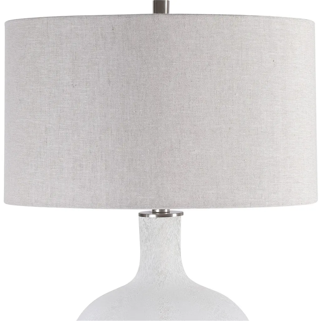 Beautiful And Functional, This Table Lamp Features A Glass Base Finished In A Heavily Textured, Mottled Aged White, Accented By Brushed Nickel Plated Details. The Round Hardback Drum Shade Is A Light Oatmeal Linen Fabric With Natural Slubbing.