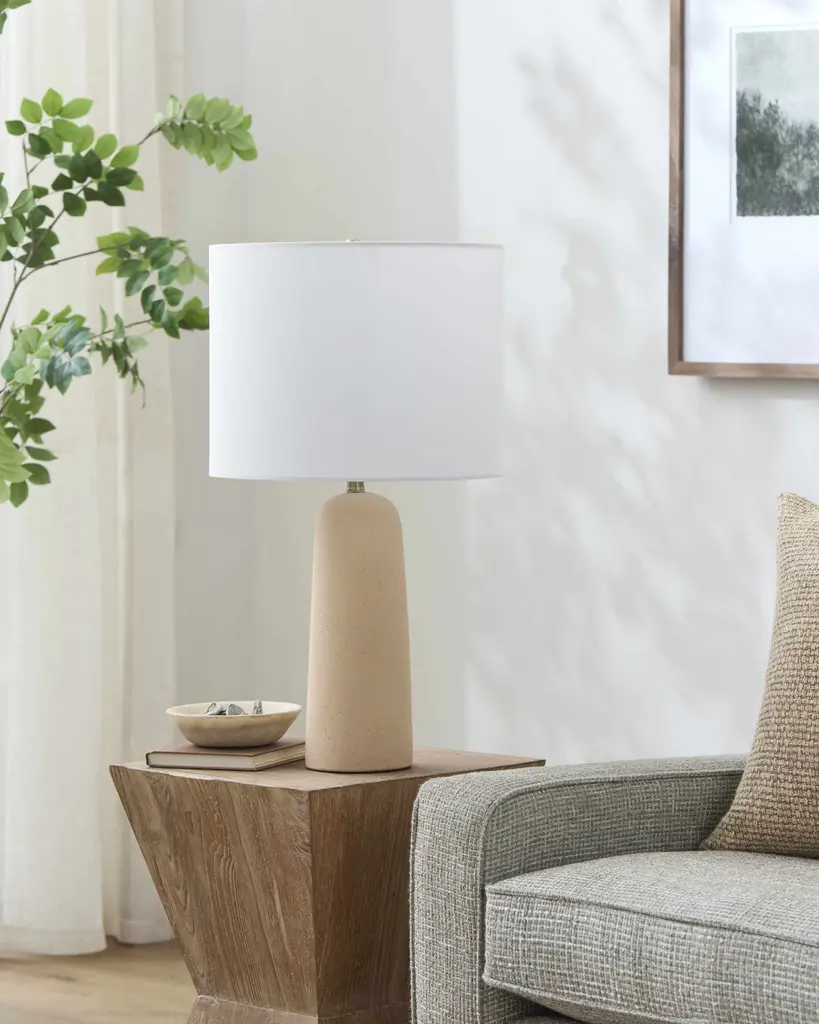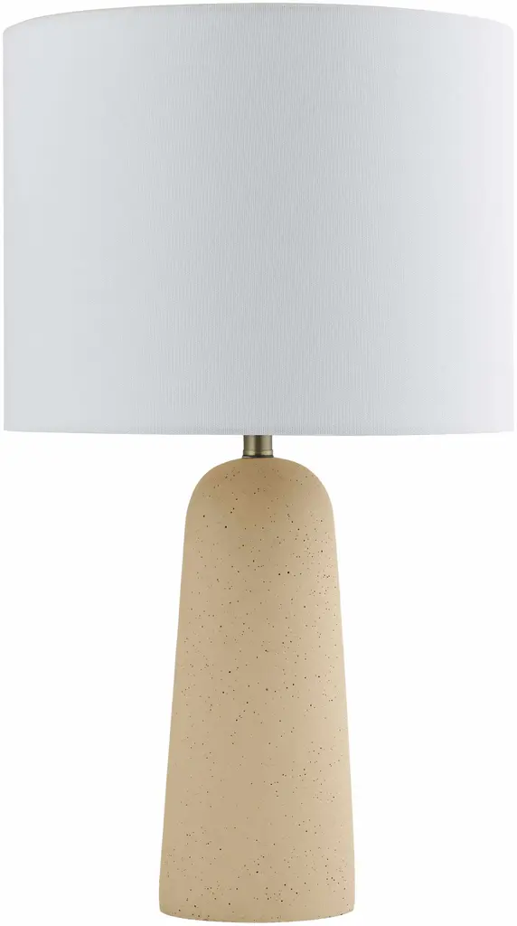 Collection: Wielsbeke Colors: Beige, White, Metallic - Brass, Translucent Material: Body: Concrete / Shade (Outside): Linen / Shade (Inside): Polyester / Finial: Iron Styles: Traditional Made In: China Lighting Type: Accent Table Lighting Shade Material: Linen, Polyester Shade Color: White, Beige Cord Length: 6' Switch Type: On/Off Number of Bulbs: 1 Socket Type: E-26 Bulb Wattage: 100W
