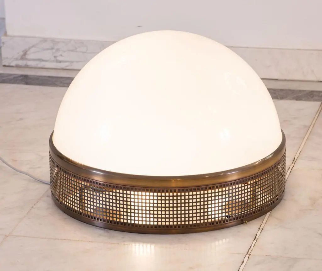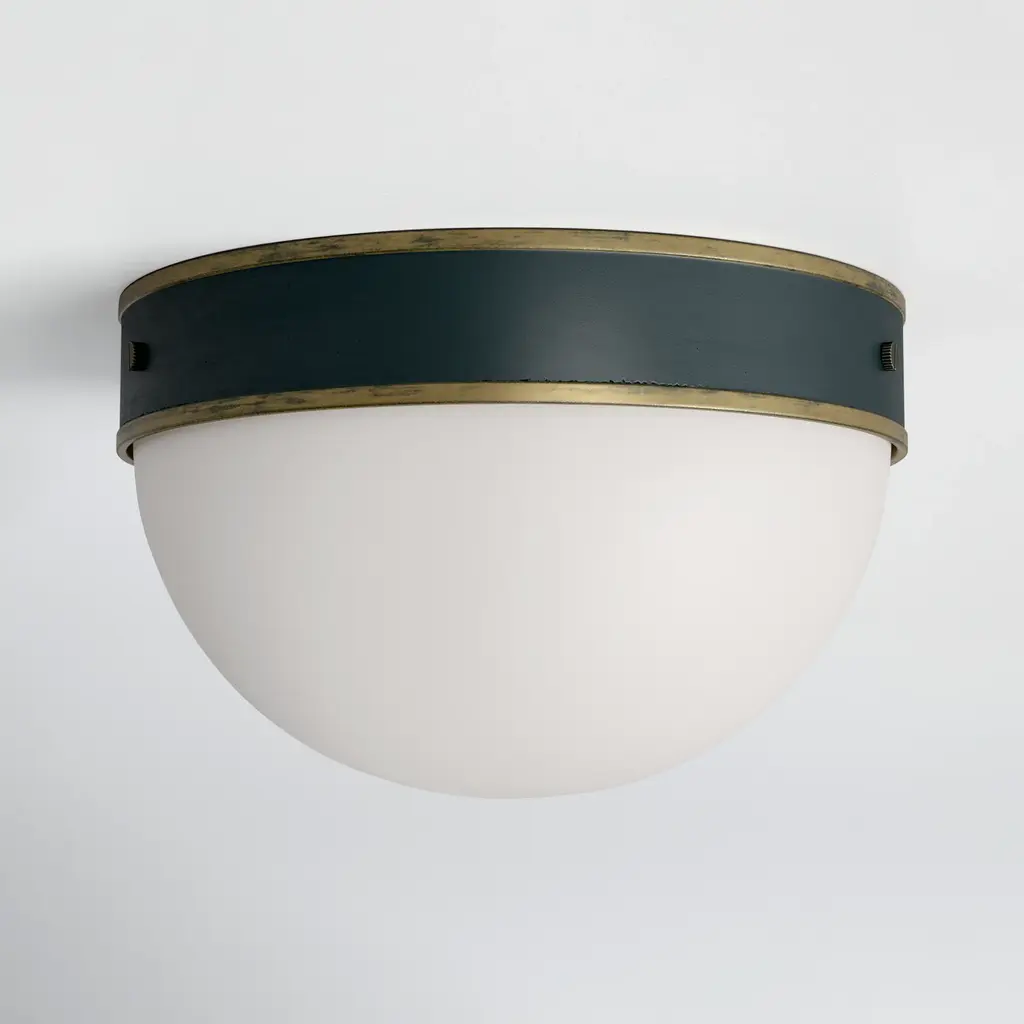 Very elegant flush-mounted ceiling-lamp, light comes out and makes wonderful pattern on the ceiling. This lamp is as well available in a smaller Version ø: 35 cm (13.78 inch) Totally handcrafted in Vienna.Most components according to the UL regulations, with an additional charge we will UL-list and label our fixtures. Brass, optionally varnished or nickel-plated, all other surfaces on request, Opaline-glass, hand blown.