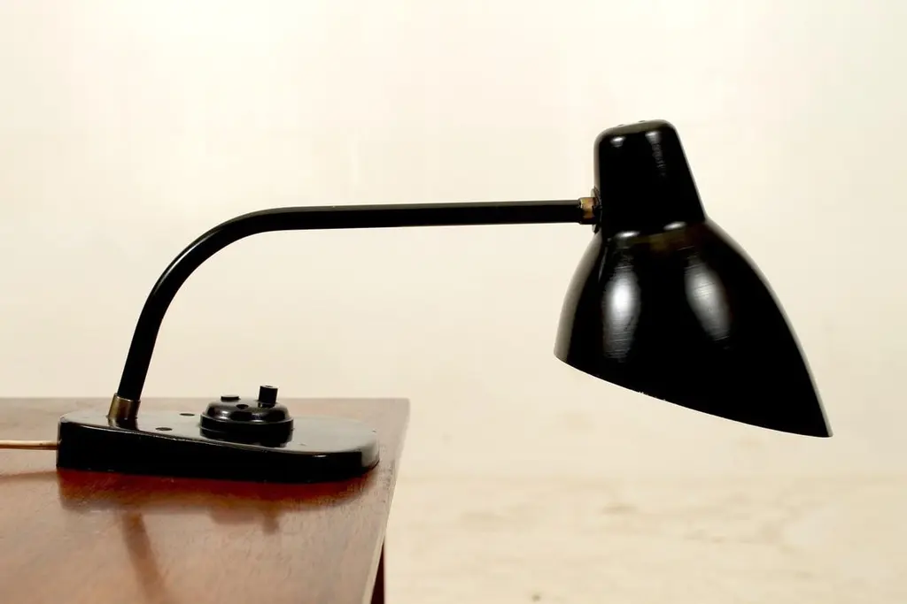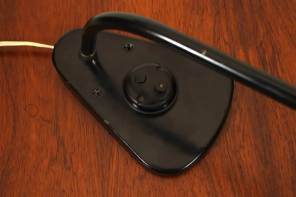 VILHELM LAURITZEN - VARIOUSDESIGNER: Vilhelm LauritzenMANUFACTURER: Louis PoulsenMATERIALS: MetalCONDITION: Good restored conditionDIMENSIONS: W. 7 cm. H. 19 cm. D. 43 cm.REMARKS:Vilhelm Lauritzen (1894-1984) for Louis Poulsen: Rare "Conductor" / "DSB" desk lamp in black lacquered metal, The 1950s Foot with through holes for fixed mounting on counter/table. Mounted with double switch in bakelite. Later repainted