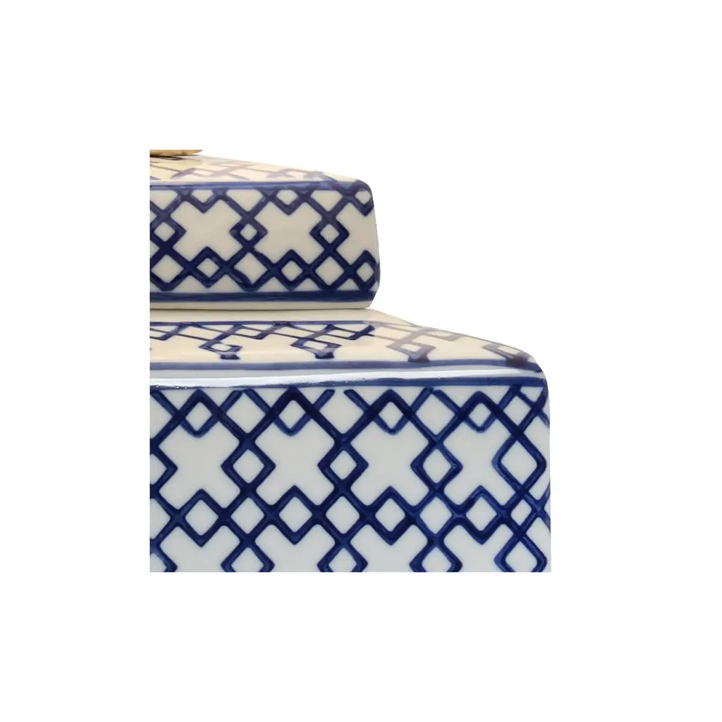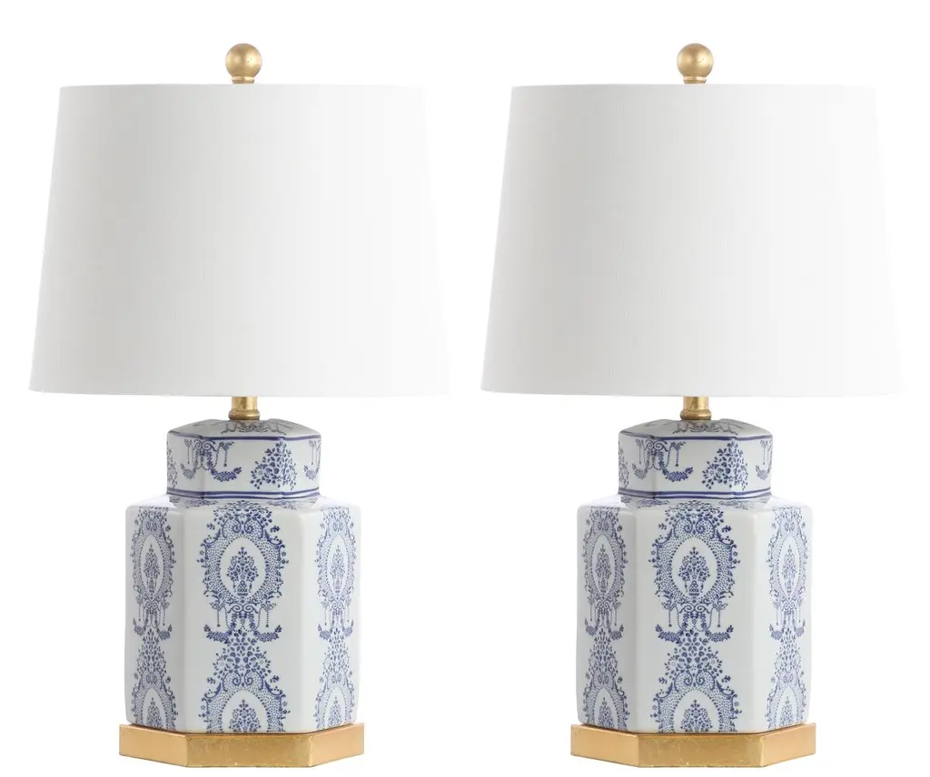 MAMIE LAMP - BLUE. BLUE AND WHITE PORCELAIN WITH BLACK MOUNTING