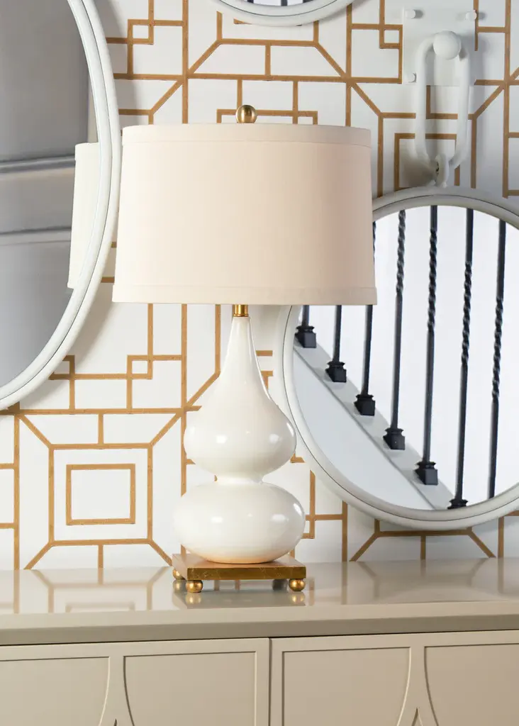 The Whitney lamp by Wildwood Lighting features a double gourd ceramic silhouette. Finished with a colorful glaze and topped on a gold leaf mount, this lamp is sure to be a head turner in any room! Available in dark autumn orange, cadet blue, toad green, or snow white. Overall Dimensions: 7W x 7D x 28H Materials: Ceramic Bulb Count: 1 Wattage: 100 Switch Type: 3-Way Shade Dimensions: top(14) bottom(15) side(10) Shade Color: OFF WHITE Fabric: LINEN Weight: 13.00 lbs Ships within 3 business days via FedEx Free Shipping in the U.S.