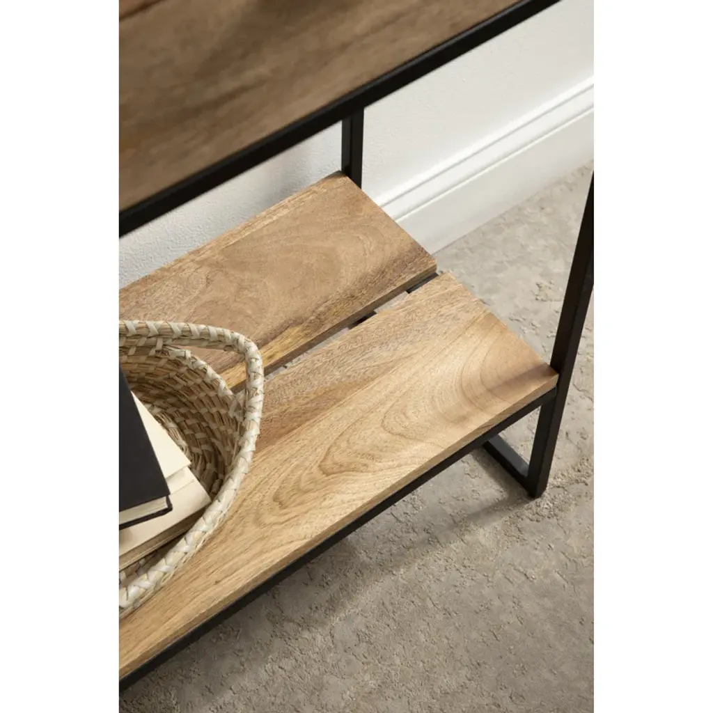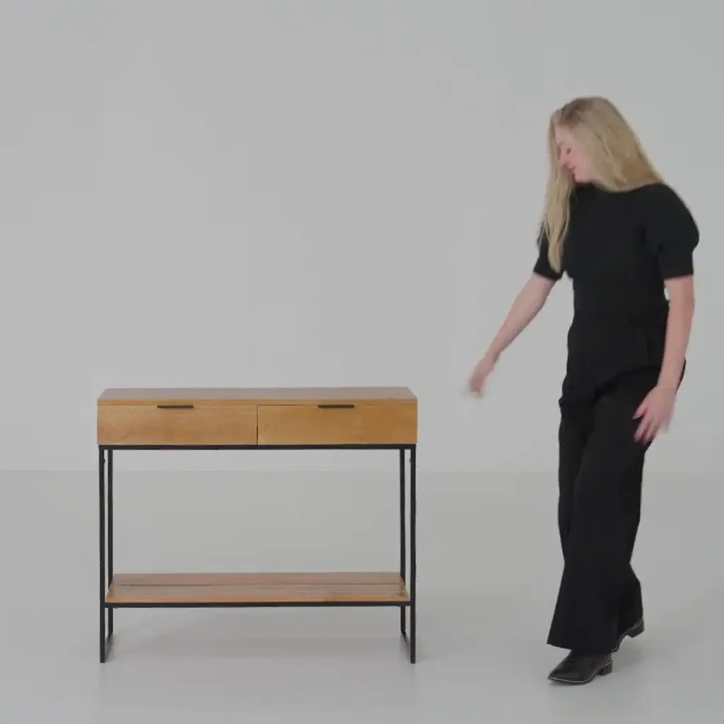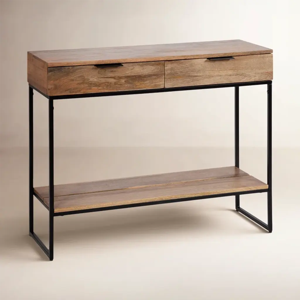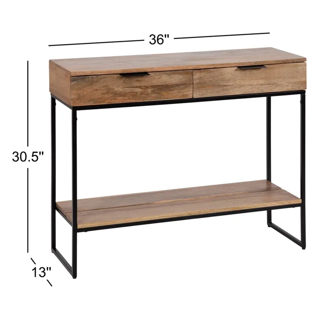 This console table features a mix of materials and clean lines, making it a versatile addition to your entryway or living room. The table top is crafted from solid mango wood, showcasing a rich brown hue and the natural wood grain color variation for a rustic, industrial look. Its black metal base features sled legs that keep sightlines clear. Two drawers provide storage for keys, mail, or small essentials, while the lower shelf offers space for displaying decorative items. Plus, the surface is ideal for displaying a small table lamp and succulents.