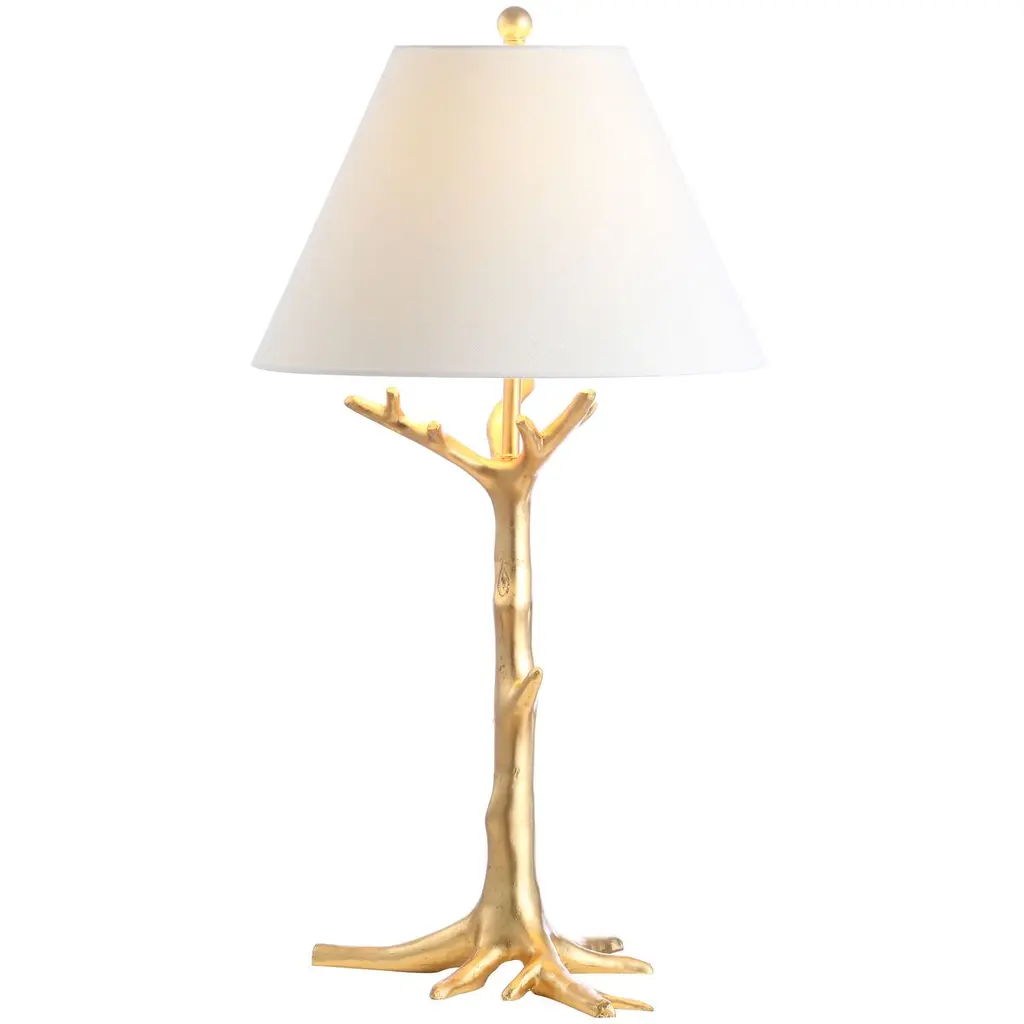 Though faux bois—literally, "fake wood"—has never fallen out of fashion, it's coming to the forefront of style once again. This tree-shape table lamp gleams with a gold-leaf finish that highlights its striking design. The linen drum shade is a refined finishing touch.