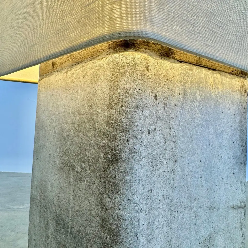 Stunning concrete Willy Guhl lamp by Eternit with teak top cover. Concrete made in Swizterland. Newly fitted as a lamp, re-wired with a new custom linen shade with rounded edges and light diffusor on top. Stunning simplicity and beautiful texture make these lamps perfect for any room. Gorgeous piece of collectible design. Two available. Priced individually. Other Guhl lamps in separate listings.