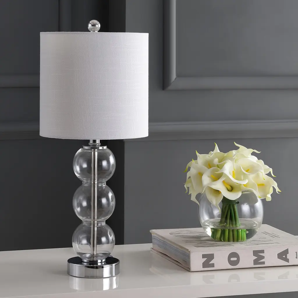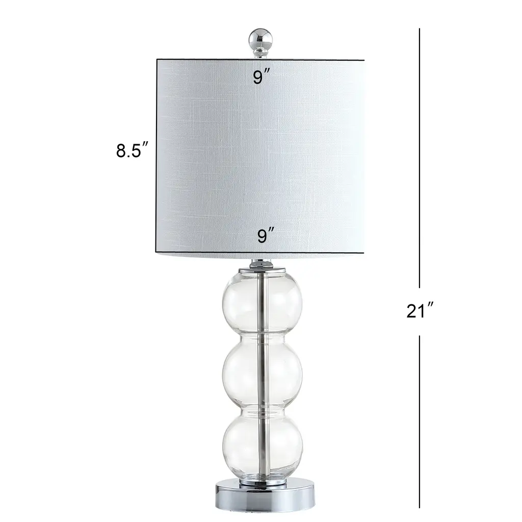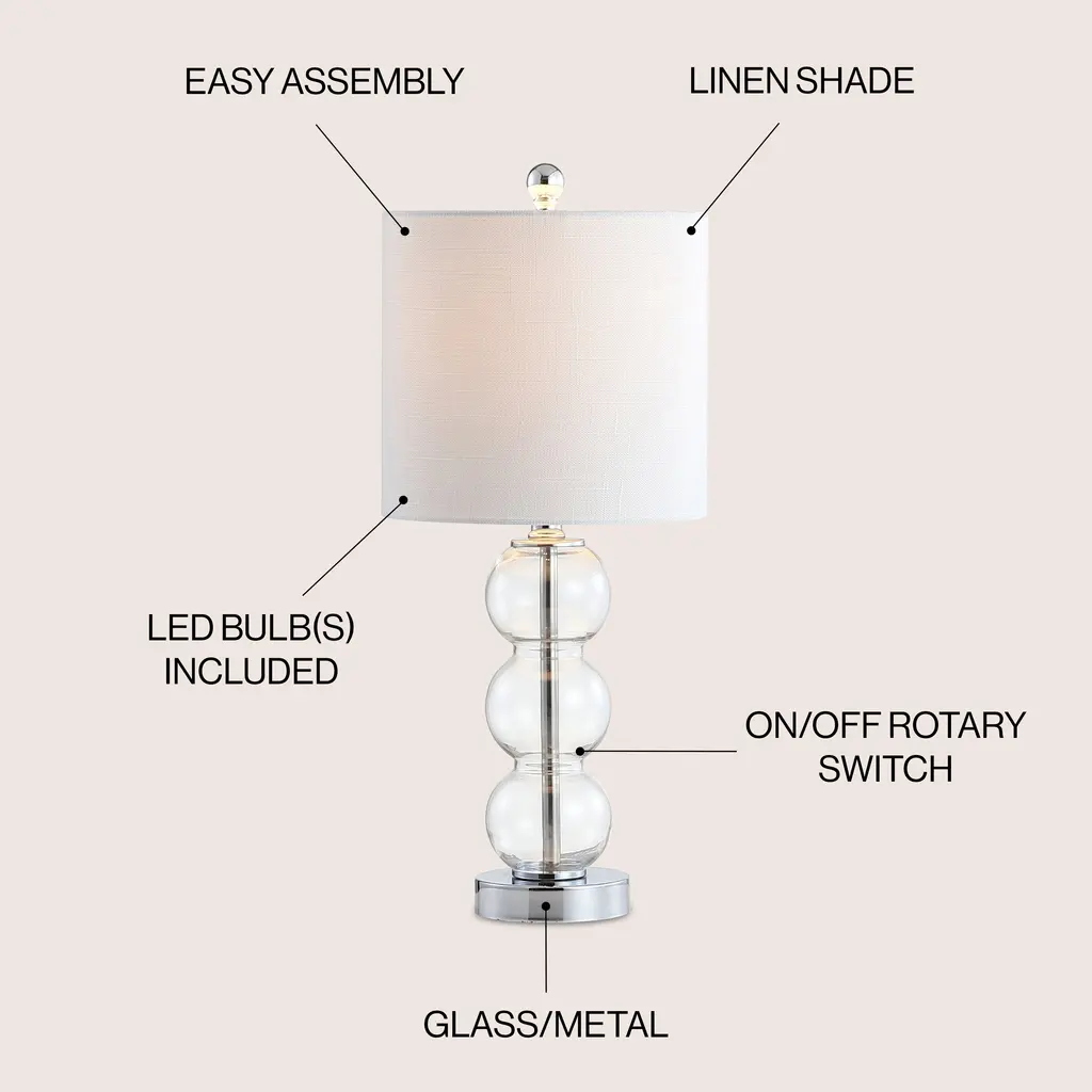 Add a touch of Art-Deco elegance to your decor with this Wilson 21" Glass/Metal LED Table Lamp by JONATHAN Y. The stacked sphere glass design and brass gold hardware are sure to make a statement in any space. The lampshade is made of 100% cotton and the lamp takes one maximum 40-watt or equivalent bulb (one eco-friendly 4W LED bulb included). With an on-off rotary switch on the socket and minor assembly required, this UL Listed lamp is both stylish and practical.Features:Dimensions:About us: