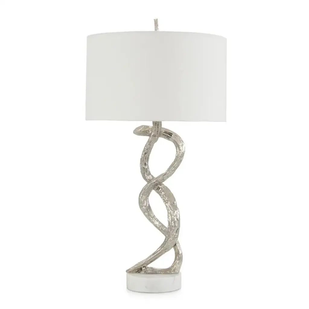 The Windswept Table Lamp showcases a sculptural nickel body reminiscent of entwined vines which sits on top of a white marble base and hardware finished in nickel.