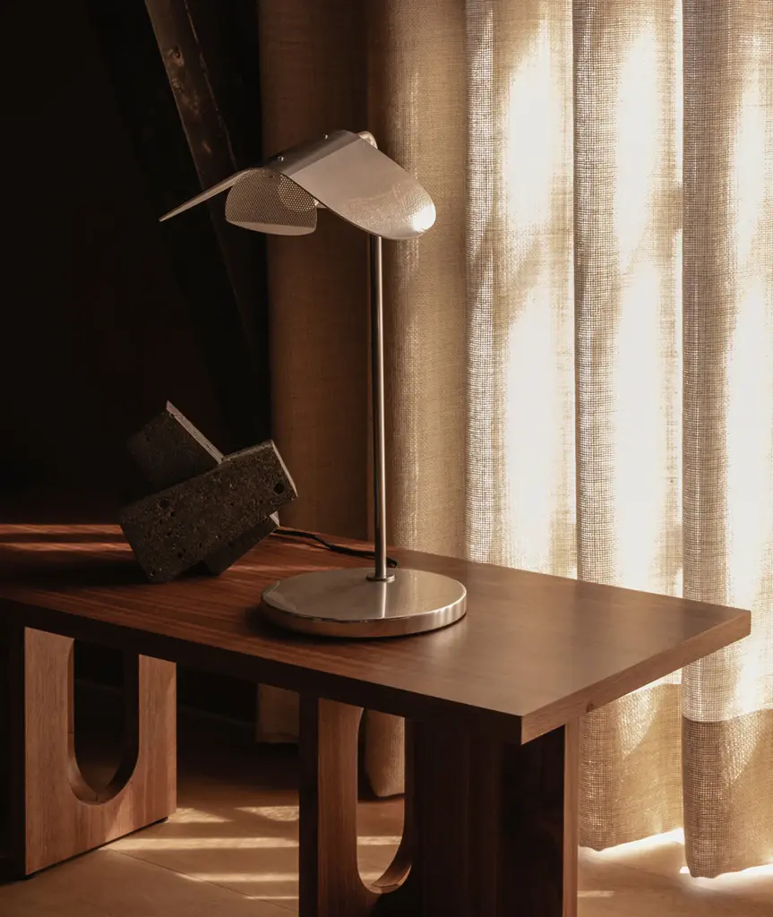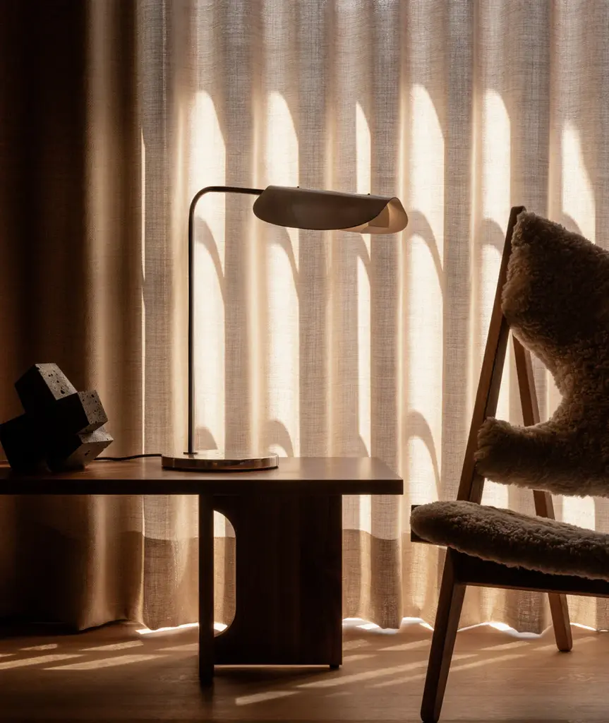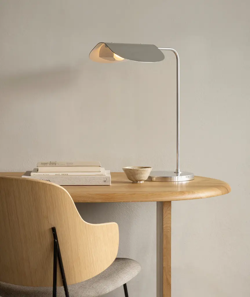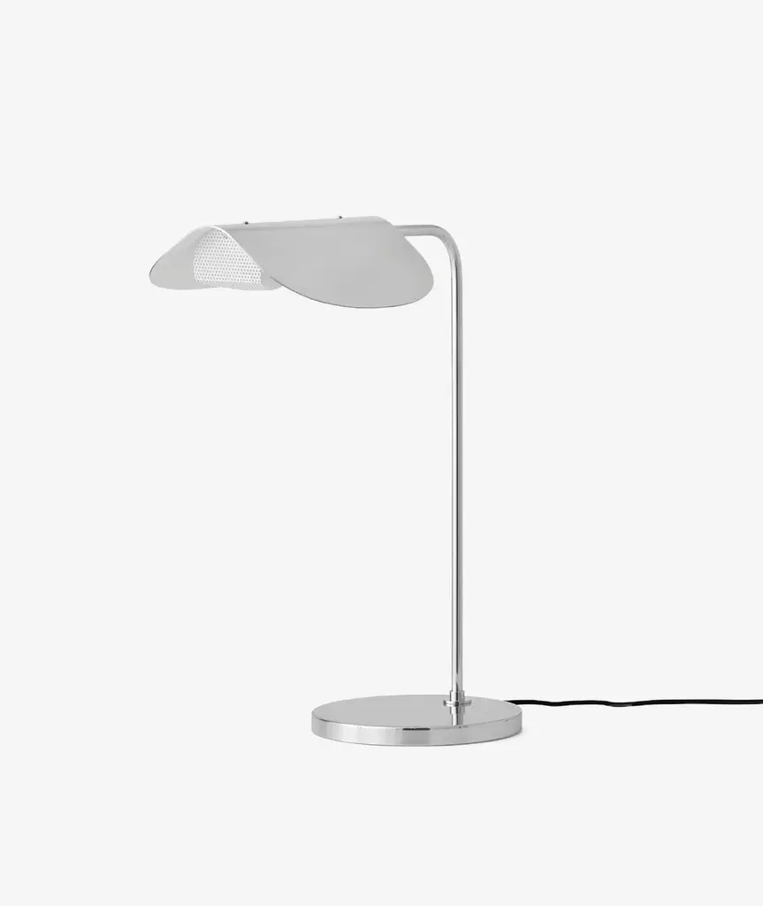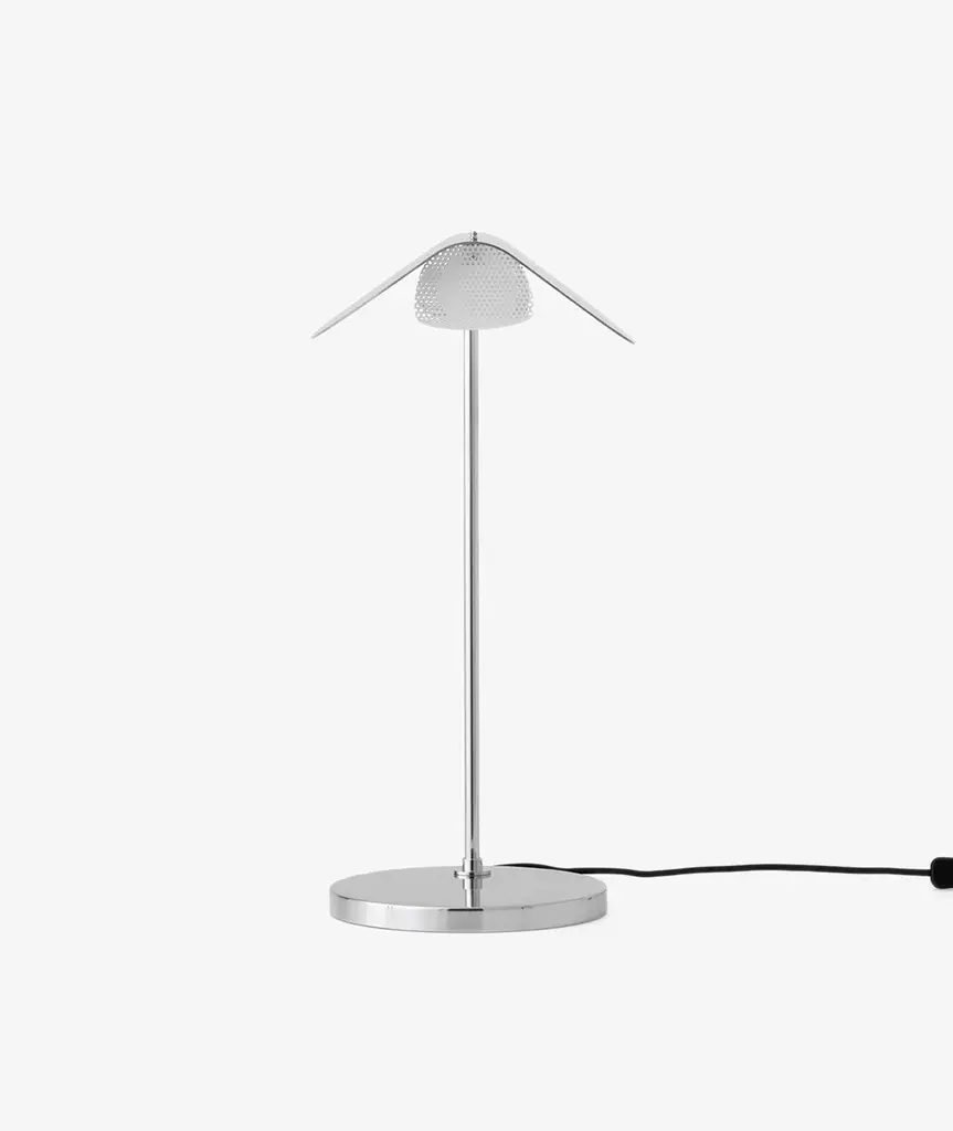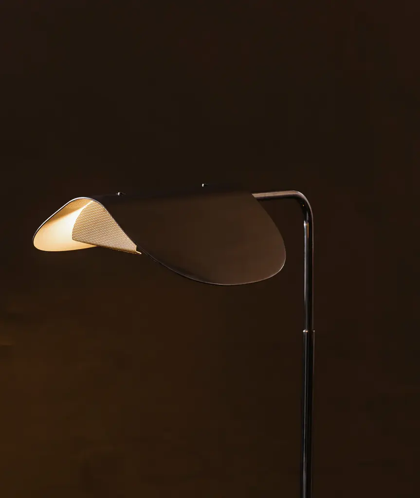 The Wing Table Lamp takes its name from its wing-like shade, reminiscent of a bird in flight. Imagined in the 1980s by Kenneth Bergenblad, the stringent design has a playful feel. The polished aluminum shade rotates to direct light where it is needed. A statement-making piece in any setting, its minimal aesthetic ensures it blends seamlessly into any décor style.