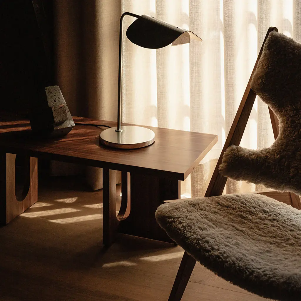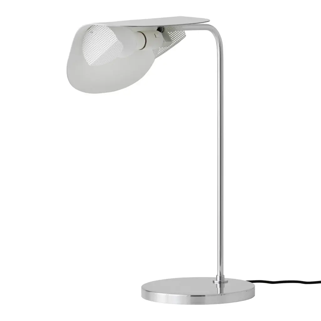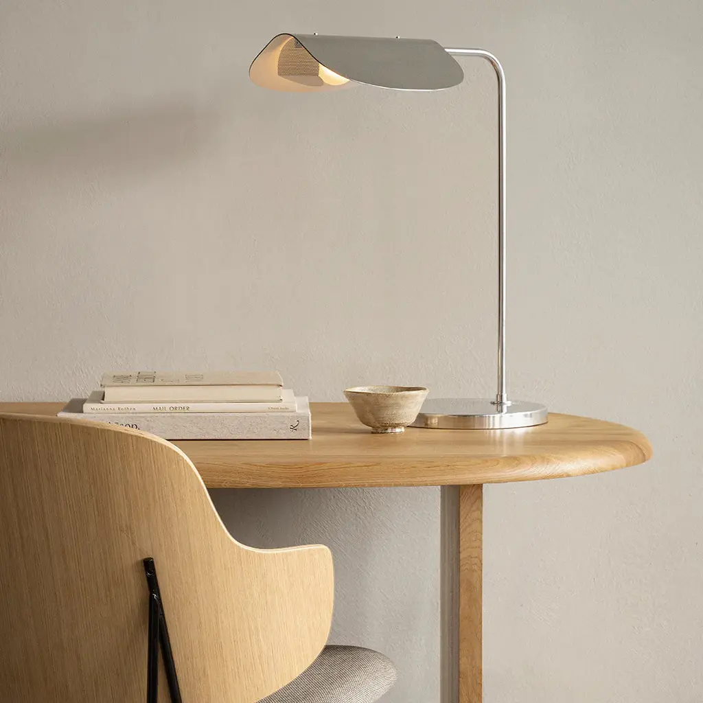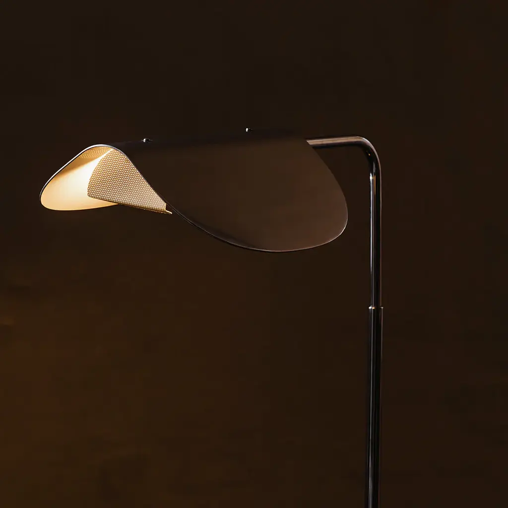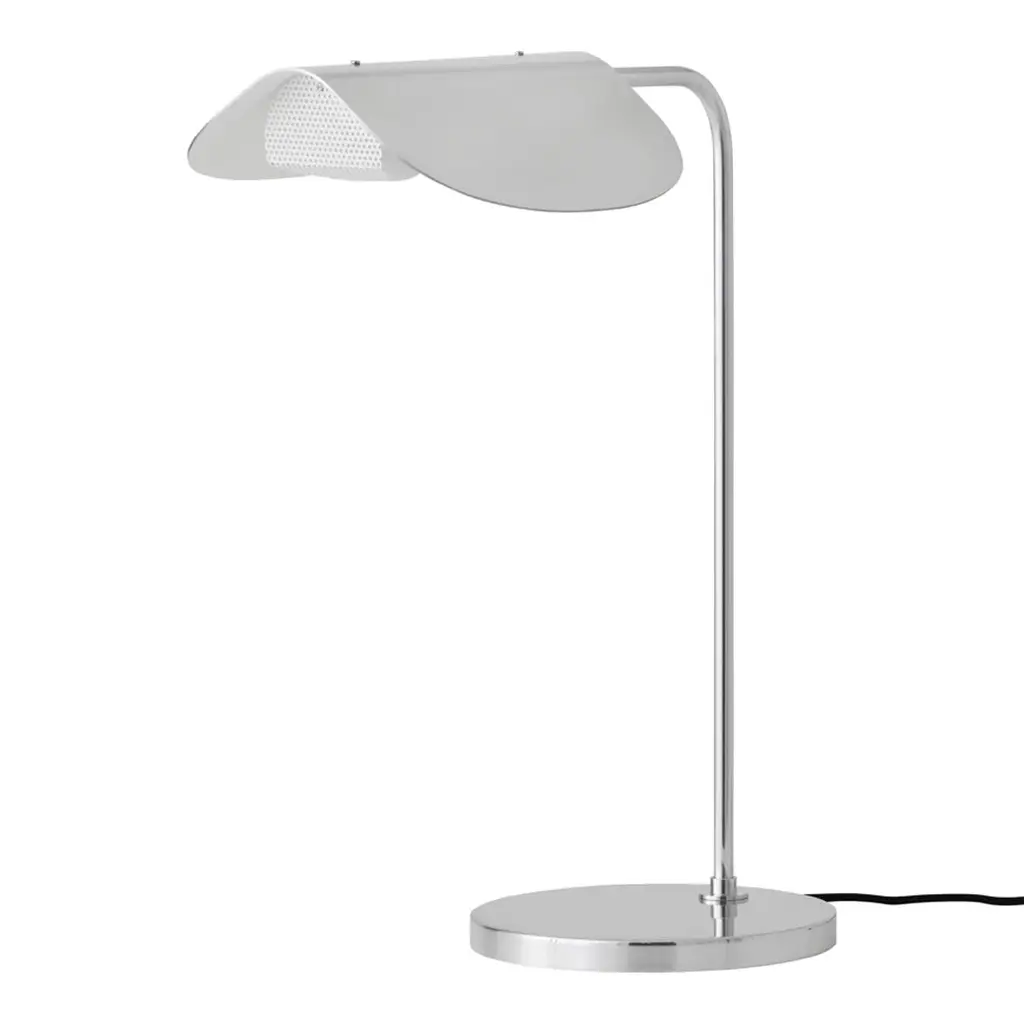The Wing Table Lamp takes its name from its wing-like shade, reminiscent of a bird in flight. Imagined in the 1980s by Kenneth Bergenblad, the stringent design has a playful feel. The polished aluminum shade rotates to direct light where it is needed. A statement-making piece in any setting, its minimal aesthetic ensures it blends seamlessly into any décor style.