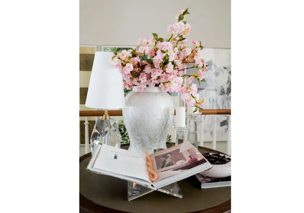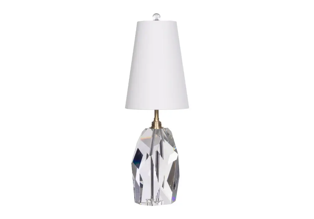 This lamp features a asymmetrical faceted solid K1 crystal base with brass hardware and a beautiful, delicate tall line. Its elongated tapered linen shade casts a bright glow, highlighting its eye-catching form. This lamp was personally selected for high quality and style by Jess Bennett.