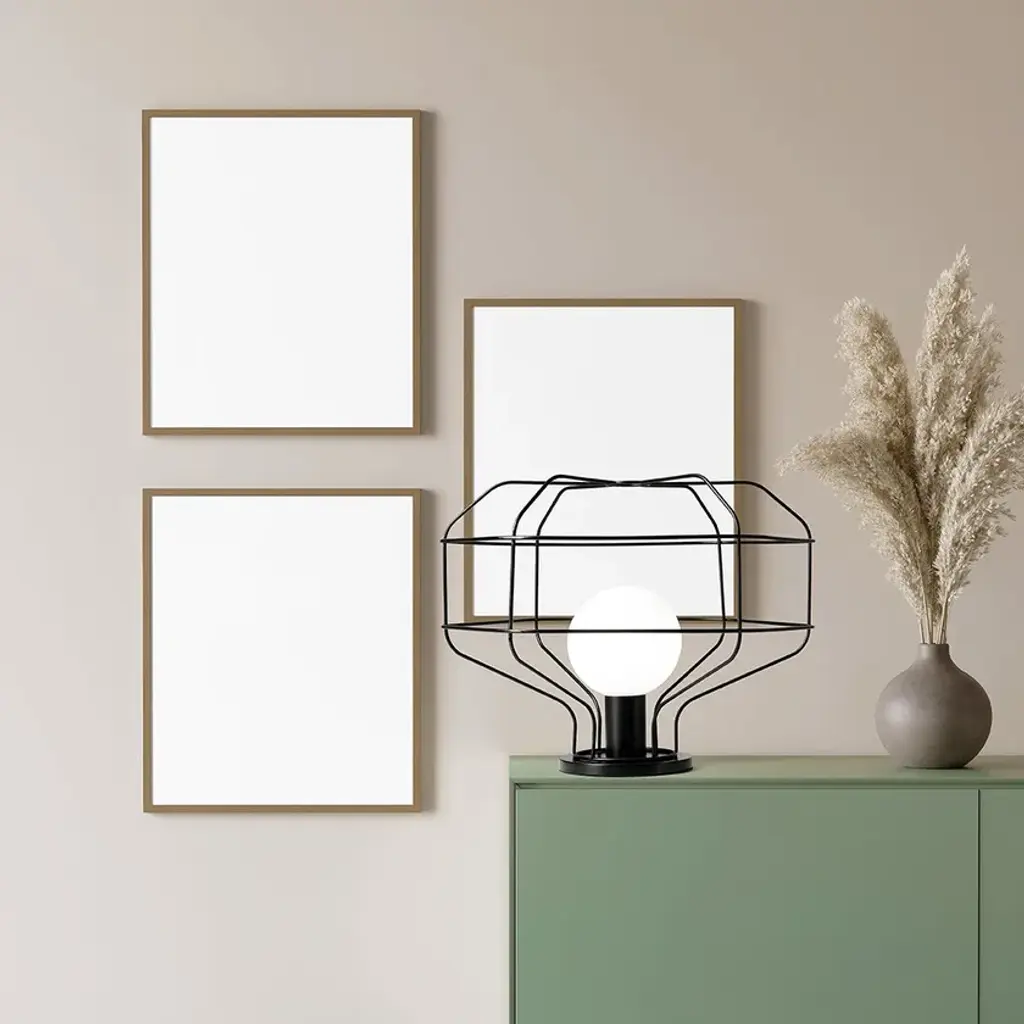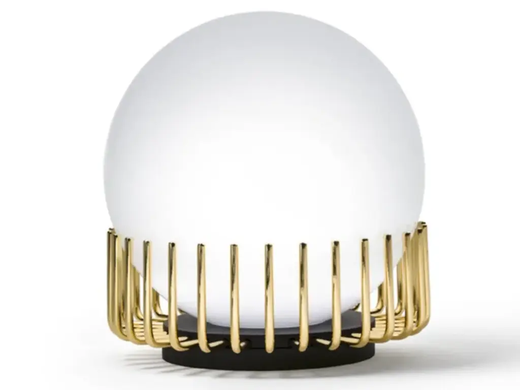 WIRE is a table lamp with metal rod frame, in brushed gold or matte black finish. Internal opal glass diffuser. Black 150 cm power supply cord. Compatible with dimmable G9 LED light bulbs. Source G9 LED DIMMABLE | Power 1 x max 10w