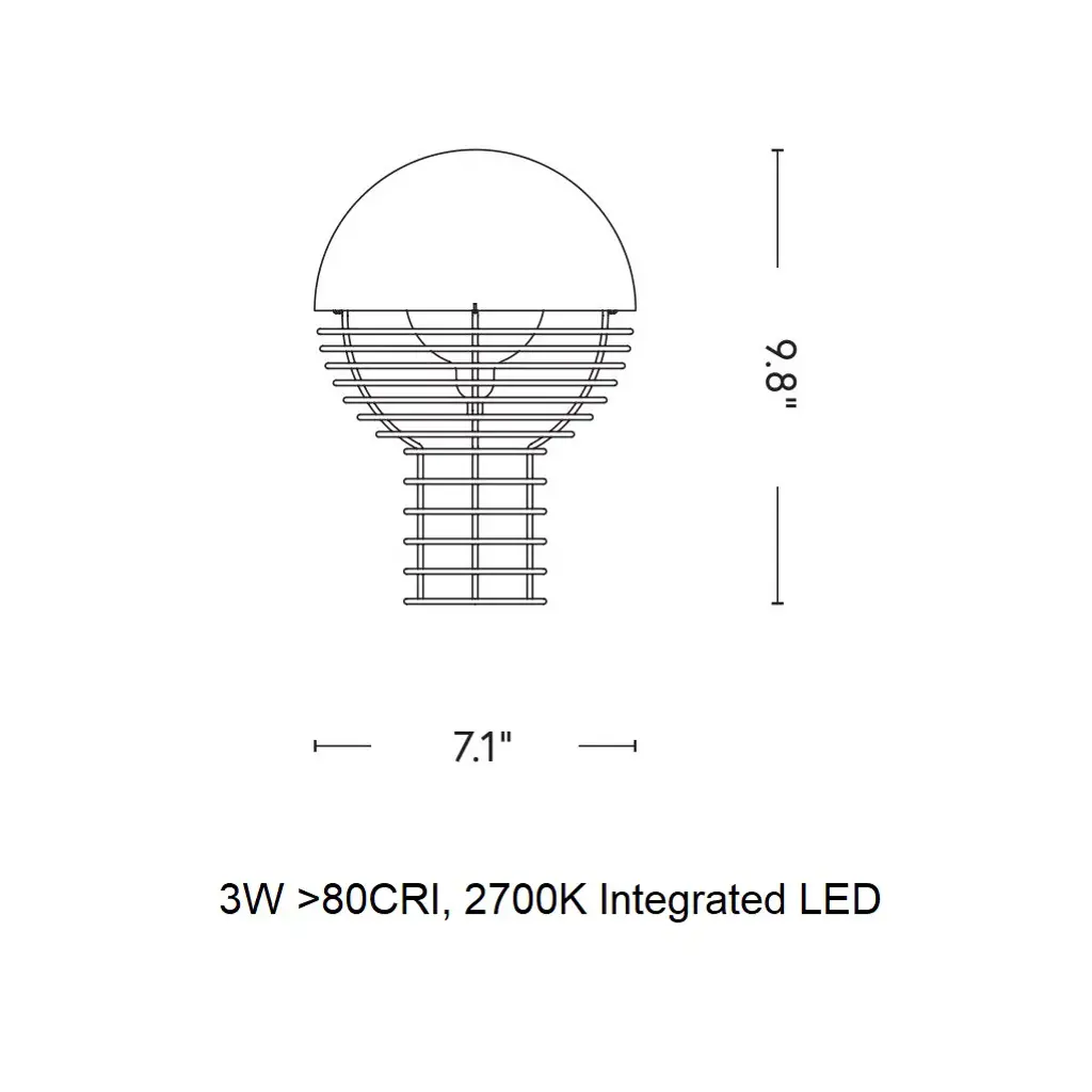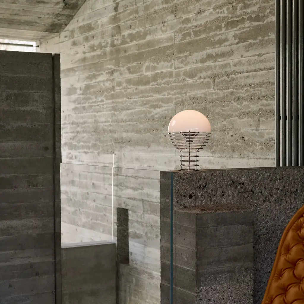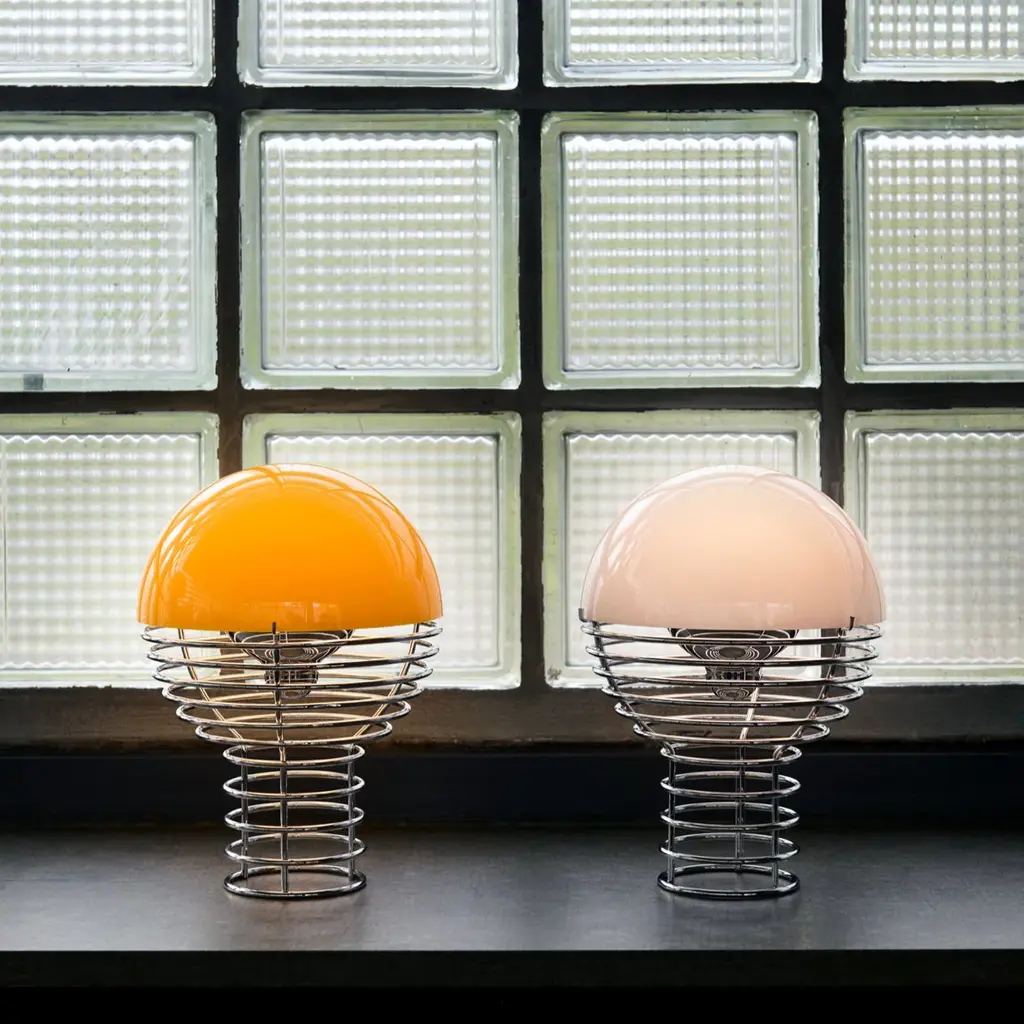 Verpan brings Verner Panton's iconic 1975 Wire Lamp into the contemporary era with this clever, portable edition. Capturing the original's sculptural spirit, this cordless version features the signature open wire frame and a luminous dome-like shade, delivering a soft, ambient glow. With the freedom to move anywhere, it brings a piece of Danish design history to any modern setting, whether used indoors or on a covered patio, for a touch of timeless style. Highlights