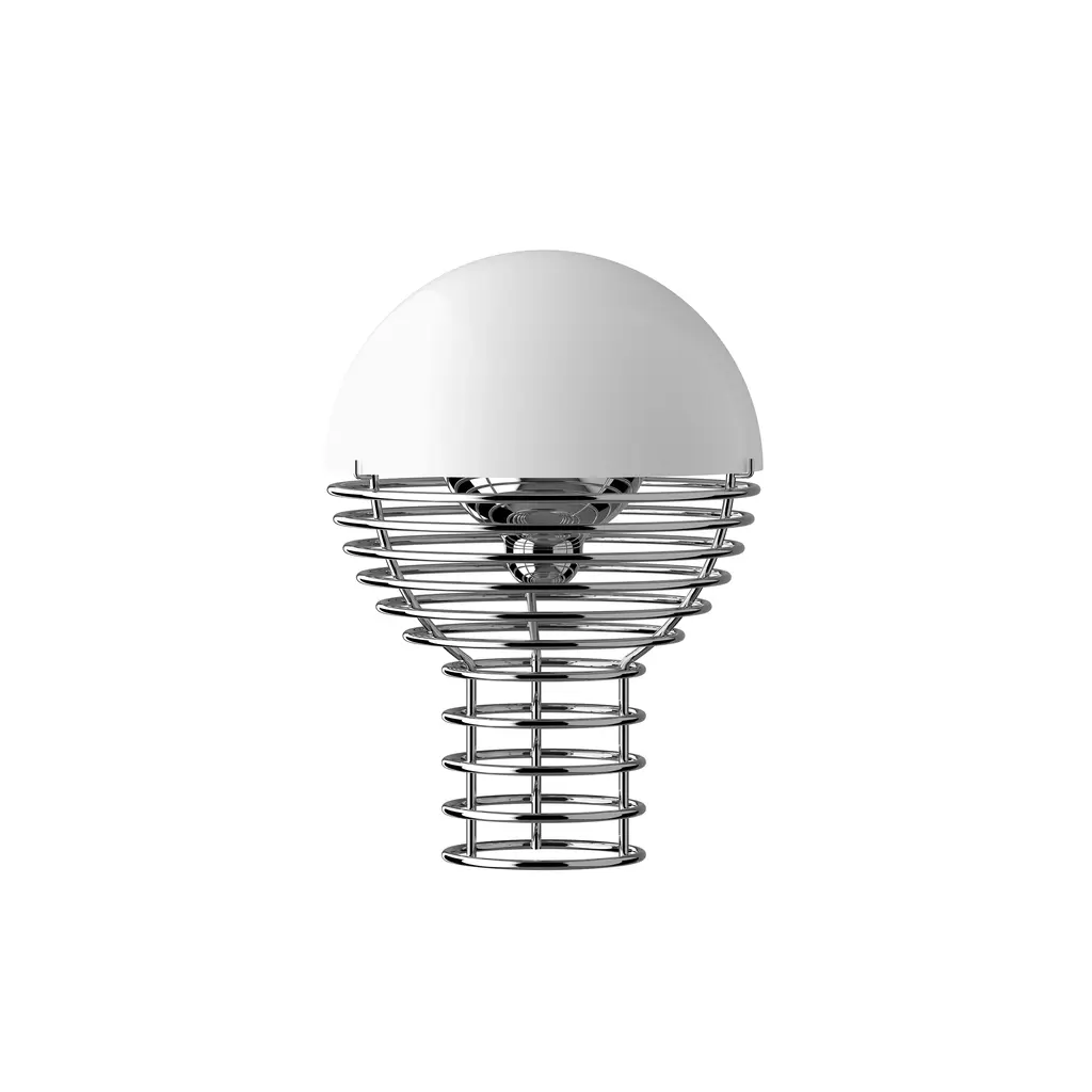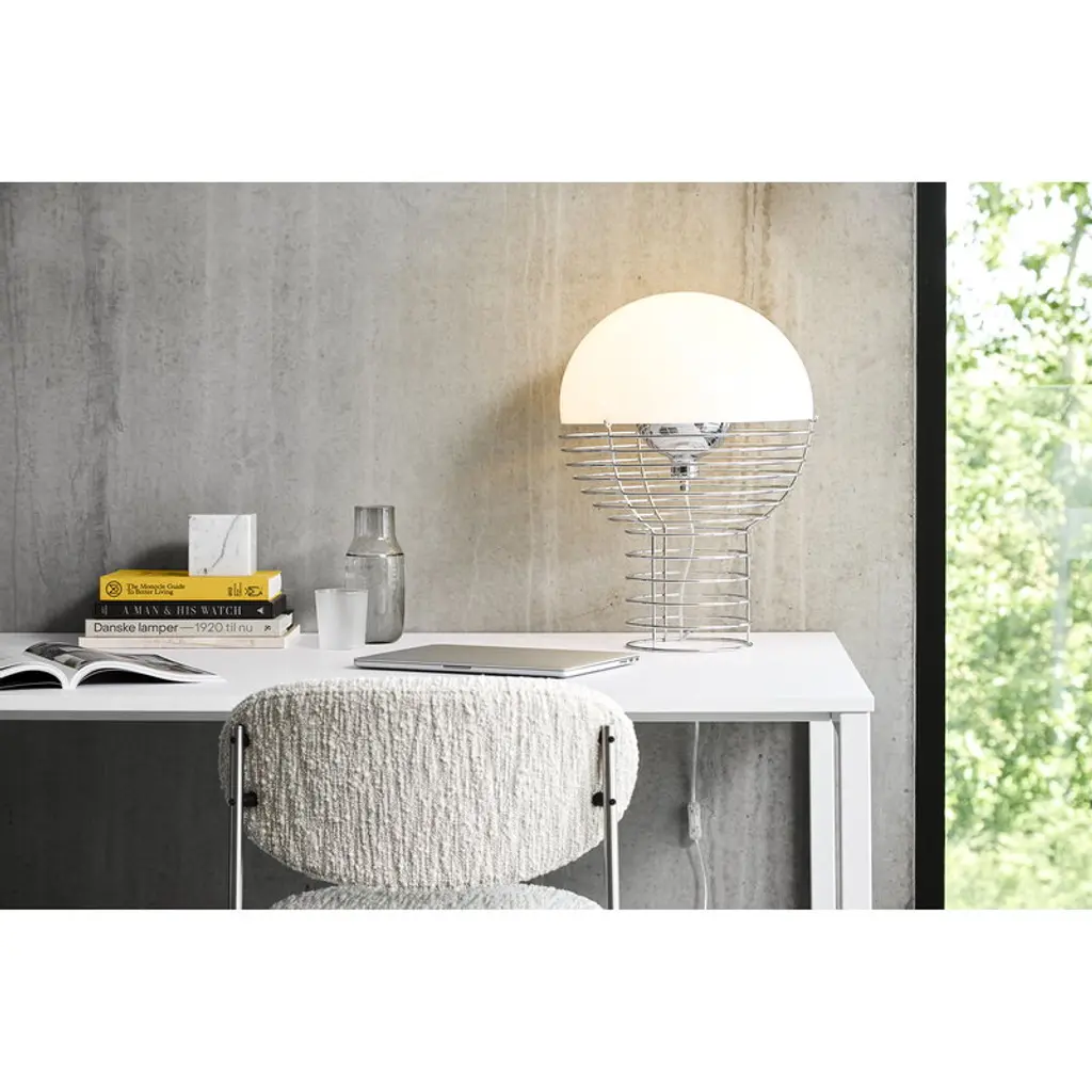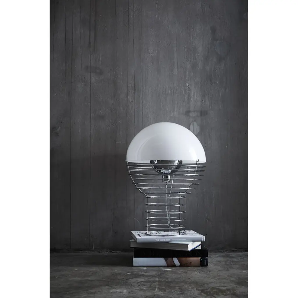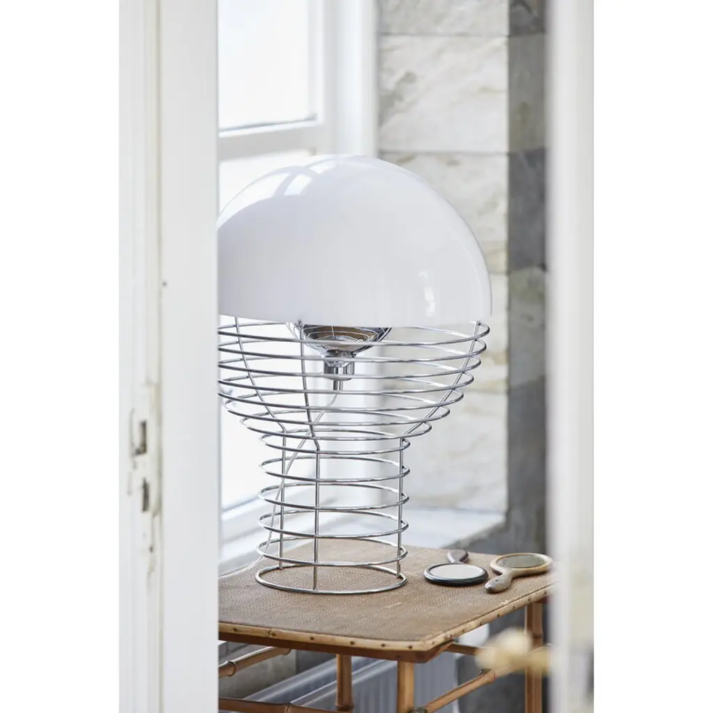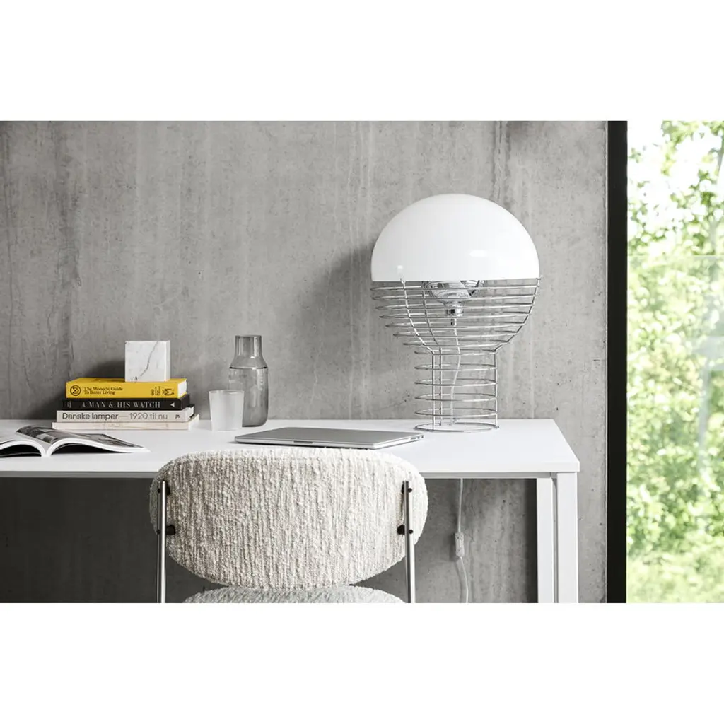 Verpan’s Wire table lamp is a sculptural design classic created by the legendary Danish designer Verner Panton in 1972. Panton chose two contrasting elements as the materials of the Wire lamp: an upward-widening, chrome-plated metal wire base and a white, hemispherical plastic shade that diffuses light gently. The light source is placed inside a small metal reflector, also hemispherical, which directs the light up to the shade while preventing glare. The soft light and striking, sculptural design of the Wire table lamp make it a true eye-catcher for example a coffee table, window sill or sideboard.