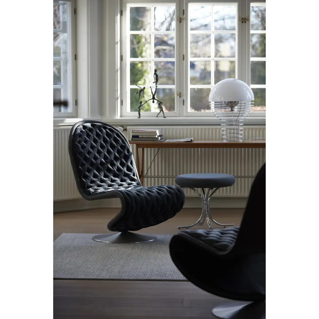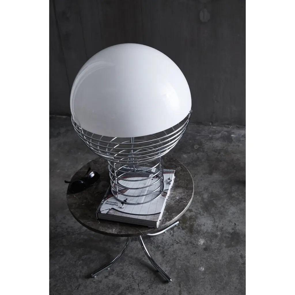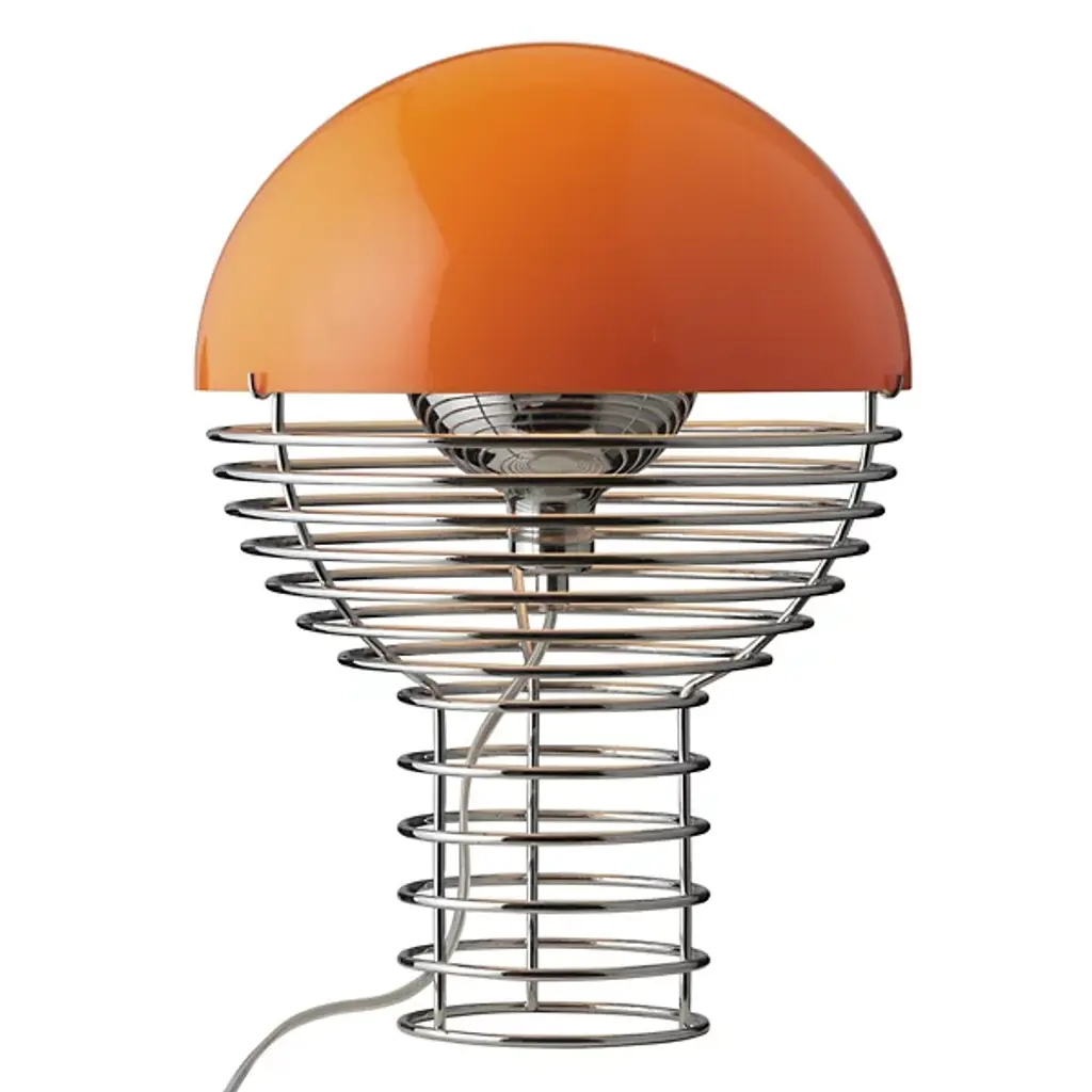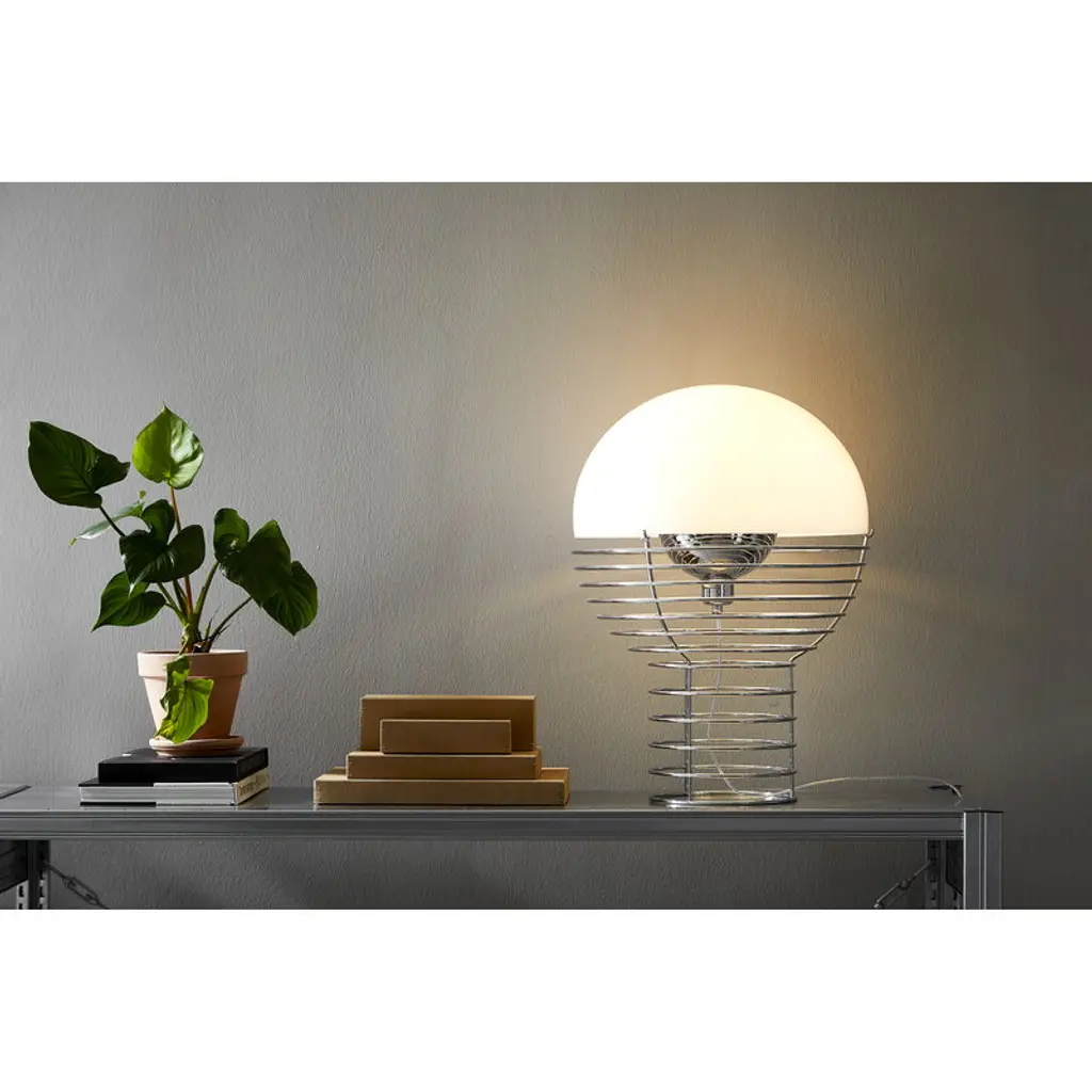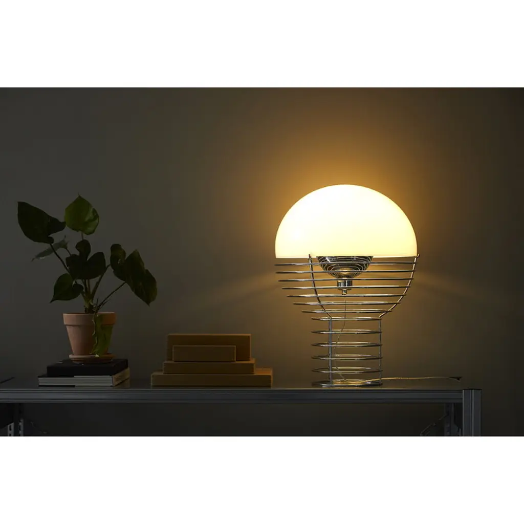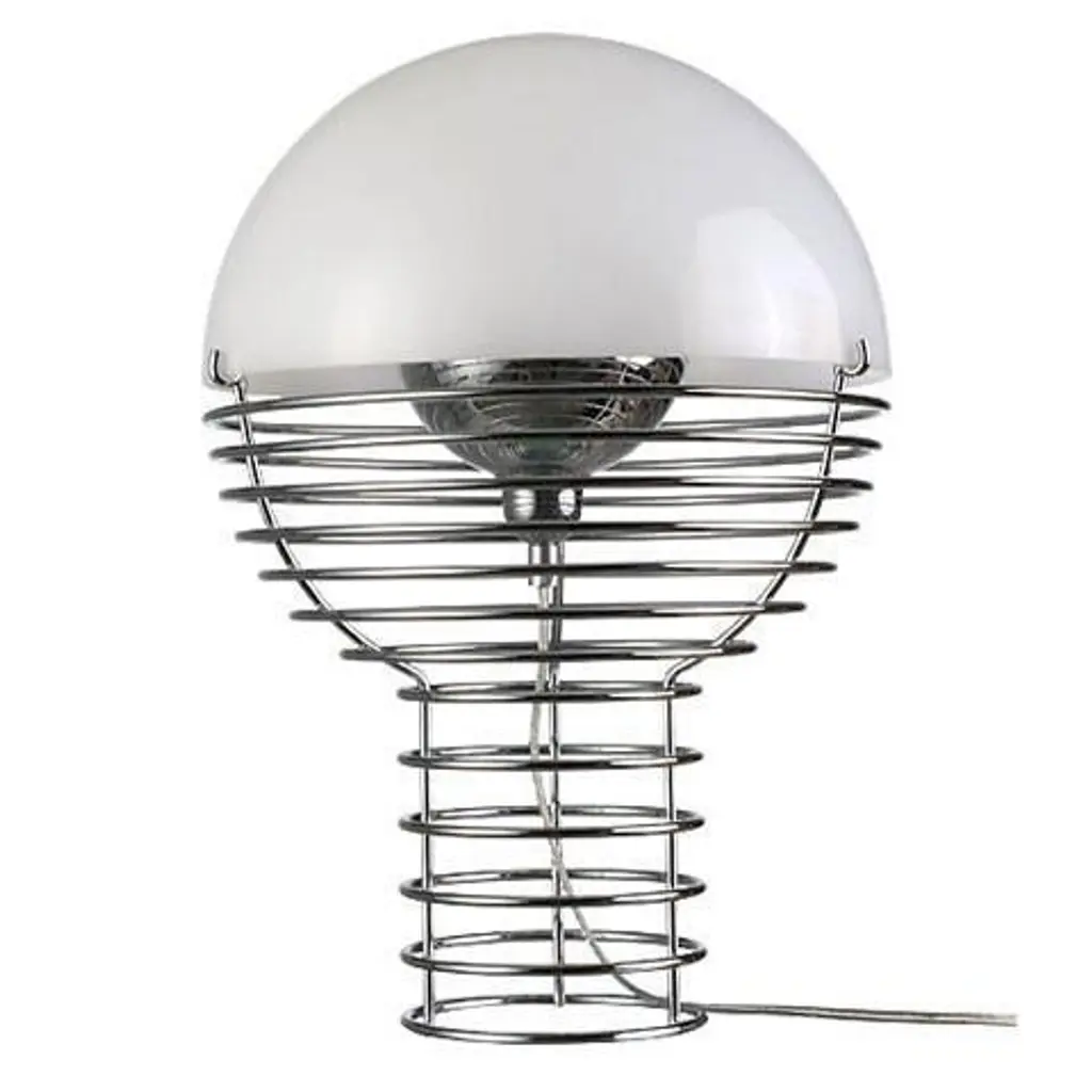 Verpan’s Wire table lamp is a sculptural design classic created by the legendary Danish designer Verner Panton in 1972. Panton chose two contrasting elements as the materials of the Wire lamp: an upward-widening, chrome-plated metal wire base and a white, hemispherical plastic shade that diffuses light gently. The light source is placed inside a small metal reflector, also hemispherical, which directs the light up to the shade while preventing glare. The soft light and striking, sculptural design of the Wire table lamp make it a true eye-catcher for example a coffee table, window sill or sideboard.