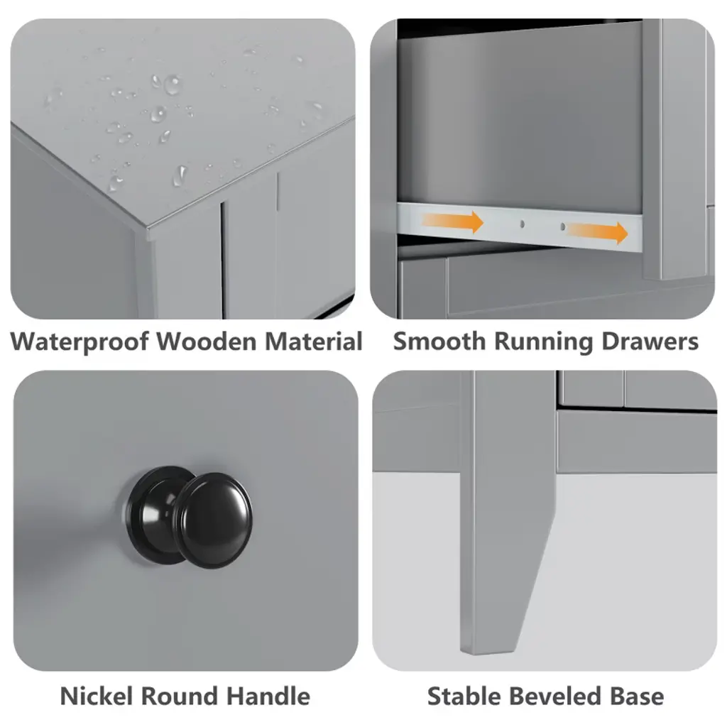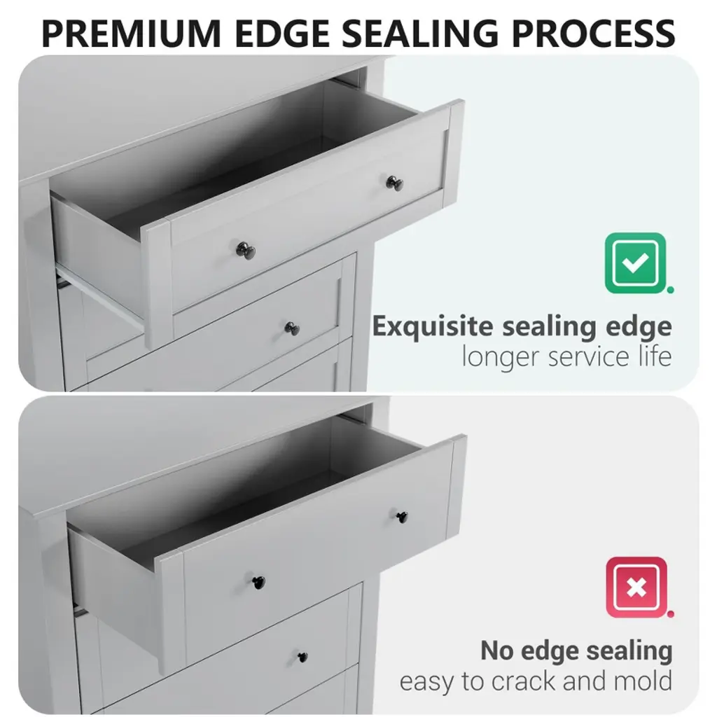 Feature:Five spacious drawers with smooth sliding rails open effortlessly, providing ample space to store spare linens, shirts, pants, and other wardrobe items.The spacious top leaves plenty of room to turn it into a vanity and add a mirror, or display a table lamp and some framed photos.Anti-tipping accessories provide reliable safety for your beloved family. Premium MDF material and robust support legs gurantee superior sturdiness and durability.Ideal for both bedroom and living room settings, this wooden dresser boasts a sturdy frame and a lovely painted surface that complements nearly any space. Specification:Color: GreyProduct Dimension: 31.5"L x 15.7"W x 42.5"HDrawer Size: 25.4"L x 11.9"W x 5.2"HSpecial Feature: 5 DrawersFurniture Finish: Painted finishProduct Care Instruction: Wipe with Damp ClothAssembly Required: Yes Note:After receiving the package, please be sure to read the installation instructions in the instructions first.The guide rails on the left and right side panels must be on the same level to avoid incomplete closing of the drawer.If you have any questions, pls feel free to keep in touch with us.