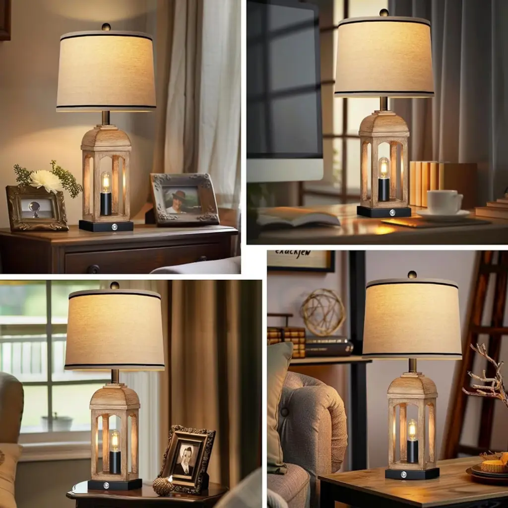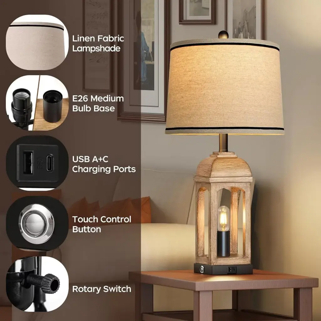 Elevate your space with the warm ambiance and practicality of the Koiai Set of 2 Farmhouse Touch Table Lamps, designed to blend rustic charm with modern convenience. Whether placed on your nightstands or flanking your living room sofa, these lamps bring both beauty and utility to your home. Crafted with a vintage-inspired hollow base design and a built-in nightlight, each lamp offers four lighting modes to match your mood or functional needs—from a soft glow for late-night relaxation to full brightness for reading or working. Touch control enables effortless operation with three dimmable levels, giving you the flexibility to adjust brightness with just a tap. These 3 way dimmable nightstand lamps come equipped with built-in USB A and USB C charging ports, allowing you to power up your phone, tablet, or other smart devices without the need for extra outlets or messy wires. It's the perfect solution for modern lifestyles that value both style and smart functionality. The lower nightlight section glows through the open lantern-style base, creating a layered lighting effect that feels cozy and elegant. Whether you prefer a minimalist rustic look or classic farmhouse décor, the neutral fabric lampshades and distressed finish effortlessly tie your room together. These bedside lamps with night light and dimmer are ideal for bedrooms, guest rooms, or cozy living spaces where layered lighting can enhance comfort and ambiance. Each lamp includes 4 LED bulbs (2 for each lamp, top and bottom), so your setup is ready from the moment you unbox it. The Koiai farmhouse lamp set is more than just lighting—it’s a statement piece designed to enhance your daily life with thoughtful features and timeless design.