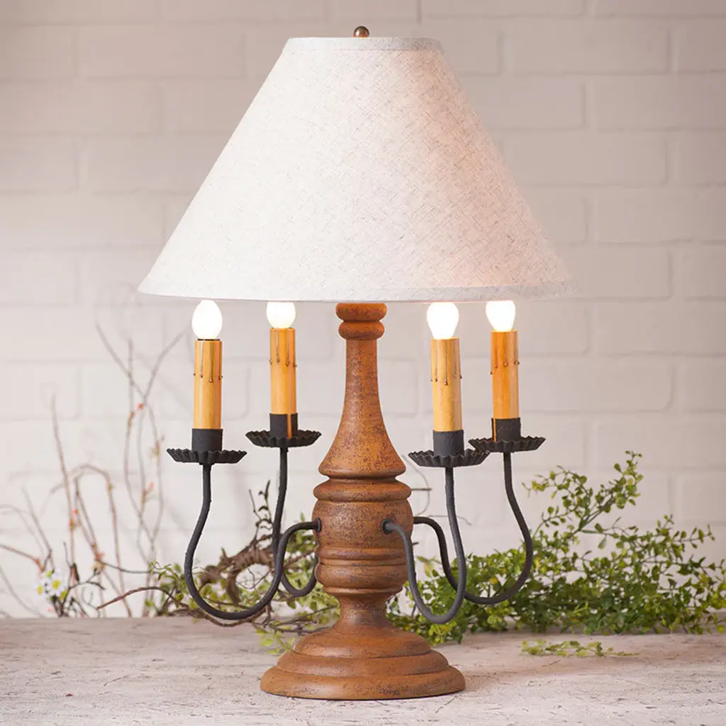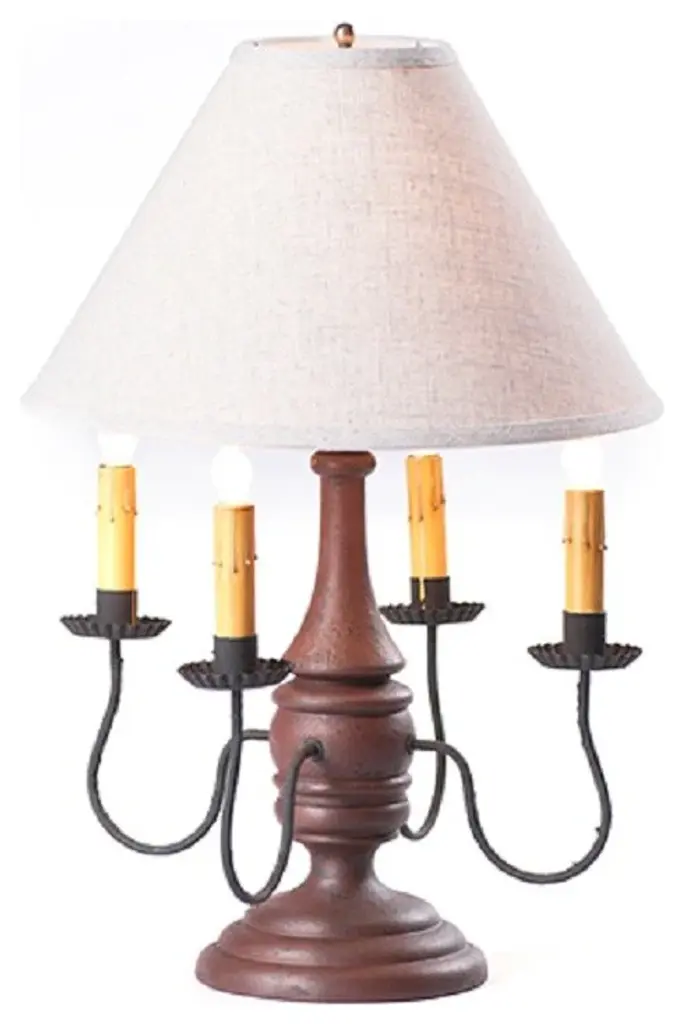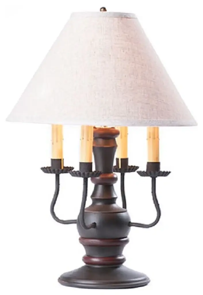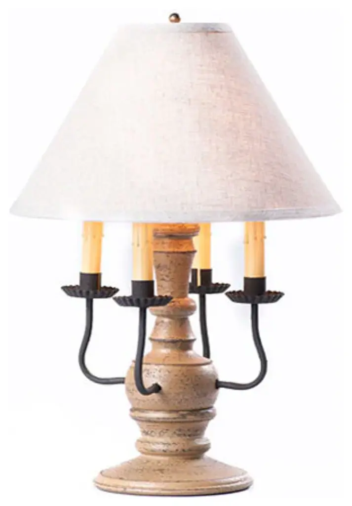 A finely crafted table lamp with four candelabra arms and a standard socket on top with three way lighting capability. Our Jamestown Lamp exudes a genteel country feeling like that on a gentleman''s farm or a plantation of the Old South.Four candelabra arms, 60 watts maximum per socket. Center light has a standard socket, 150 watts maximum. 3-way switch. Heavily distressed and crackled painted finish with textured black arms with crimped pans.Handcrafted in Pennsylvania. Includes a 15" ShadeMeasures 25.5-Inches high and 15-Inches diameterHas a 7-foot cord and line switch; Plugs into wall outlet; Top center has a standard socket, 1 x 150 watts max; Arms have candelabra sockets, 4 x 60 watts maxBULBS NOT INCLUDED UL listed for dry locationsHeavily distressed paint finish; Shade included Lamp Base is made in the USA, Shade is Imported