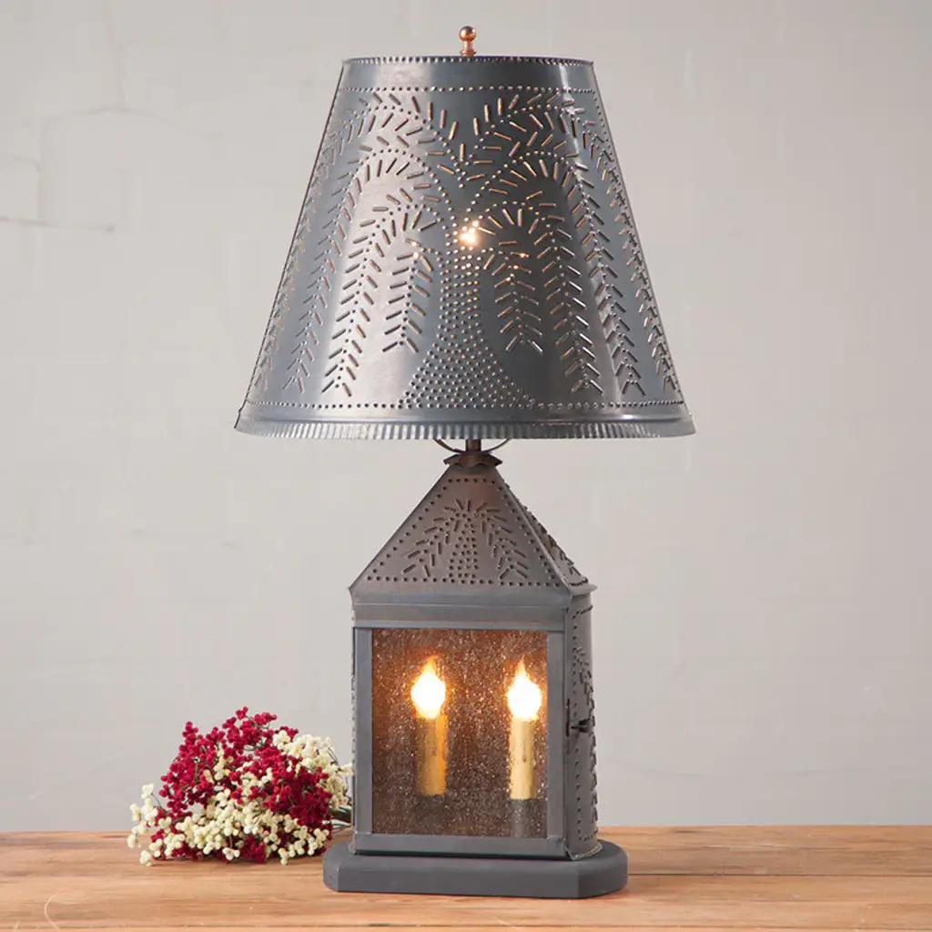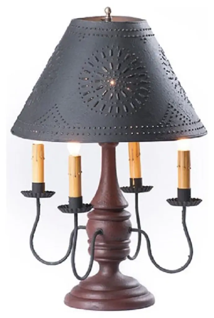 A finely crafted table lamp with four candelabra arms and a standard socket on top with three way lighting capability. Our Jamestown Lamp exudes a genteel country feeling like that on a gentleman''s farm or a plantation of the Old South.Four candelabra arms, 60 watts maximum per socket. Center light has a standard socket, 150 watts maximum. 3-way switch. Heavily distressed and crackled painted finish with textured black arms with crimped pans.Handcrafted in Pennsylvania. Includes a 15" ShadeMeasures 25.5-Inches high and 15-Inches diameterHas a 7-foot cord and line switch; Plugs into wall outlet; Top center has a standard socket, 1 x 150 watts max; Arms have candelabra sockets, 4 x 60 watts maxBULBS NOT INCLUDED UL listed for dry locationsHeavily distressed paint finish; Shade included Lamp Base is made in the USA, Shade is Imported