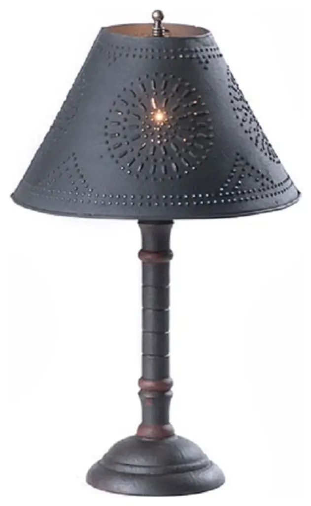 A medium sized lamp that will work well in your office, family room, or entryway. A neat looking lamp with heavily textured painted finish.One single standard socket, 150 watts maximum. Heavily distressed and crackled body color. Handcrafted in Pennsylvania. Includes a 12" Textured Black Flared Shade Measures 19.5-Inches high and 12.75-Inches diameterHas a 7-foot cord and line switch; Plugs into wall outlet; Standard socket, 1 x 150 watts maximum wattsBULBS NOT INCLUDEDUL listed for dry locationsHeavily distressed black over red paint finish; Black textured shade includedLamp Base is made in the USA, Shade is Imported