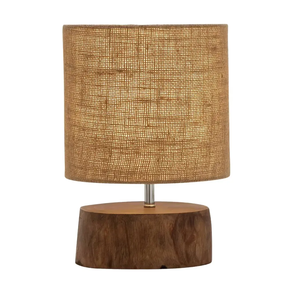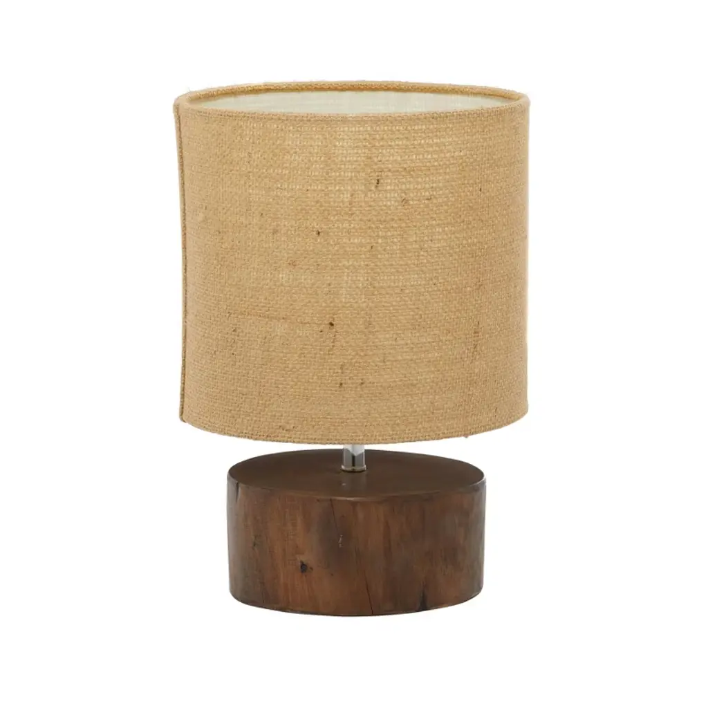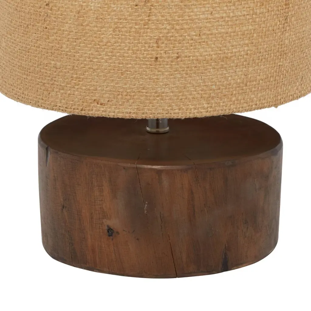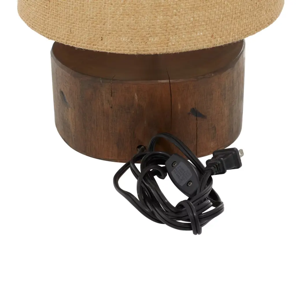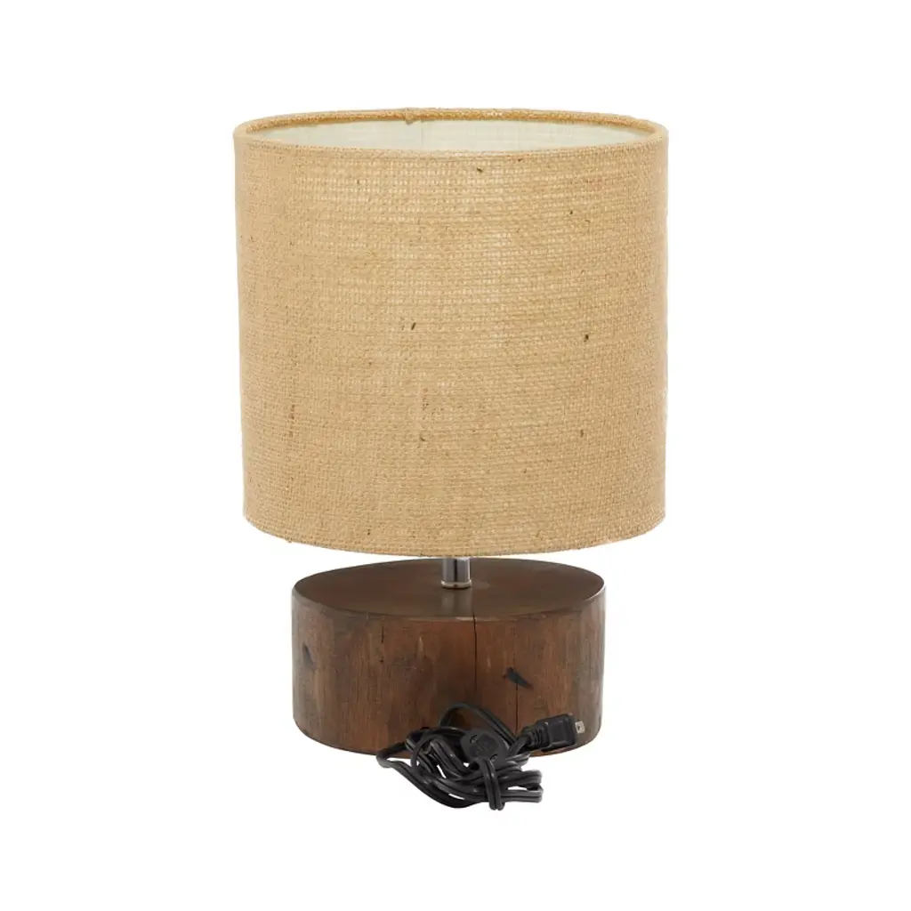 This rustic lamp's small size makes a great bedside table light or in other small spaces. Designed with felt or rubber stoppers at the base that prevent scratching furniture and table tops, as well as sliding around. Requires 1 Type A E26/Medium (Standard) bulb. This item ships in 1 carton. Comes with a 73" cord length. Decorative lamp on mahogany slab base. Suitable for indoor use only. Table lamp comes with a brown drum shaped shade that measures 10 x 10 x 9 inches. Includes a rotary switch. Made in Phillipines. This is a single table lamp. Rustic style.