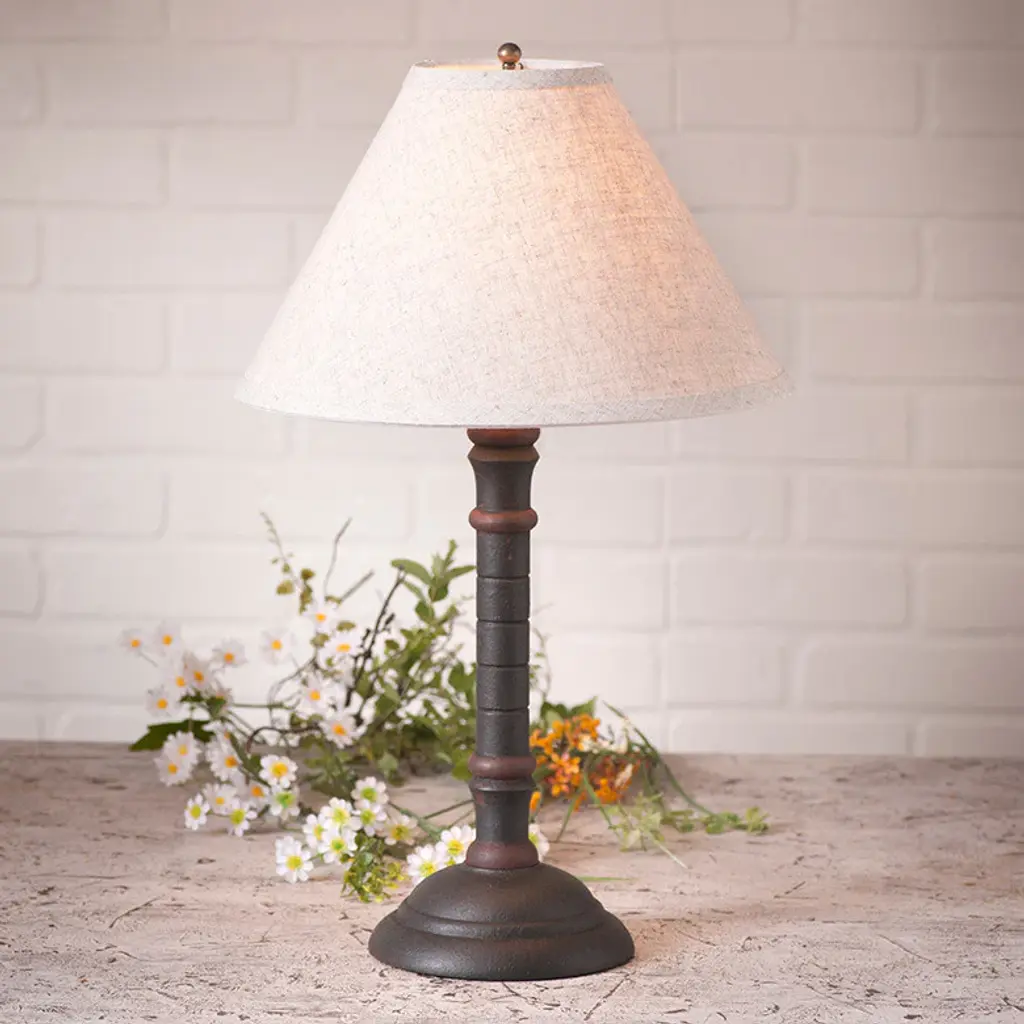 A medium sized lamp that will work well in your office, family room, or entryway. A neat looking lamp with heavily textured painted finish.One single standard socket, 150 watts maximum. Heavily distressed and crackled body color. Handcrafted in Pennsylvania. Includes a 12" Textured Black Flared Shade Measures 19.5-Inches high and 12.75-Inches diameterHas a 7-foot cord and line switch; Plugs into wall outlet; Standard socket, 1 x 150 watts maximum wattsBULBS NOT INCLUDEDUL listed for dry locationsHeavily distressed black over red paint finish; Black textured shade includedLamp Base is made in the USA, Shade is Imported