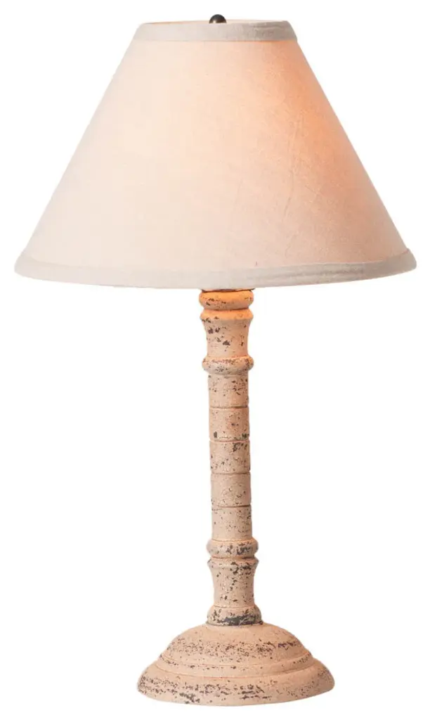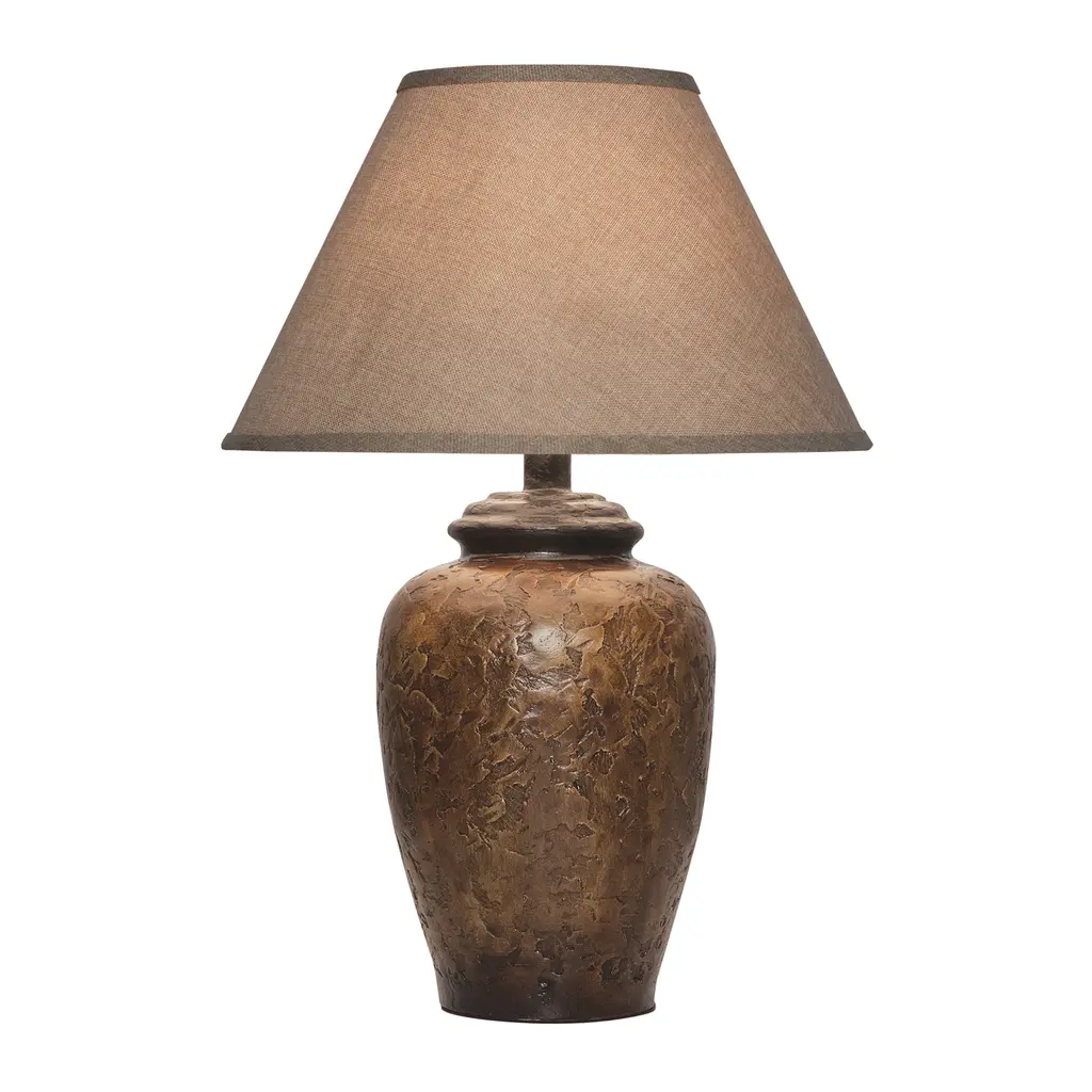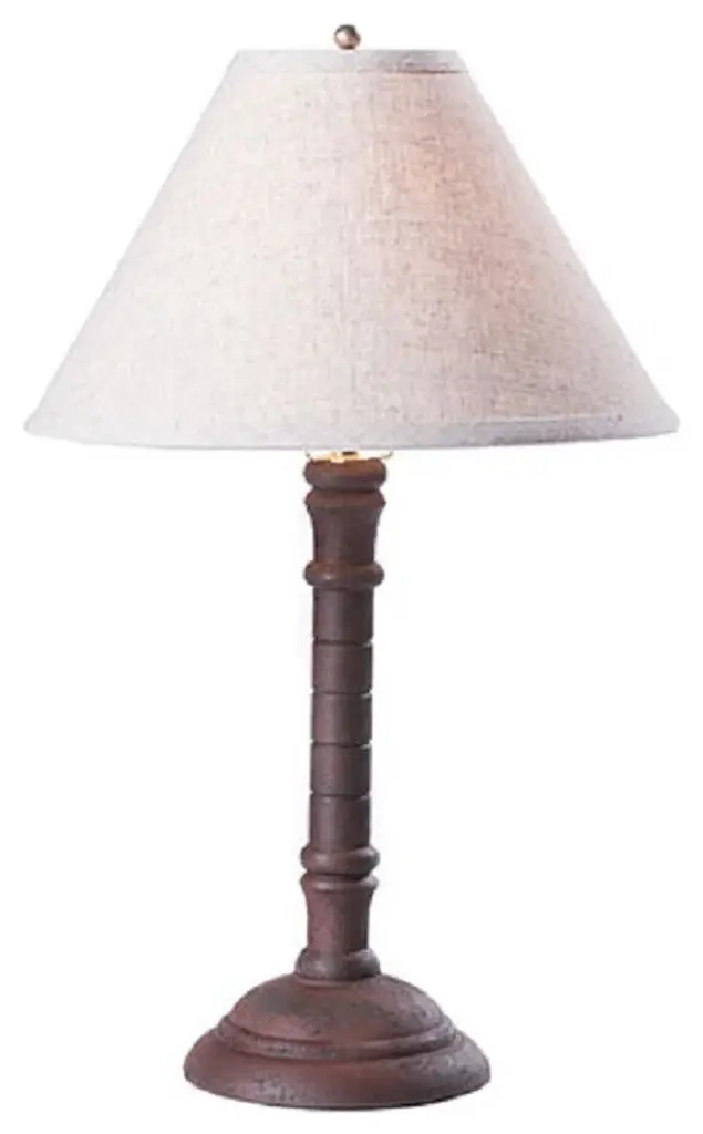 A medium sized lamp that will work well in your office, family room, or entryway. A neat looking lamp with heavily textured painted finish.One single standard socket, 150 watts maximum. Heavily distressed and crackled body color. Handcrafted in Pennsylvania. Includes a 12" Textured Black Flared Shade Measures 19.5-Inches high and 12.75-Inches diameterHas a 7-foot cord and line switch; Plugs into wall outlet; Standard socket, 1 x 150 watts maximum wattsBULBS NOT INCLUDEDUL listed for dry locationsHeavily distressed black over red paint finish; Black textured shade includedLamp Base is made in the USA, Shade is Imported