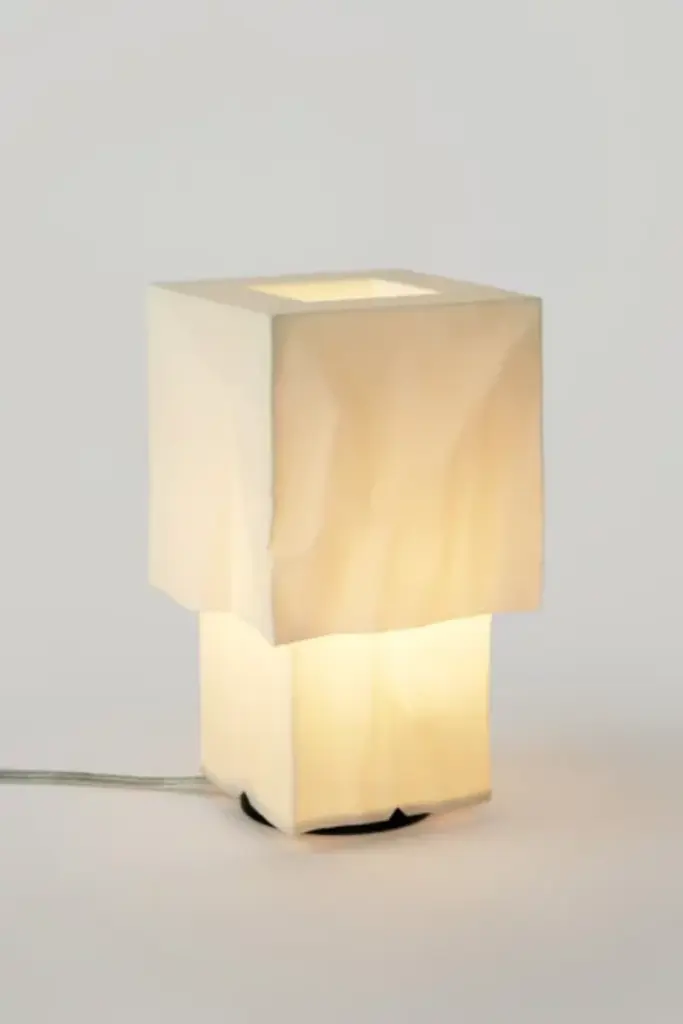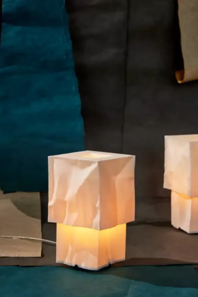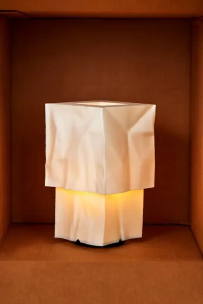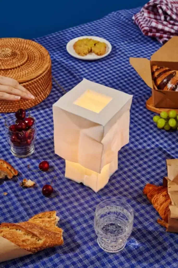 Please note that all items are made to order in Brooklyn, NY and require a 1-2 week lead time before they can be shipped. The Farolito Lamp, named for the paper bag lanterns popularized in New Mexico, takes distinct features of the unassuming and ubiquitous paper lunch bag – notches often seen at the top of the bag are present around the base, the distinct crease where the bag gets folded and flat packed can be seen on two sides of the shade – to create a lamp that is inspired but whimsical and unique in its own right. **Content + Care** \- Recycled PLA \- Transparent TPE cord \- 2W E12 Base, 2700K (soft warm white) \- LED bulb only \- Wipe down damp microfiber cloth if necessary (unplug lamp before doing this) \- This is a fragile item - treat with love! \- Imported **Size** \- Dimensions: 8.75" H x 4.75" W x 7" D \- Weight: 1.3 lbs