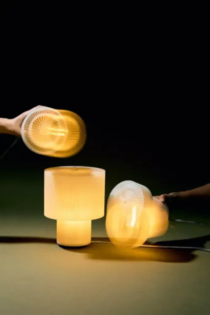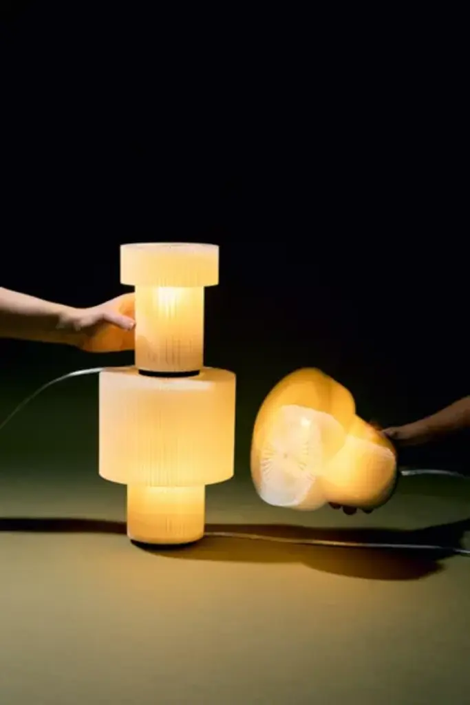 Please note that all items are made to order in Brooklyn, NY and require a 1-2 week lead time before they can be shipped. The Drum collection was inspired by images captured by Bernd and Hilla Becher of revolutionary technology, as well as highly ordered natural formations – mushroom gills, flower petals, and refracted light. Christopher Merchant sought to combine these inspirations in a classic lamp profile while expressing the unique character and capabilities of 3D printing, a technological revolution in itself. Also available as a pendant and larger table lamp. **Content + Care** \- Recycled PLA \- TPE power cord \- 2W E12 Base, 2700K (soft warm white) \- LED bulb only \- Wipe down damp microfiber cloth if necessary (unplug lamp before doing this) \- This is a fragile item - treat with love! \- Imported **Size** \- Dimensions: 6.5" H x 5" D \- Weight: 1 lb
