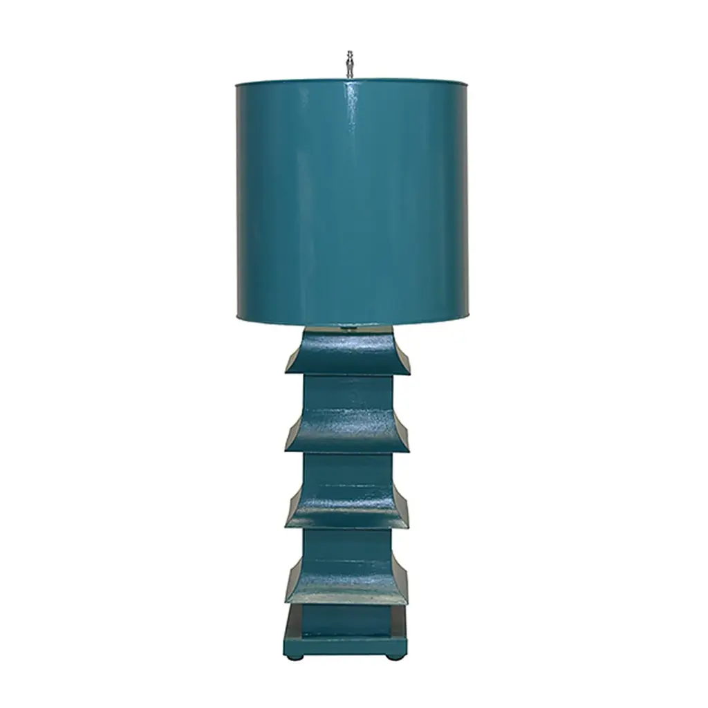 Tiered and towering with four elegant eaves, this Pagoda-style lamp by Worlds Away is a study in modern antiquity. The Worlds Away Pagoda Lamp draws obvious influence from one of the iconic architectural designs of East Asia: the tiered roof flares of the pagoda tower. Made of tole finished in white, turquoise, pink, orange, or navy blue.