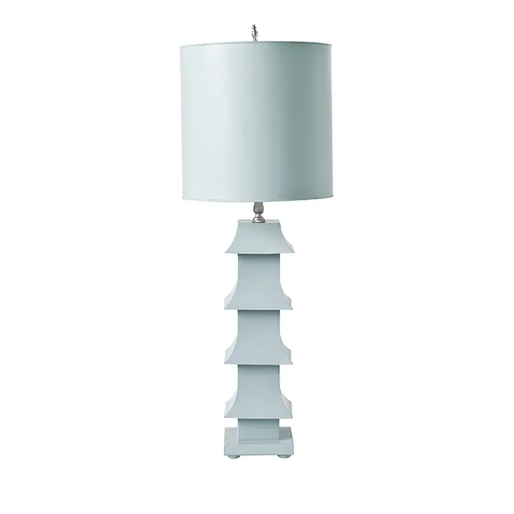 Tiered and towering with four elegant eaves, the slim, Pagoda-style lamp by Worlds Away is a study in modern antiquity. The Worlds Away Pagoda Lamp draws obvious influence from one of the iconic architectural designs of East Asia: the tiered roof flares of the pagoda tower. Made of tole finished in antiqued cream, powder blue, hot pink, green, or turquoise.