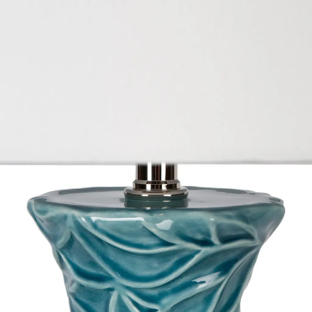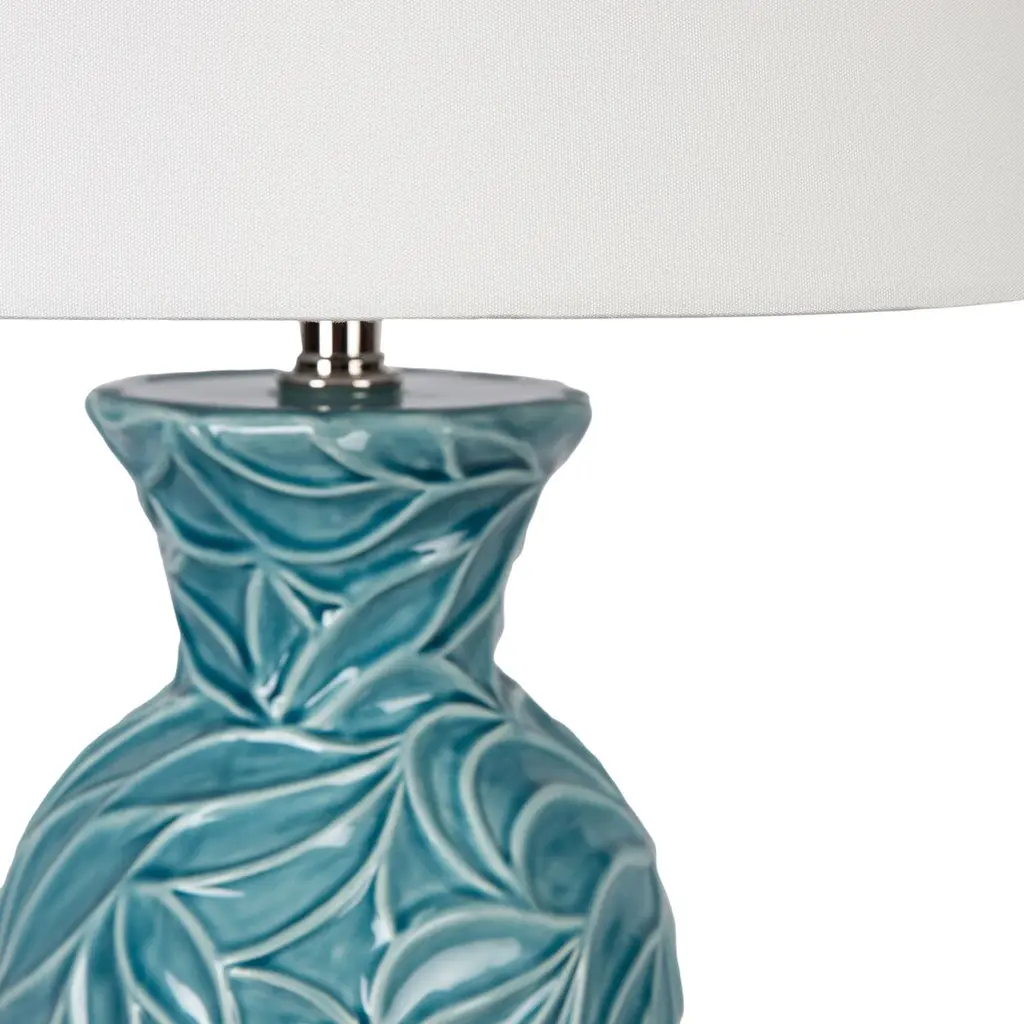 Leafy texture creates rich dimension for a contemporary ceramic table lamp. A decorative addition sure to catch the eye on a side table or console, the lamp includes a crystal base that adds a touch of sparkle and sophistication. On top, a linen empire shade is capped with a crystal finial, offering elegance and inviting illumination.