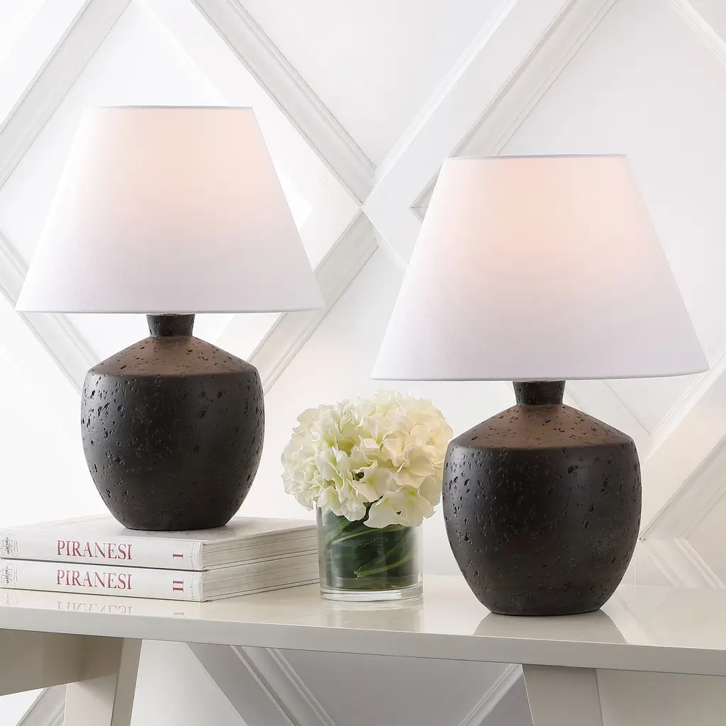 Make a bold statement with the classic silhouette of these very modern lamps. Heavy resin bases in a ginger jar shape are topped with tall, cone-shaped linen shades. The minimalist matte finish adds contrast to a bedroom, office or living room.-Contemporary matte black resin base with a linen-look shade in white-Modern lamp design is perfect for reading, with an LED bulb and rotary switch-These transitional lamps add vintage flair to a sofa, or make a statement in the bedroom-Eco-friendly 9W LED bulb included-Takes 1 bulb and compatible with TYPE "A" 60W or CFL 13W or LED 9WColor: Matte Black with White Shade-Body Material: Resin-Includes: Two (2) lampsAssembly RequiredLamp: 19.25 inches high x 10 inches wide x 10 inches deepAbout us: You see a lamp.We see a decorative work of art.A perfectly curved shade casts a dramatic shadow on a floor. Compatible with LED lightbulbs: as easy on the environment as they are on the eyes. The JONATHAN Y Lighting collection considers every detail from impeccably sourced materials to designer styling. And our prices are so attractive, we've transformed a functional necessity into a fashion accessory.JONATHAN Y Lighting - a fashion revolution in home decor.