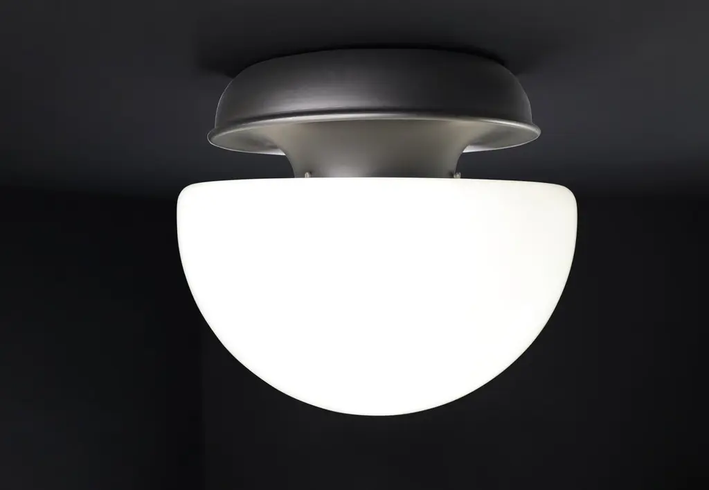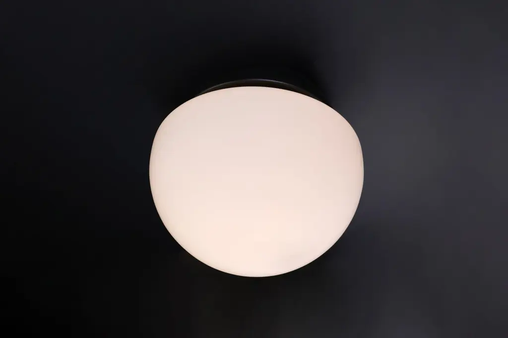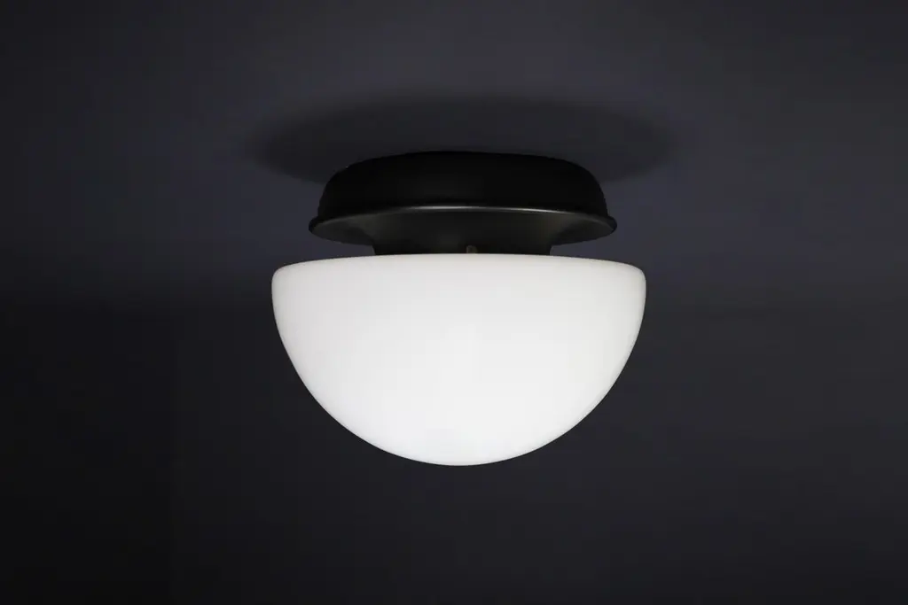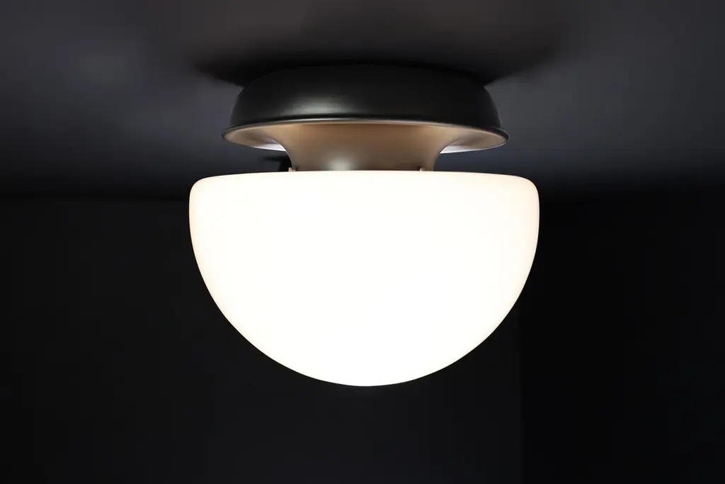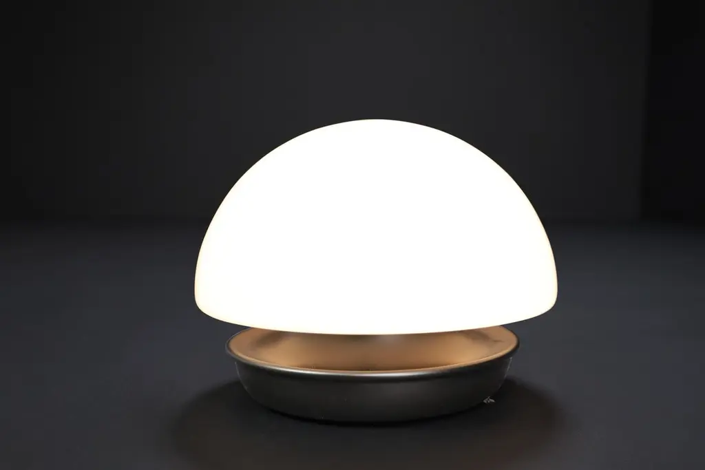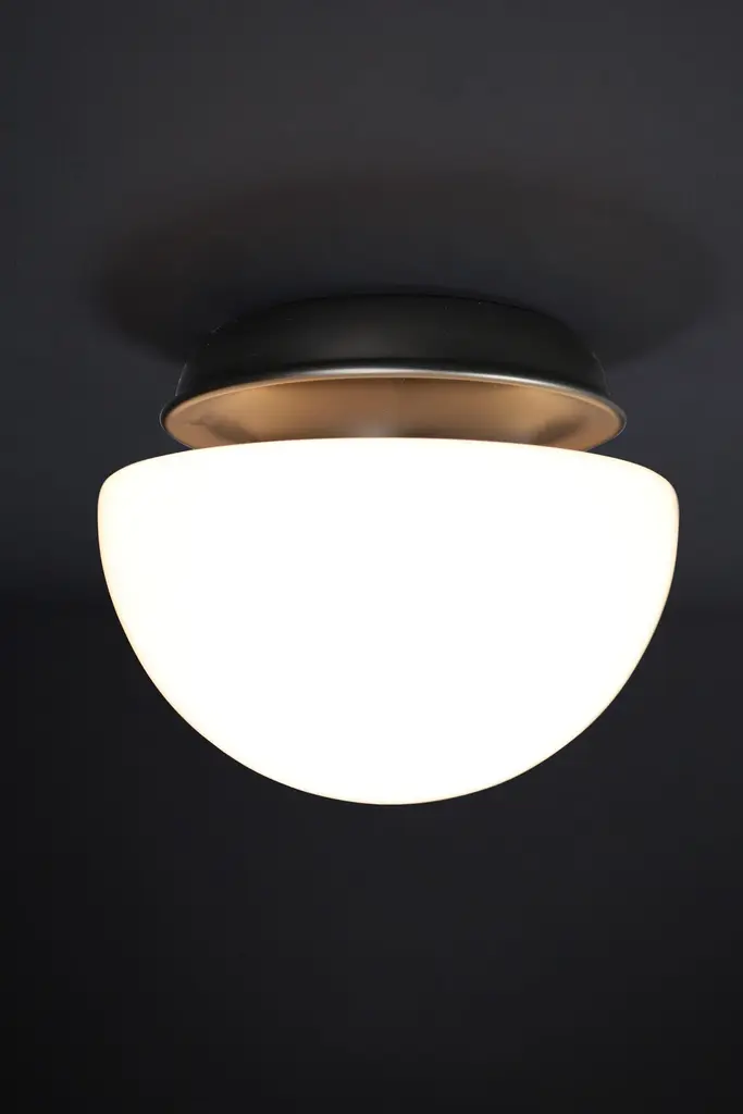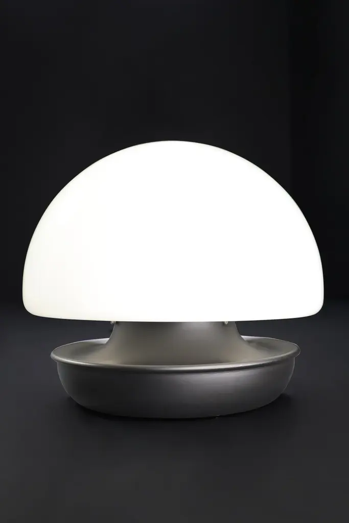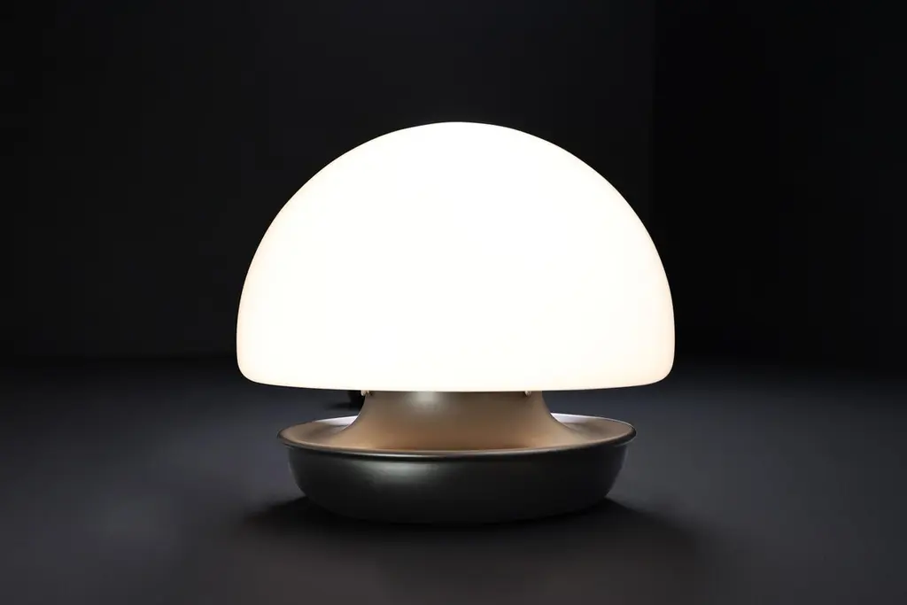 XL Italian Mushroom Flush Mount / Sconces / Table Lamp in Opaline Glass and Metal, 1960s — 22 AvailableStriking in scale and form, this XL Italian mushroom lamp from the 1960s is a stunning example of mid-century design. Featuring a large hand-blown opaline glass dome and a minimalist matte black metal base, it emits a soft, ambient glow that elevates any space.Versatile in application, this piece functions beautifully as a flush mount ceiling light, wall sconce, or table lamp, making it a designer favorite for both residential and commercial interiors. With 22 identical pieces available, this is a rare opportunity to source cohesive vintage lighting for large-scale projects.Each lamp has been professionally rewired and fitted with a standard E27 socket, ensuring safety and compatibility with modern lighting standards. The craftsmanship and quality materials — opaline glass and lacquered metal — have been preserved in excellent vintage condition, showing only minor signs of age.The large dome, at 40 cm in diameter, provides a striking silhouette and beautifully diffused light. These lamps, whether installed individually or in series, bring sophisticated Italian modernist style to any room.Origin: Italy, 1960sMaterials: Opaline glass, metalFinish: White opaline shade, matte black baseDimensions: Diameter 40 cm (15.75 in), Height 36 cm (14.17 in)Socket: E27 (rewired to current electrical standards)Availability: 22 pieces in stock, priced per light.Condition: Very good vintage conditionPerfect for collectors, interior designers, and design enthusiasts seeking original mid-century lighting with bold presence and versatility.