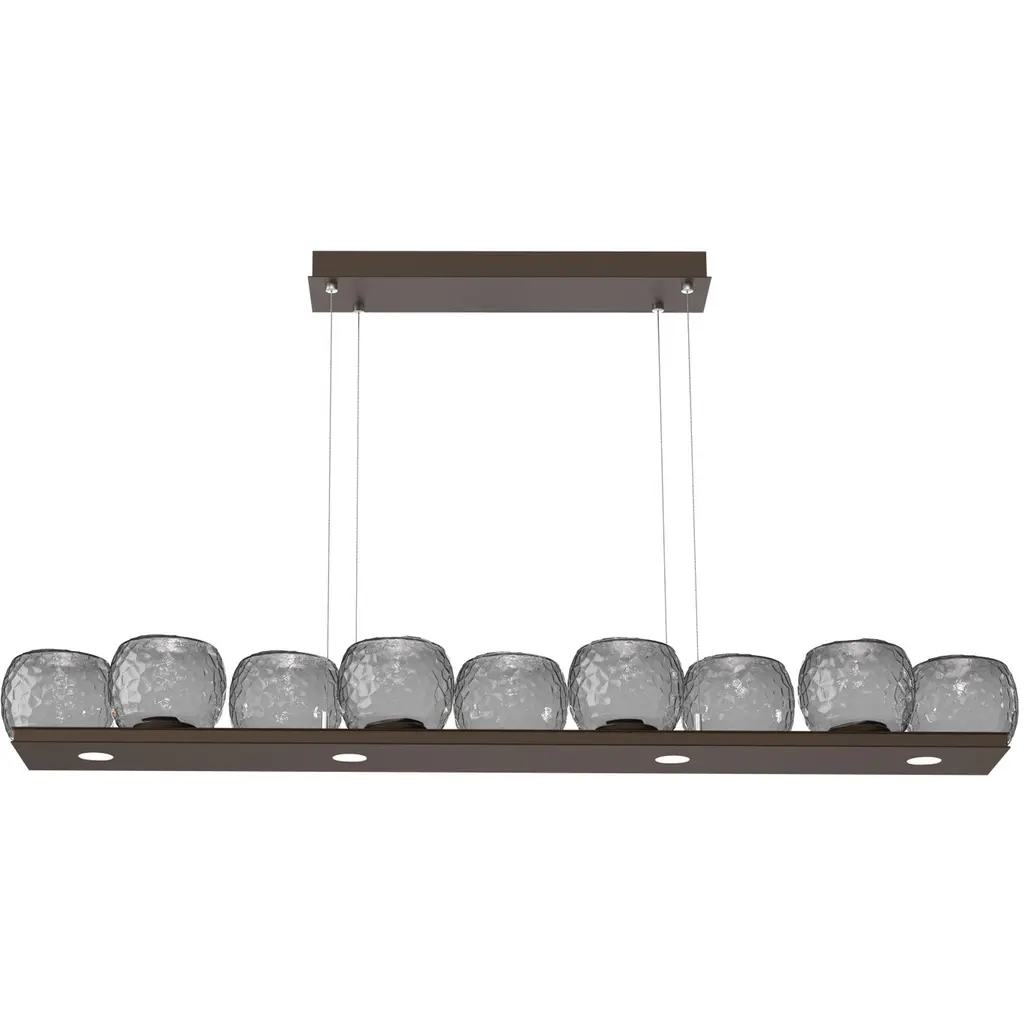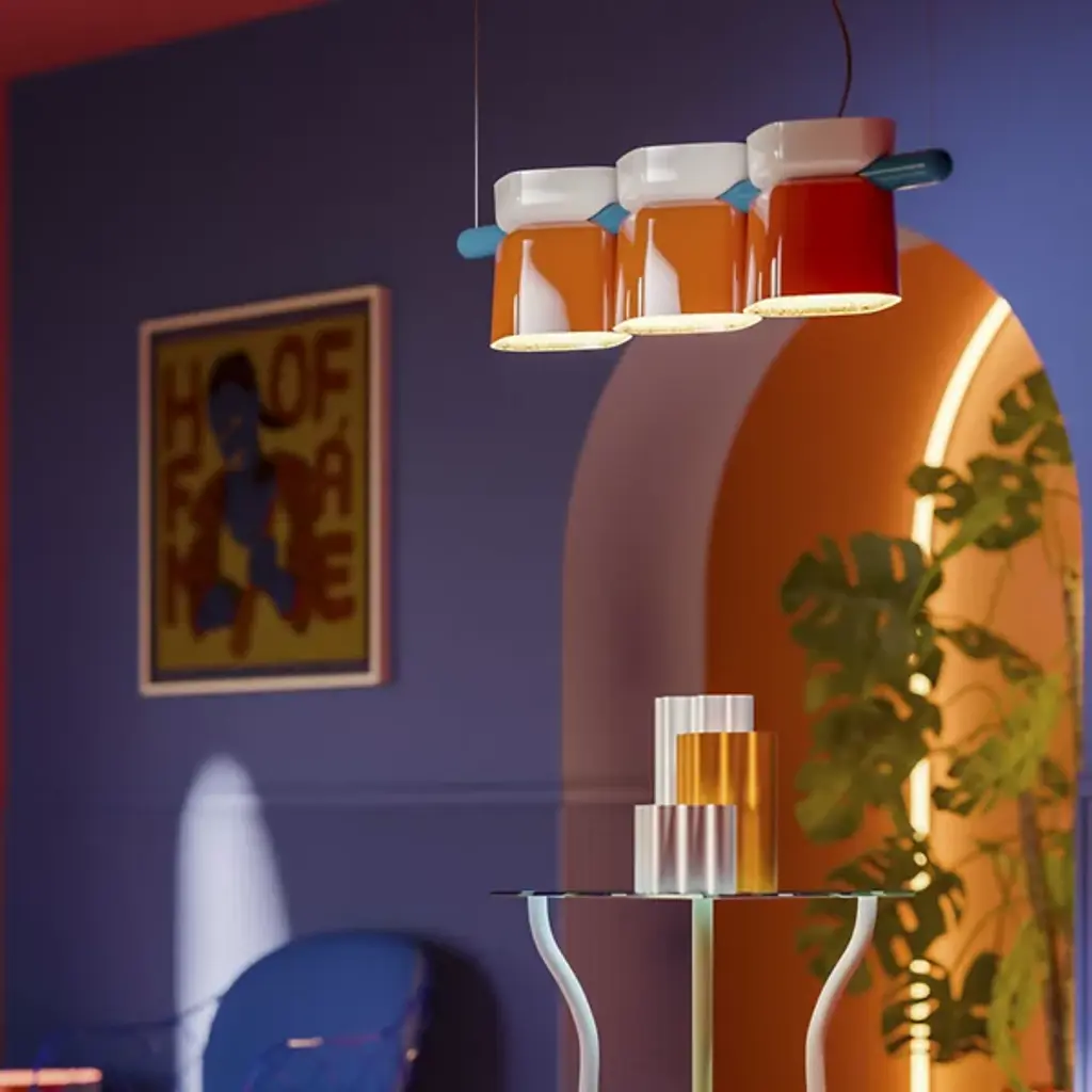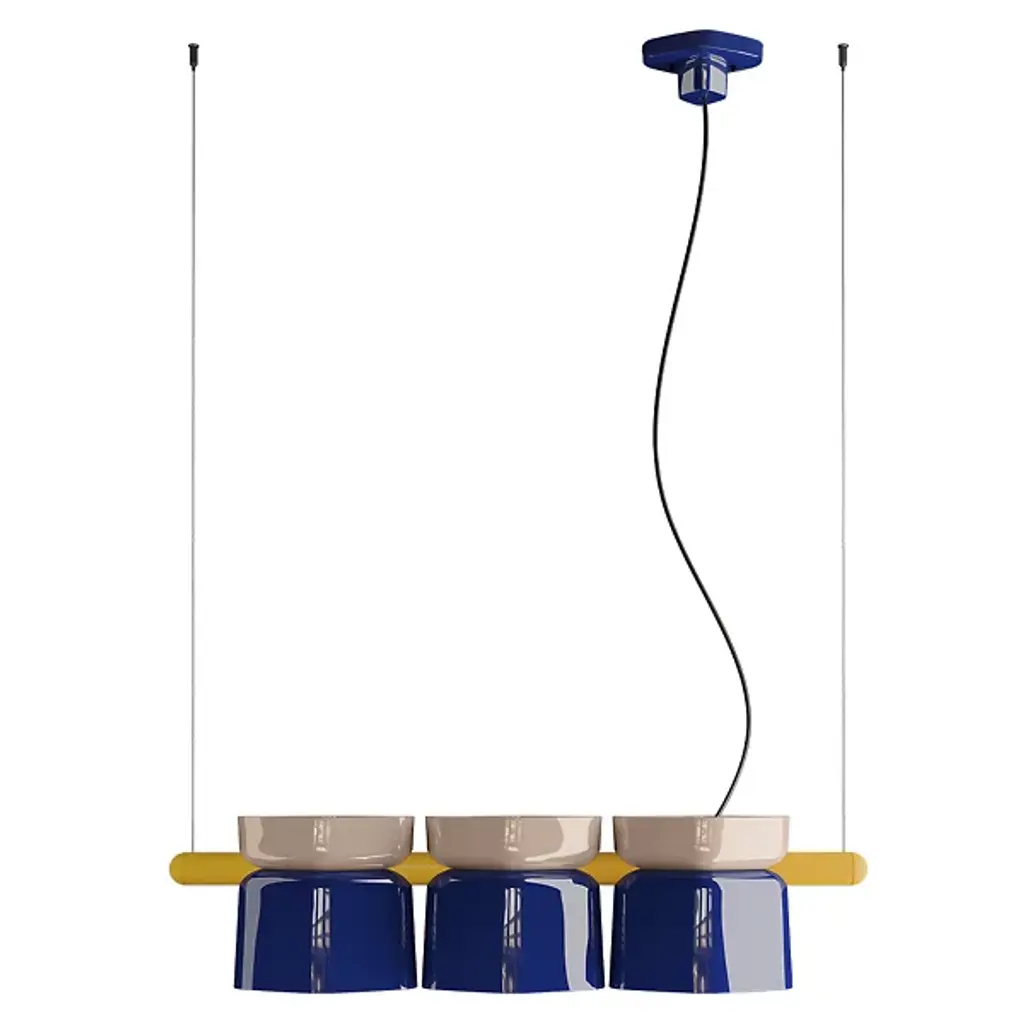 The Yakitori Linear Suspension from Ferroluce is an inspired and appetizing addition to open ceilings, threading its glossy ceramic shade onto a sleek, round-ended crossbar, much like food served on a skewer. The design is made in Italy and evokes the casual, dynamic atmosphere of street food stalls. Each element of the shades contrasts with the rest, while the lower cups that escort each lamp glow from within. Two slender cables secured by small anchor points give the fixture an airy presence, making the delicious colors and focused downlight the center of attention.