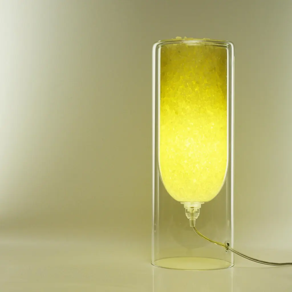 Yellow Rocklumìna XXS table lamp by Coki Barbieri.Dimensions: W 12 x D 12 x H 33.5 cm.Materials: Italian rock salt crystals colored with natural pigments, mineral pigments from Italian soil and borosilicate glass.All our lamps can be wired according to each country. If sold to the USA it will be wired for the USA for instance.FEATURES4 divided components220-240V / 50 Hz ONLYLED A++ E14 4W light bulb includedsuitable for type C socketplug adapter includedRocklumìnaInnovative glass table lamp with Italian rock salt crystals winner of Green Product Award. It can be used as a diffuser of essences by putting a few drops of essential oil on the crystals. The crystals last for years, they can be replaced with those of other colors (sold separately) in a few minutes. The upper part (which always remains open) can be cleaned of dust according to theinstructions in the instructions.It naturally absorbs moisture from the air and is a highly energy efficient A++ / 4W LED.A precious objects collection made in Italy with natural and vegan origin materials, conceived by architectural and product designer Coki Barbieri and created by the local craftsmen to expand a new slow living awareness and surround oneself with a few objects, capable of staying alongside us over time.The climate emergency and increased future anxiety push our work to imagine alternative ways of living, producing, and consuming. For that Coki Barbieri uses notions of geology, chemistry, and design culture to create new products (and materials) from fragments and waste from natural products (such as stone and minerals).Coki Barbieri established her eponymous studio-workshop in Rimini in 2017, bringing to life a sustainable way of conceiving the product design for home. Nature inspires her environmentally conscious creations, which are imbued with emotional energy while maintaining their aesthetic impact and practical functionality. Coki collaborates with talented Italian craftsmen to produce one-of-a-kind homeware objects capable of unlocking new synergies between concepts, materials, and use.