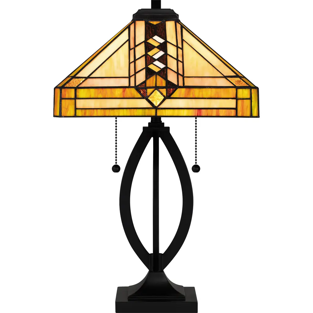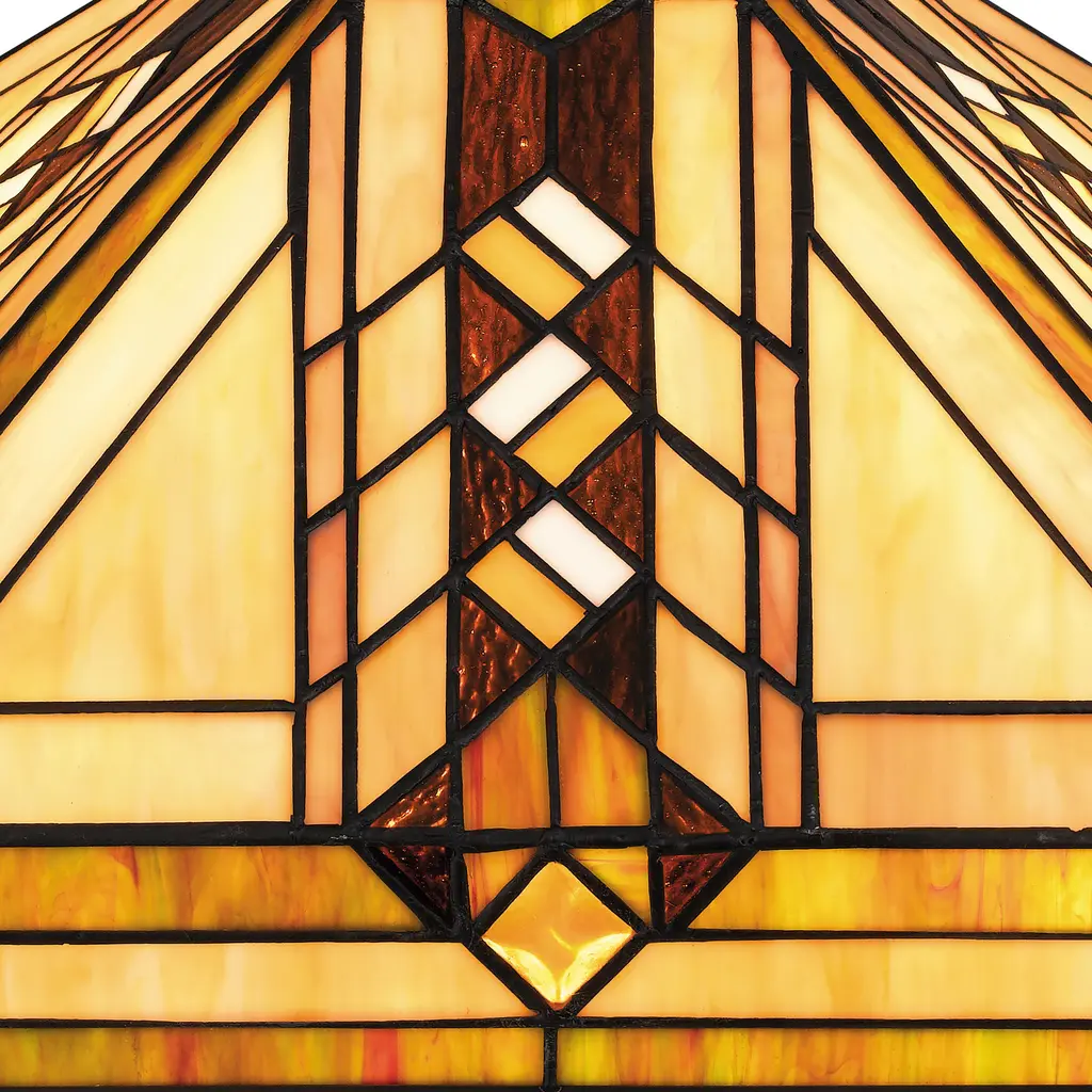 With its matte black finish and classic Arts and Crafts inspired design, the Yellowstone table lamp delivers on both style and function. The geometric shade is made of handcrafted Tiffany glass in shades of cream, warm honey amber, and crimson. The individual glass pieces are hand assembled and carefully arranged in a unique pattern, making Yellowstone a versatile piece in any living room, kitchen, or home office.