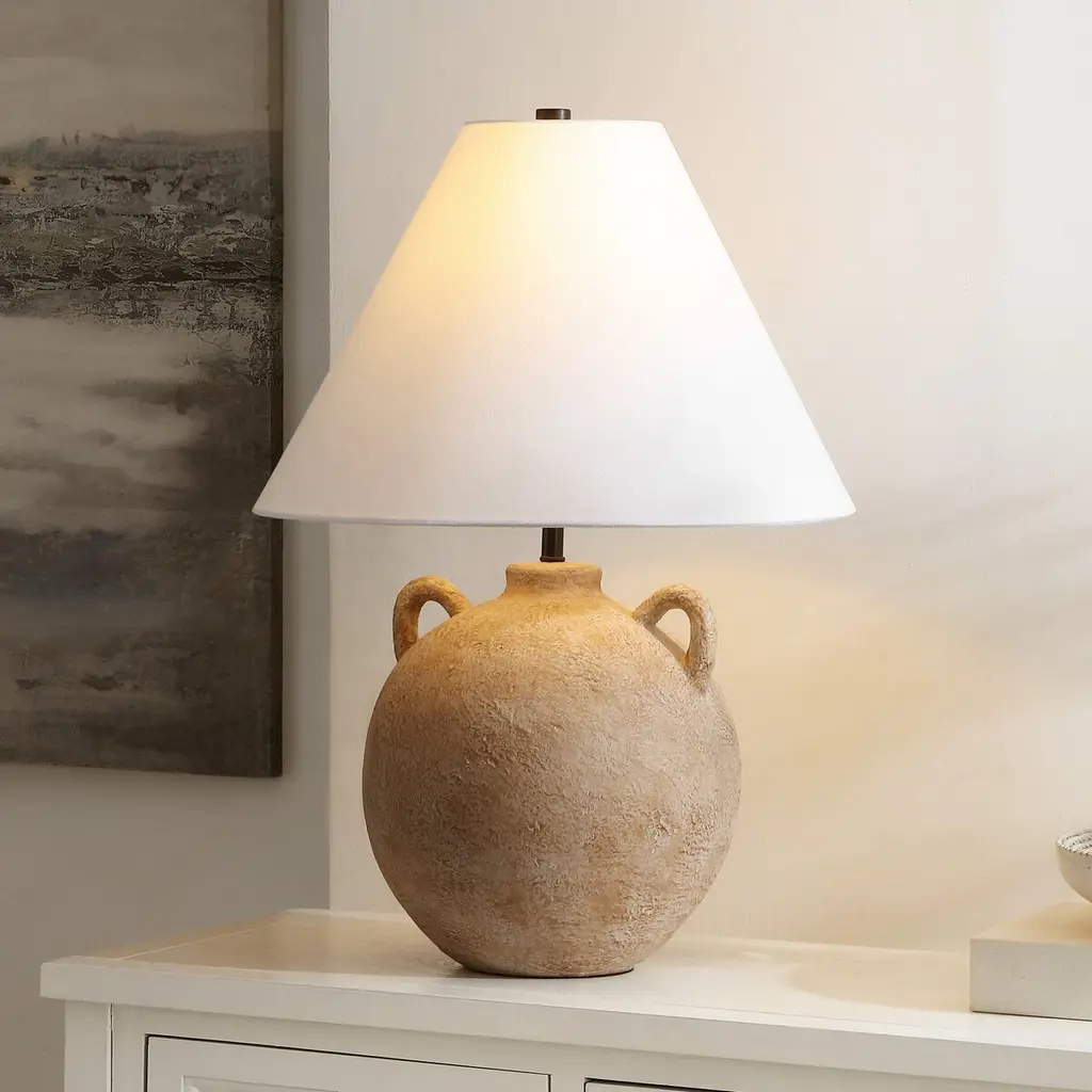 Introducing the Yenna Table Lamp, an artful addition that showcases balance and presence. Its distinctive body is fashioned from ceramic, flaunting a gorgeous finish that exudes a sense of subtle sophistication. This finish not only brings a touch of serene elegance to any room but also harmonizes with different interior palettes. Cradling the light, its crisp shade crowns the lamp, casting an ambient glow that is both soft and ample for your lighting needs.