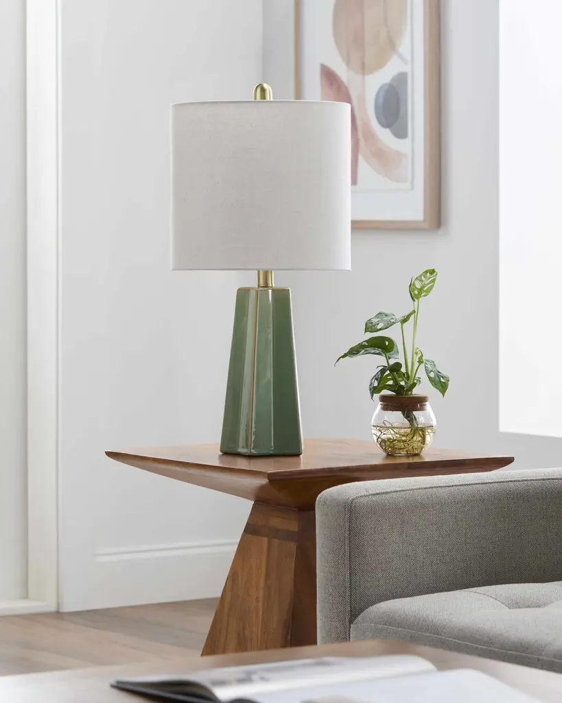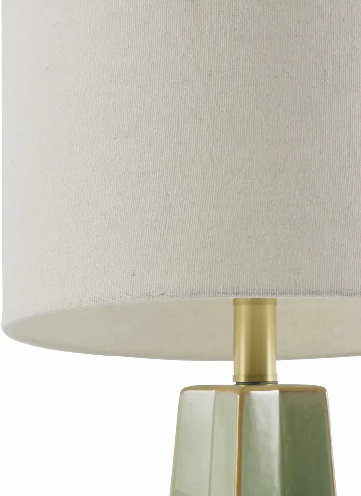 Collection: Yubileyny Colors: Lime Green, Cream, White, Metallic - Brass, Translucent Material: Body: Ceramic / Shade (Outside): Linen / Shade (Inside): Polystyrene / Finial: Iron Styles: Contemporary Made In: China Lighting Type: Accent Table Lighting Shade Material: Linen, Polystyrene Shade Color: White, Cream Cord Length: 6' Switch Type: On/Off Number of Bulbs: 1 Socket Type: E-26 Bulb Wattage: 60W