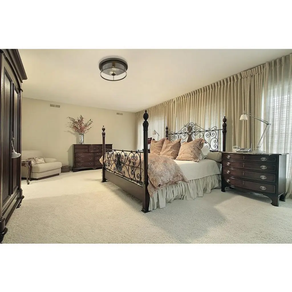 Industrial influences meet chic style in this mid-century modern two-light flush mount. A rustic western bronze finish emphasizes the simplicity of the clear glass small cylinder shade. Room Recommendation: Bedroom/Dining Room/Foyer/Hallway/Kids Room/Kitchen/Living Room/Office/Utility Room Dimmable: Yes Shade Included: Yes Material: Steel, Finish Color: Bronze, Width: 11", Height: 5", Hanging Method: Flush, Lamping Type: Incandescent, Number Of Bulbs: 2, Wattage: 60 Watts, Dimmable: Yes, Moisture Rating: Damp Rated