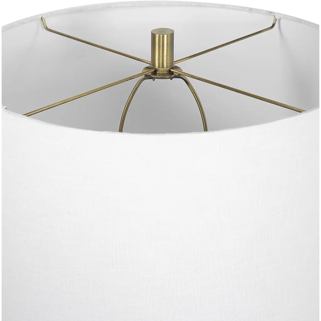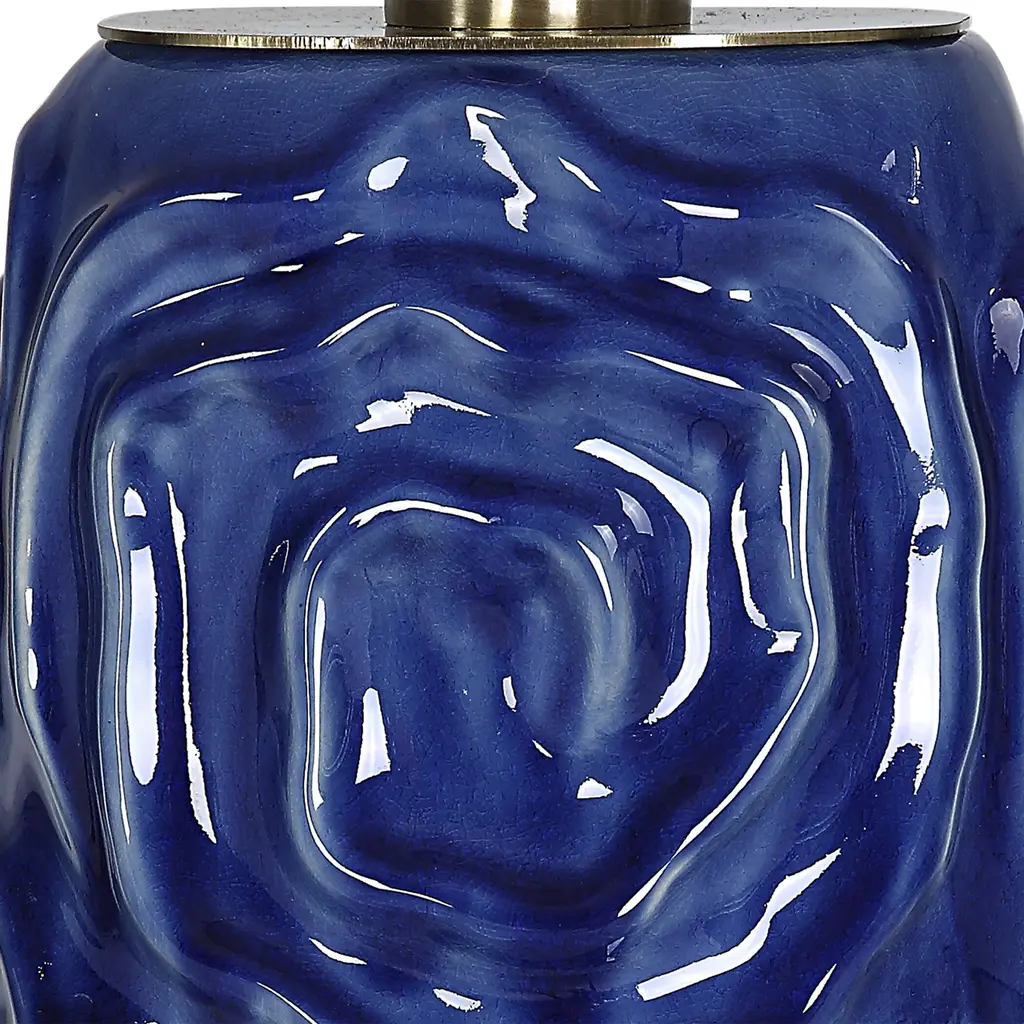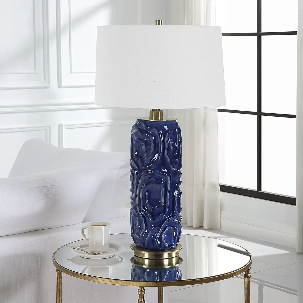 This Ceramic Table Lamp Features A Geometric Patterned Design That's Finished In A Lightly Distressed Blue Glaze, Accented With Plated Antique Brass Details. The Tapered Drum Shade Is A White Linen Fabric With Natural Slubbing. Due To The Nature Of Fired Glazes On Ceramic Lamps, Finishes Will Vary Slightly.
