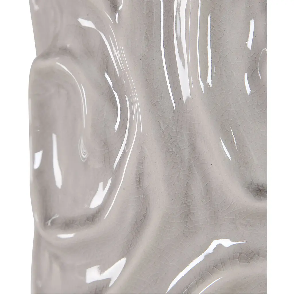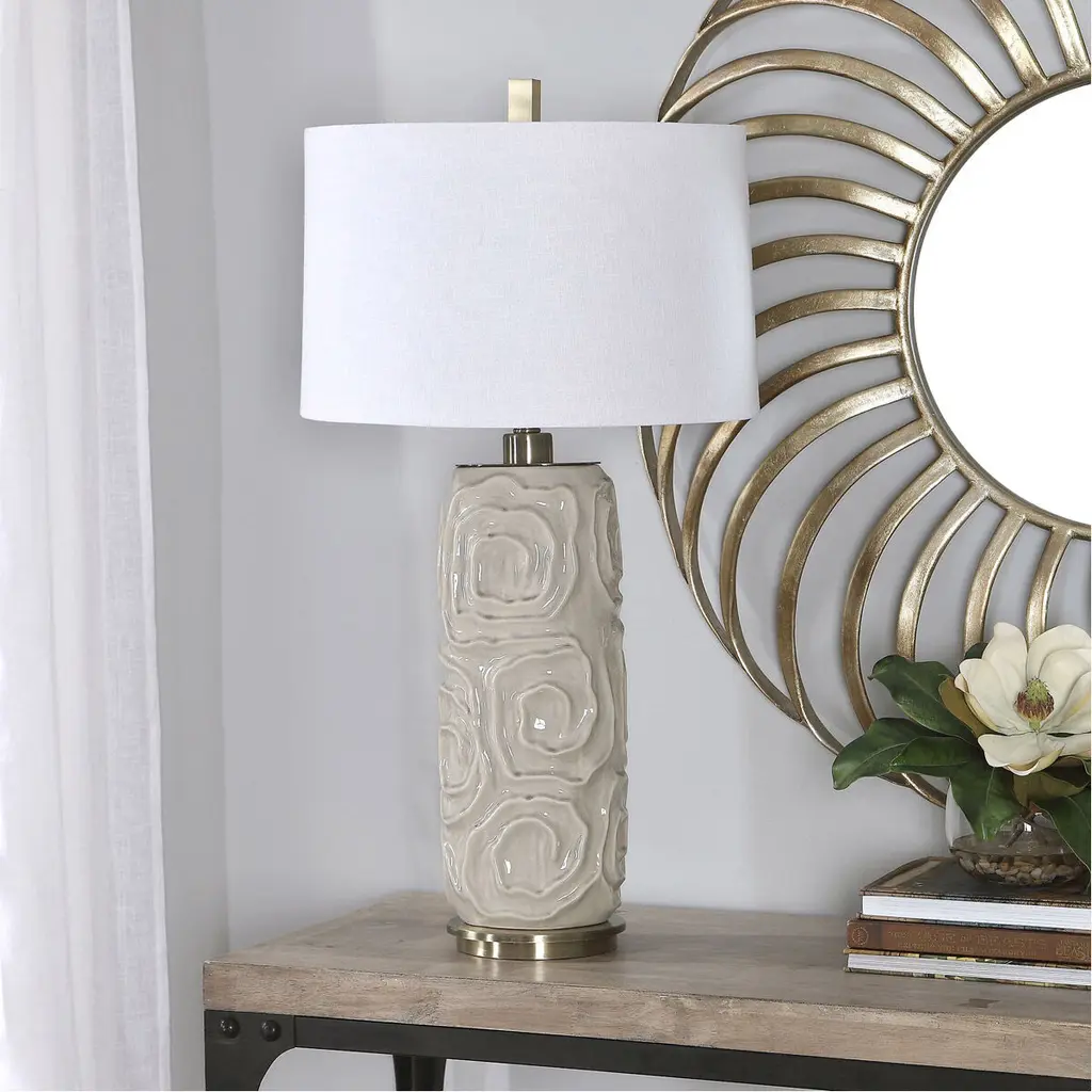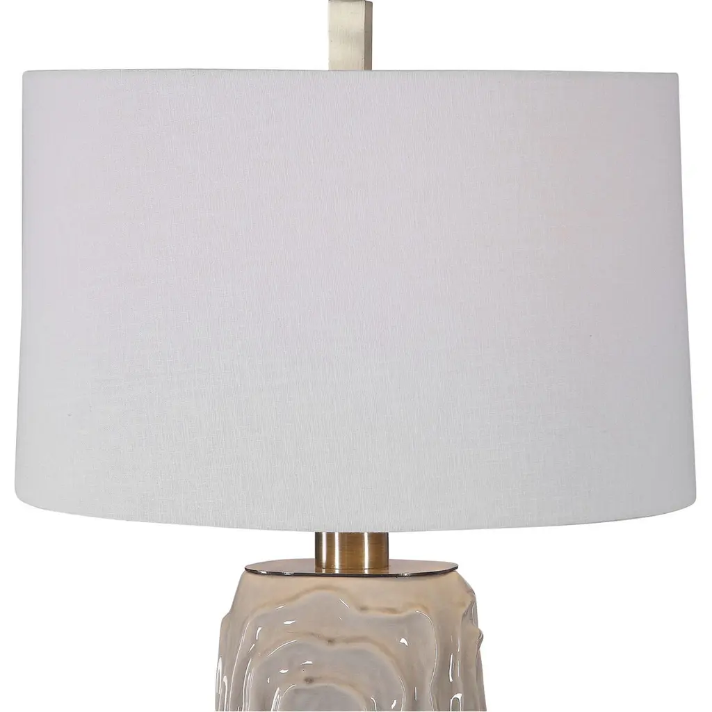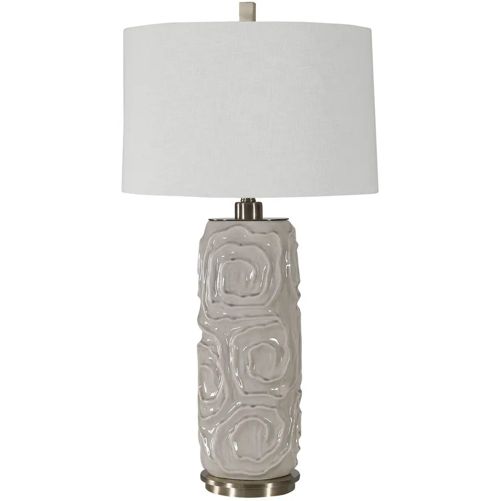 This Ceramic Table Lamp Features A Geometric Patterned Design And Is Finished In A Light Warm Gray Crackled Glaze, Accented With Brushed Nickel Hardware. The Tapered Drum Shade Is A White Linen Fabric With Natural Slubbing. Due To The Nature Of Fired Glazes On Ceramic Lamps, Finishes Will Vary Slightly.