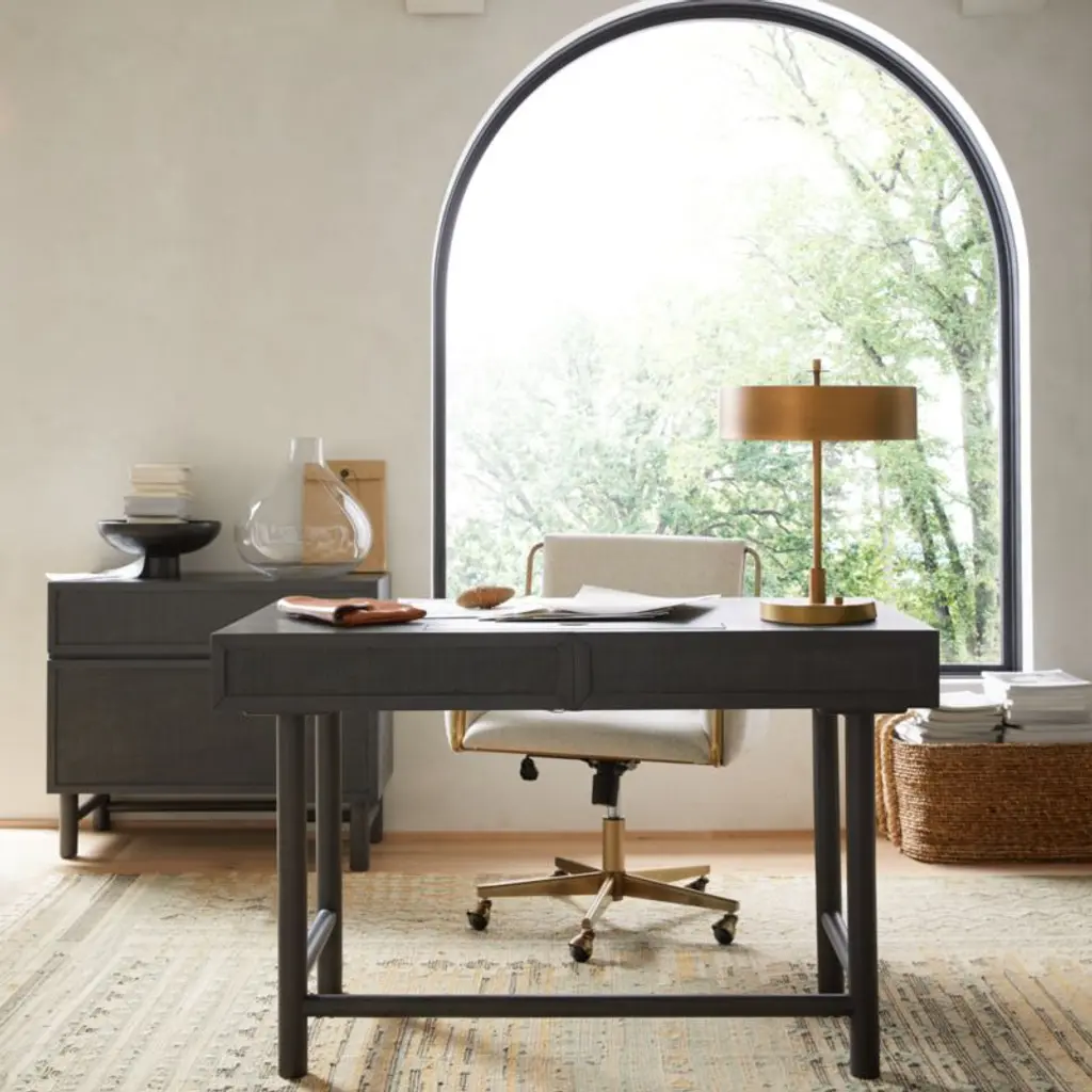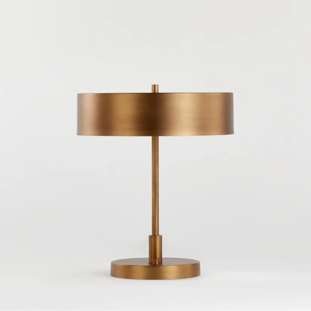 Inspired by the Prairie style of architecture and decor, our Zain table lamp with USB port shapes perfectly balanced lines and curves, horizontals and verticals in gleaming brass. The lamp casts a lovely glow on the steel lamp's antique brass finish. Featuring a USB port in the bases for convenient charging, our Zain table lamp is a Crate & Barrel exclusive.