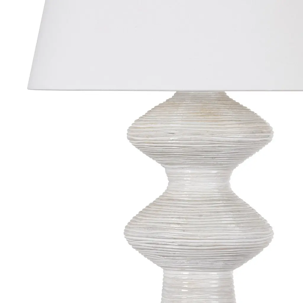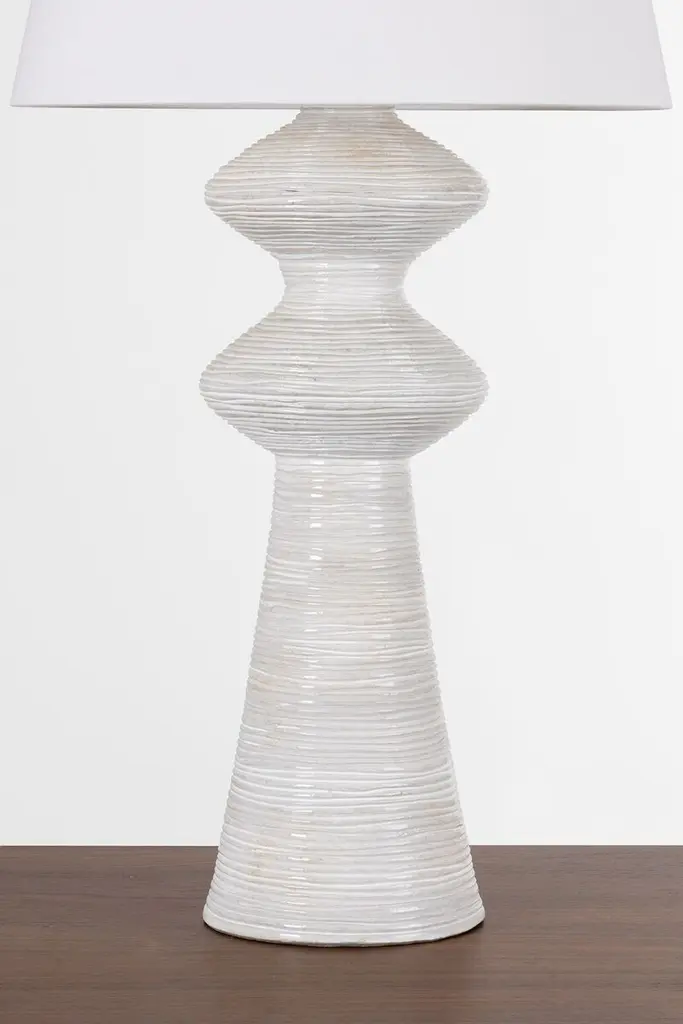 Defined by soft curves and raw materiality, Zayd makes an artful and dynamic statement on a table or console. Its sculpted base is accented by shallow ridges that enhance the textural qualities of the ceramic. Topped with a linen shade and complemented by hardware, this table lamp presents a fresh, modern attitude.