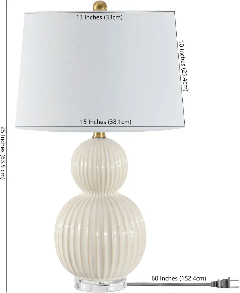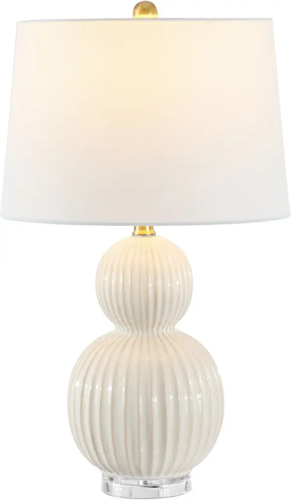 The glossy finish accentuates the fluted detailing of this ceramic gourd lamp. The golden finial and the snowy cotton shade heighten the elegance.