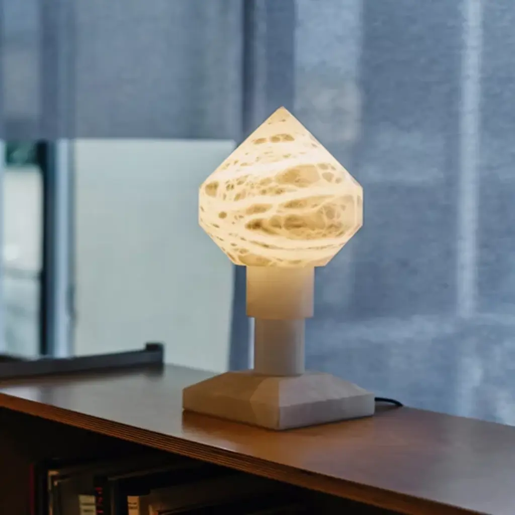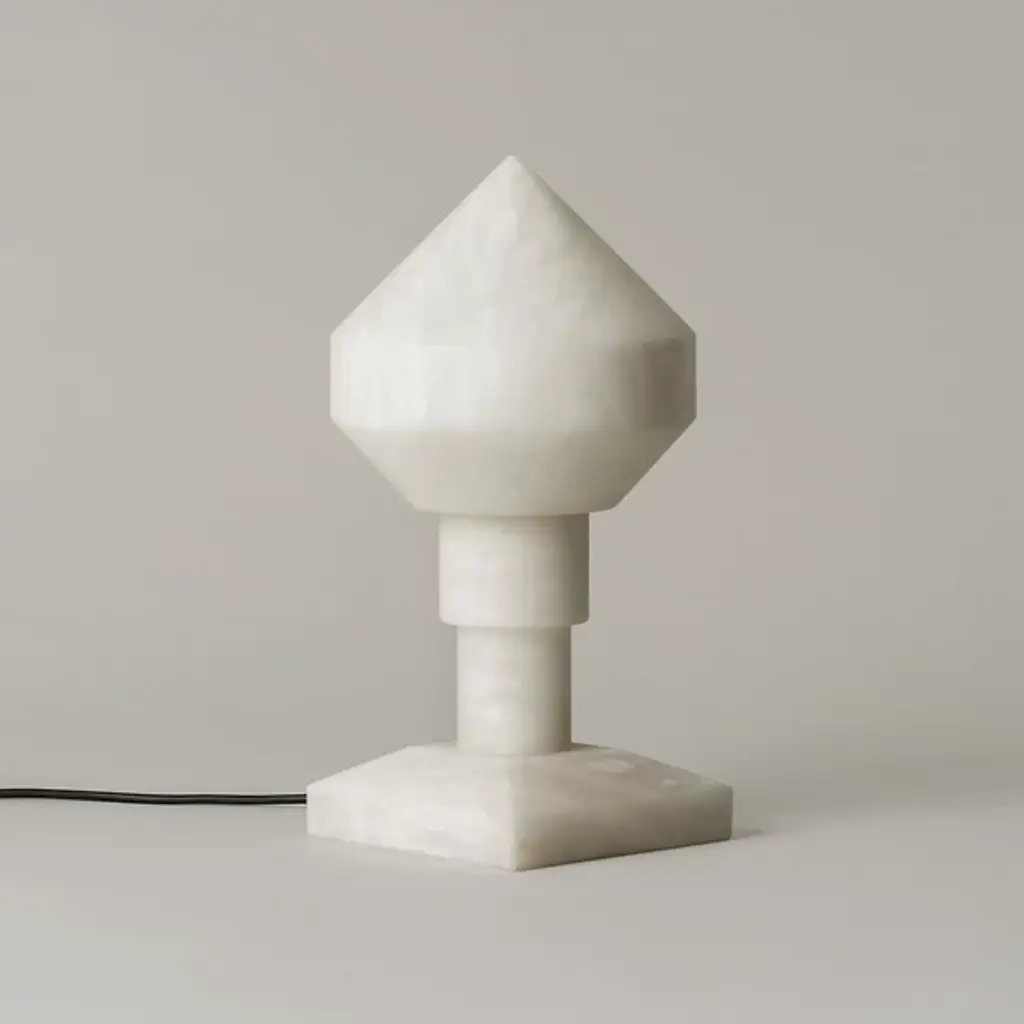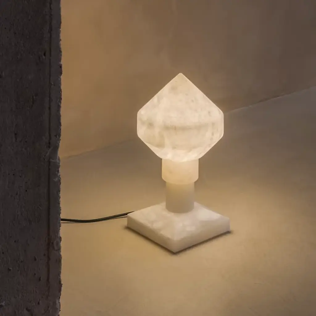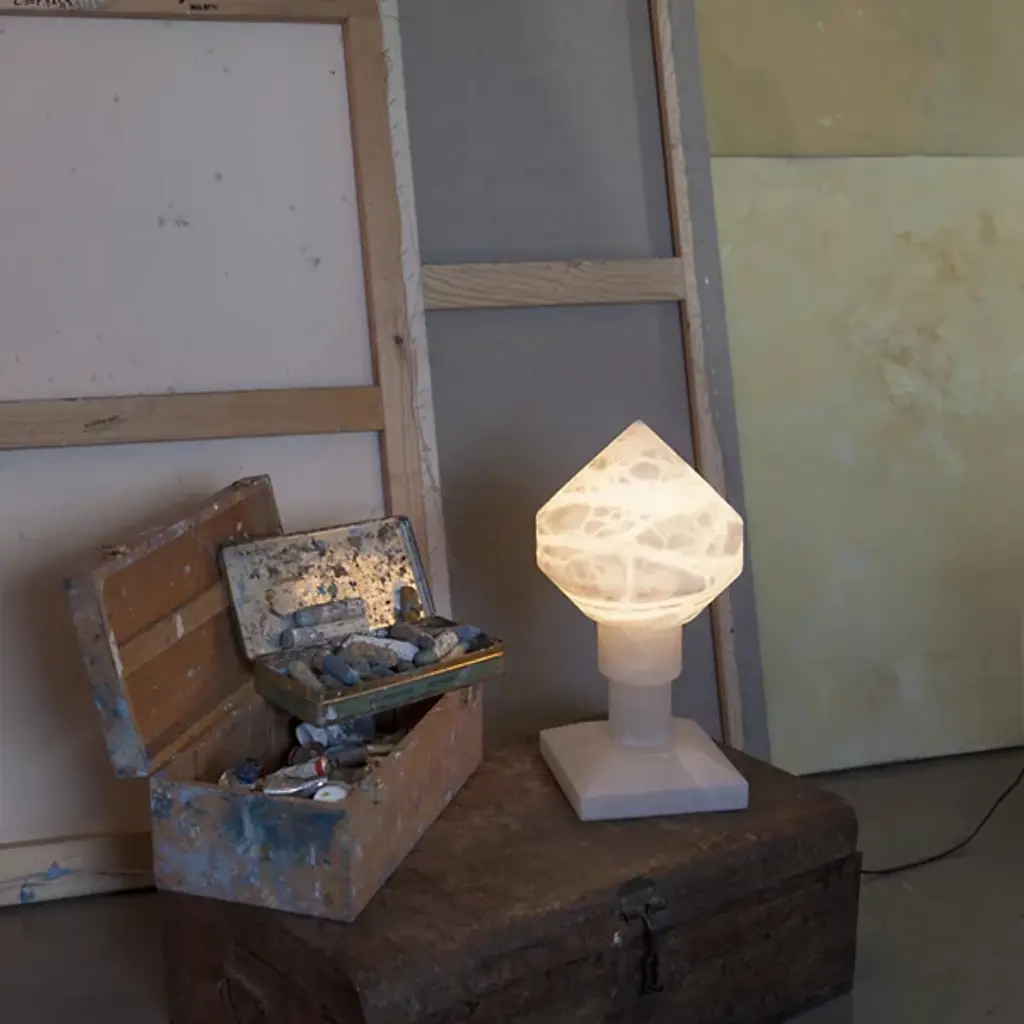 Designed in 1969, the Zeleste Table Lamps from Santa & Cole is a bedazzling object, drawing its intricate facets from Art Deco design. Multi-disciplinary artist Angel Jove’s work is informed by a sense of freedom. This lamp recalls Barcelona architecture through a beveled base and a towering cylindrical column. The pointy element topping the piece suggests a hand-cut jewel. Together with the shapes below, this Art Deco style form awes with natural alabaster texture. Warm light filters through the shapes to create an exciting silhouette of veiny accents. This light creates a lively ambiance.