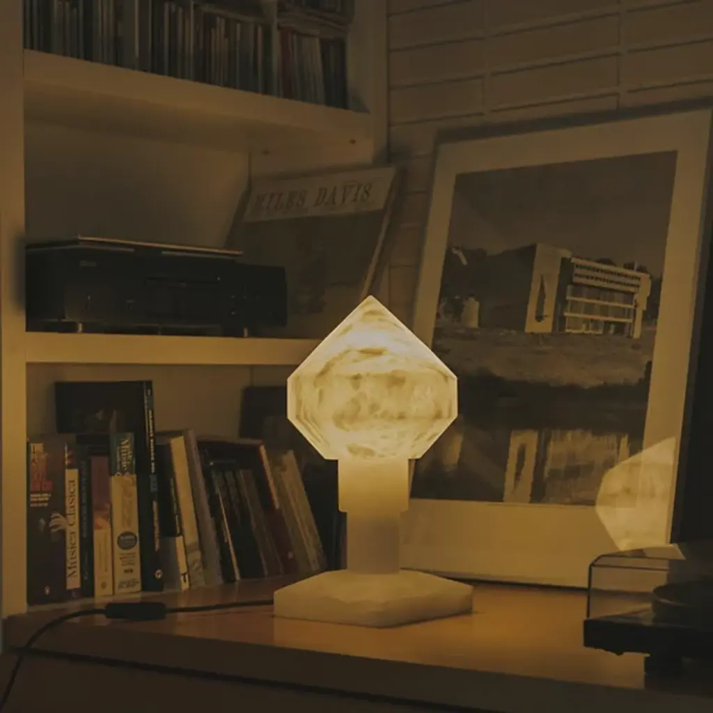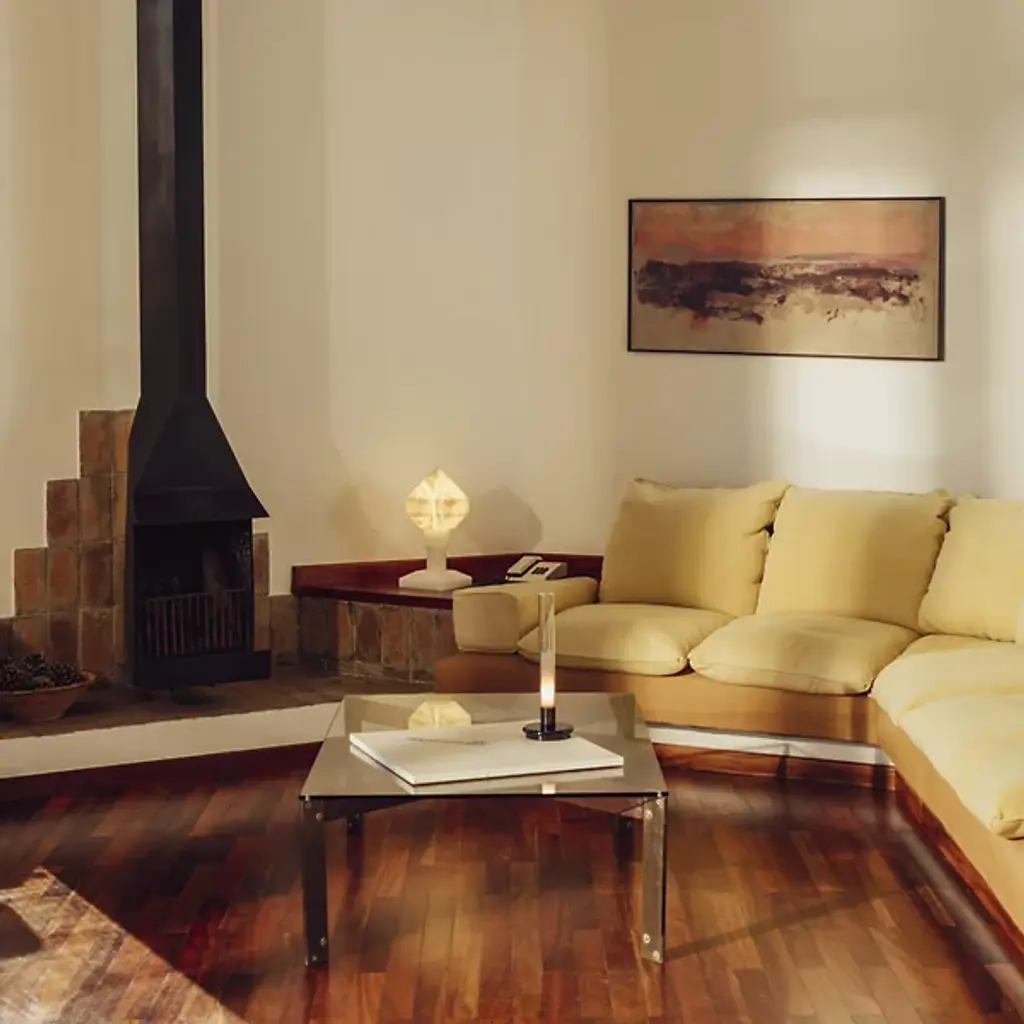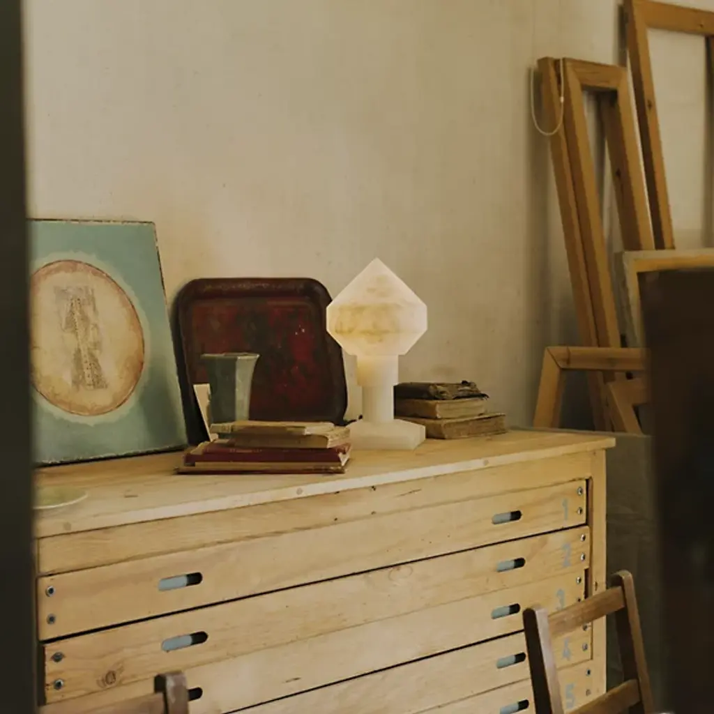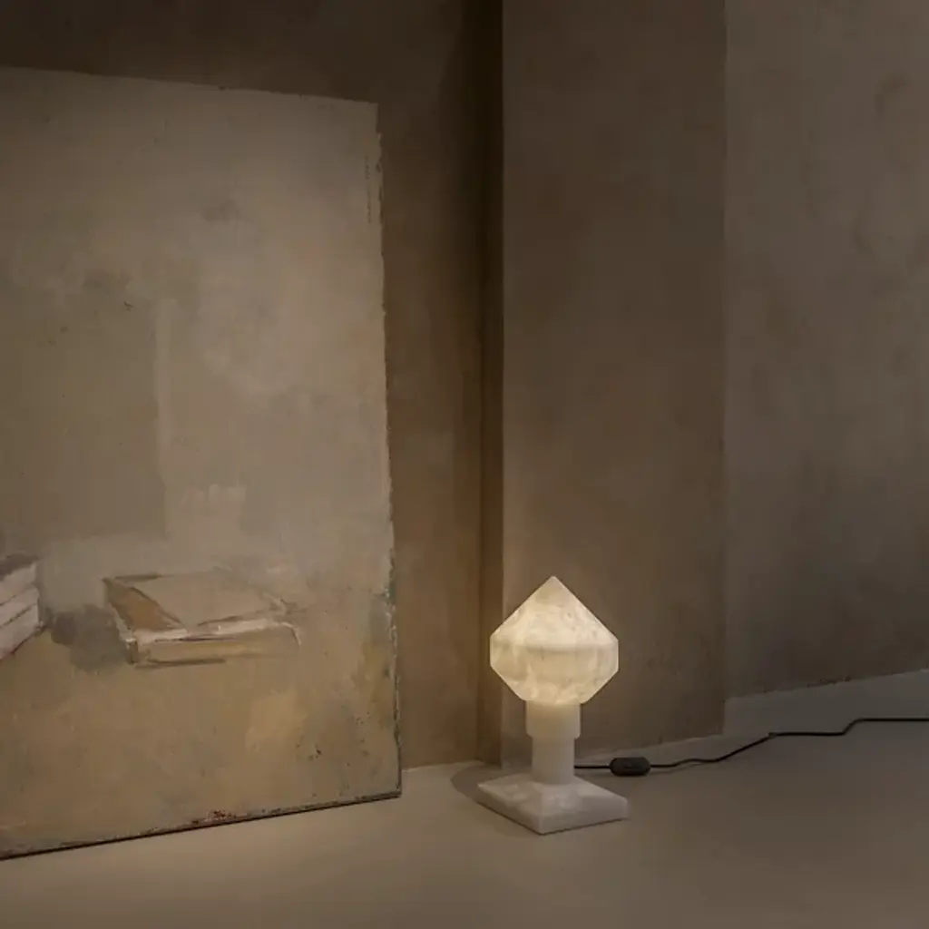 Designed in 1969, the Zeleste Table Lamps from Santa & Cole is a bedazzling object, drawing its intricate facets from Art Deco design. Multi-disciplinary artist Angel Jove’s work is informed by a sense of freedom. This lamp recalls Barcelona architecture through a beveled base and a towering cylindrical column. The pointy element topping the piece suggests a hand-cut jewel. Together with the shapes below, this Art Deco style form awes with natural alabaster texture. Warm light filters through the shapes to create an exciting silhouette of veiny accents. This light creates a lively ambiance.
