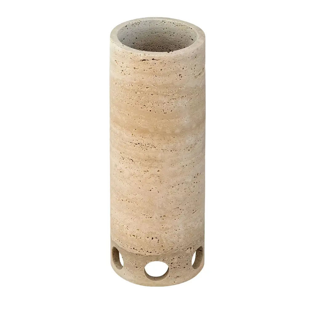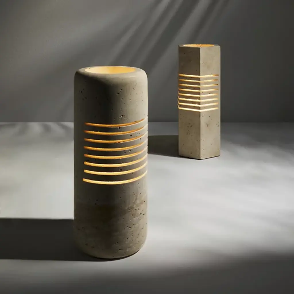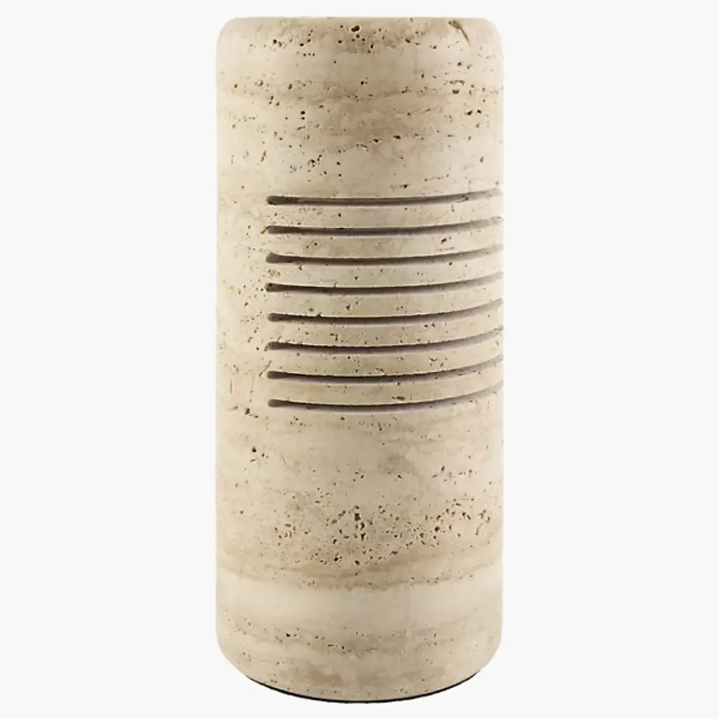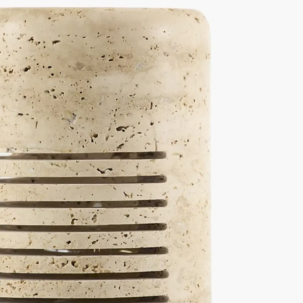 The Zelie Table Lamp from Surya reveals unique mineral variations inherent to travertine, ensuring no two pieces are identical. Natural travertine forms the entire lamp body with its characteristic porous texture and subtle linear striations. Horizontal slots cut into the cylindrical form allow light to escape in precise bands, creating a rhythmic interplay between illumination and solid material. A practical rocker switch on the cord allows for easy operation without disturbing the lamp's pure geometric form. This piece exemplifies how restraint in design often yields the most powerful impact.