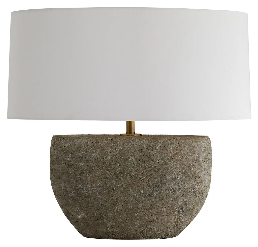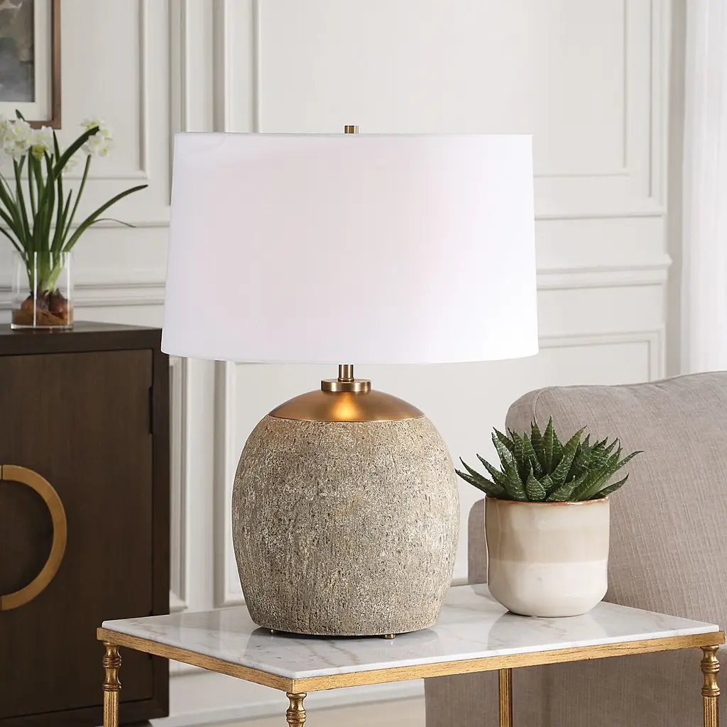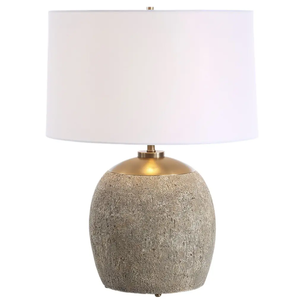 The Zeraphine Table Lamp exudes a refined rustic charm, seamlessly blending into any space with its exquisite design. Crafted from heavily textured concrete, it features elegant antique brass plated accents that enhance its sophisticated appeal. The lamp is topped with a slightly tapered round hardback shade in a casual white linen fabric, adding a touch of understated elegance to its overall aesthetic. Perfect for those who appreciate a harmonious blend of rustic and refined elements in their decor.